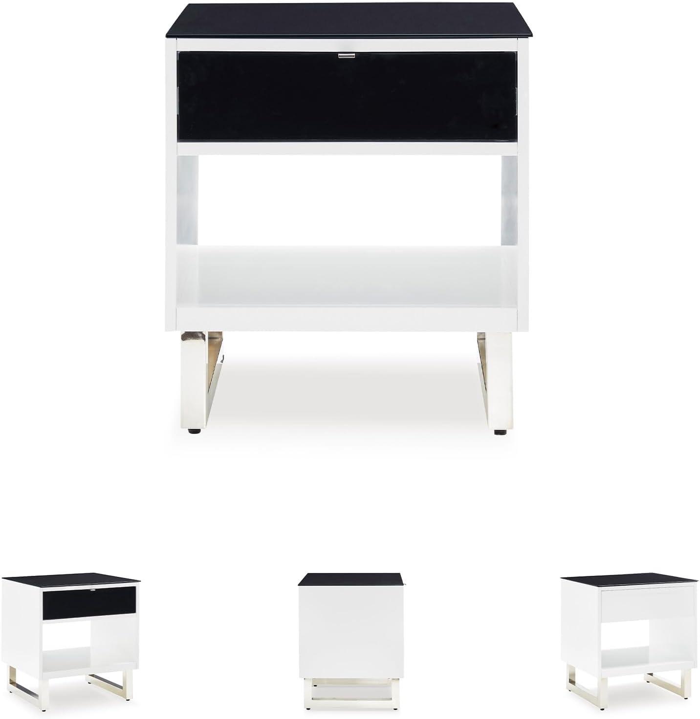 HANDSOMELY CRAFTED: Made with MDF substrates in a high-gloss white finish. Black glass top; black acrylic laminate drawer front. Includes smooth-gliding drawer, open shelf & chrome-tone finished legs