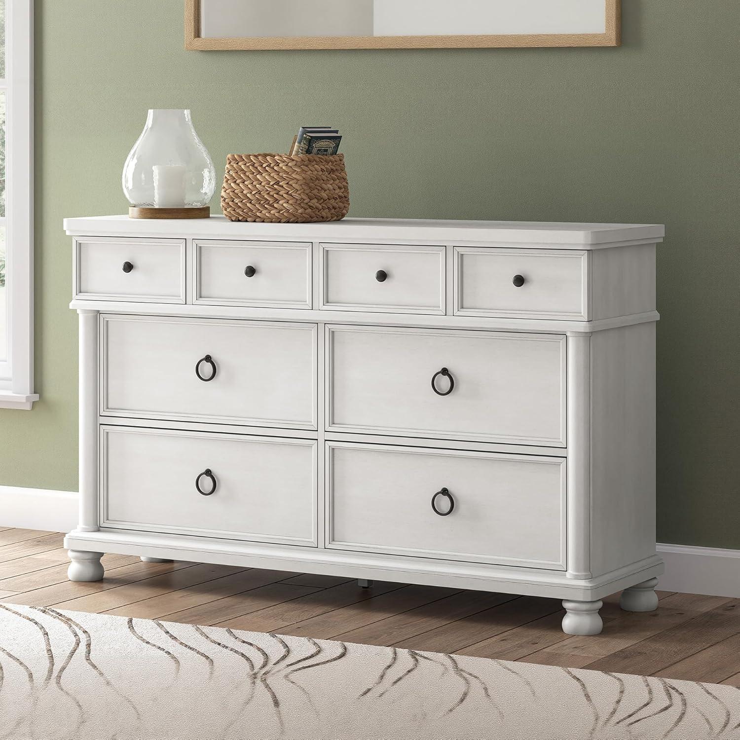 TRADITIONAL DRESSER: Casual yet traditional, this artfully crafted dresser combines classic elements with a clean modern approach. Its antiqued white finish exudes a comfy, timeless appeal that's sure to carry you away to a dreamy time and place