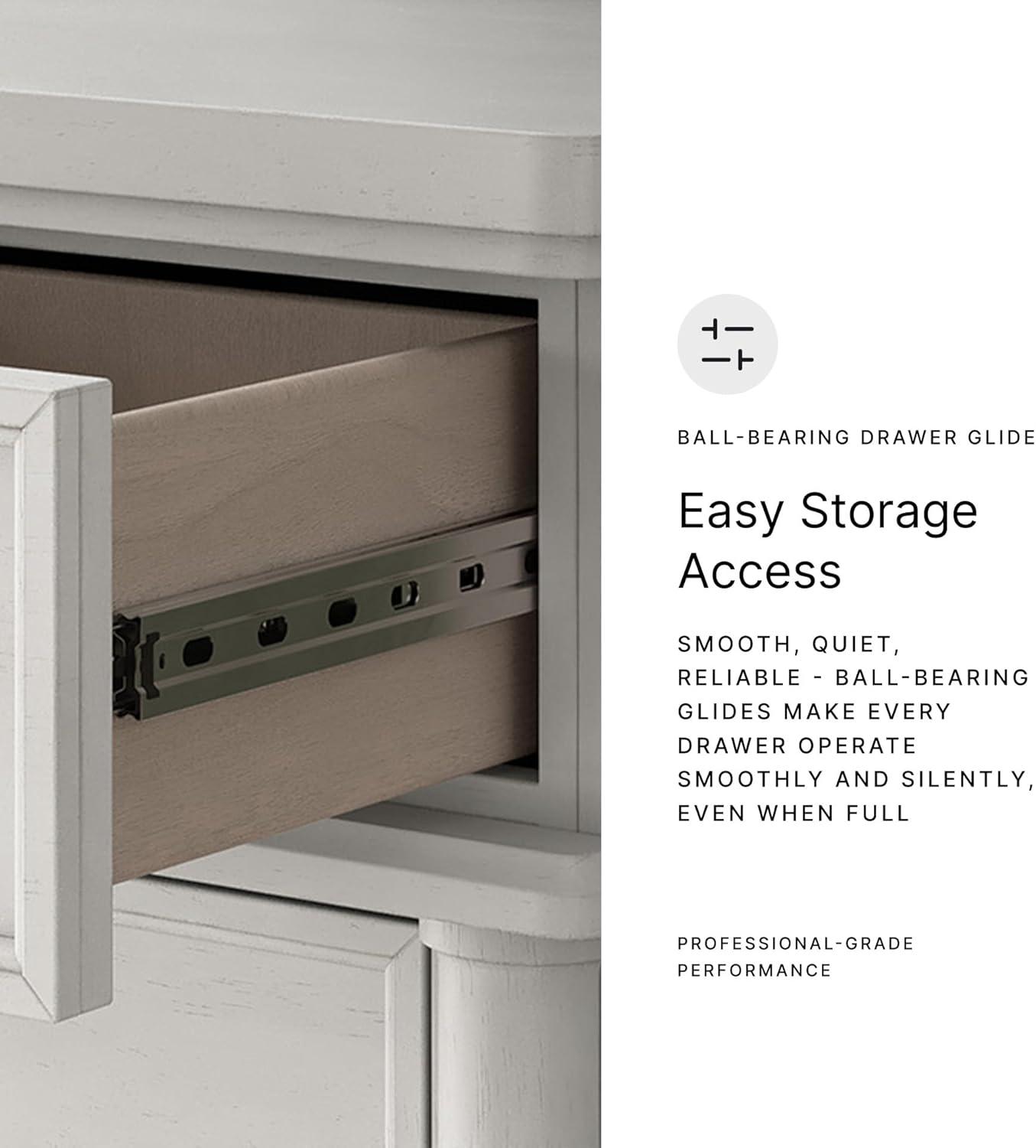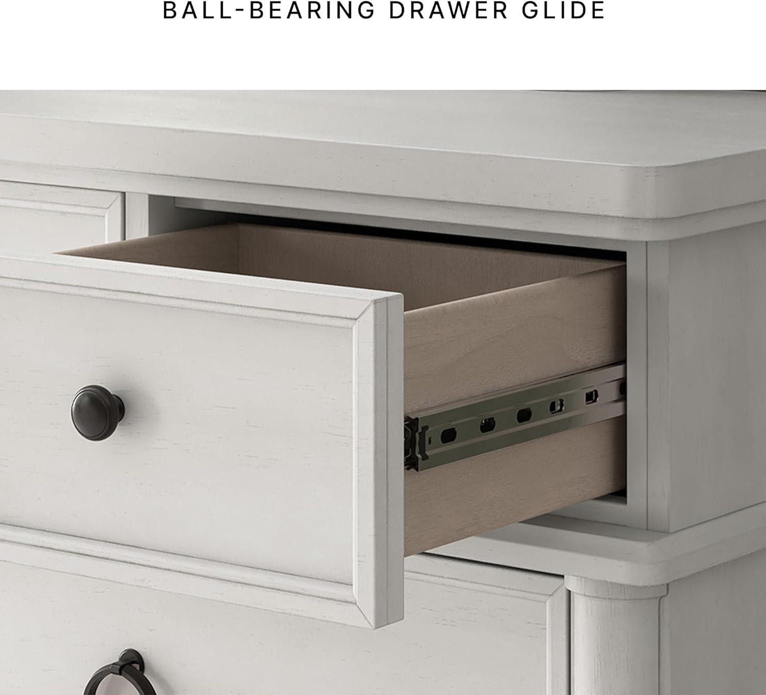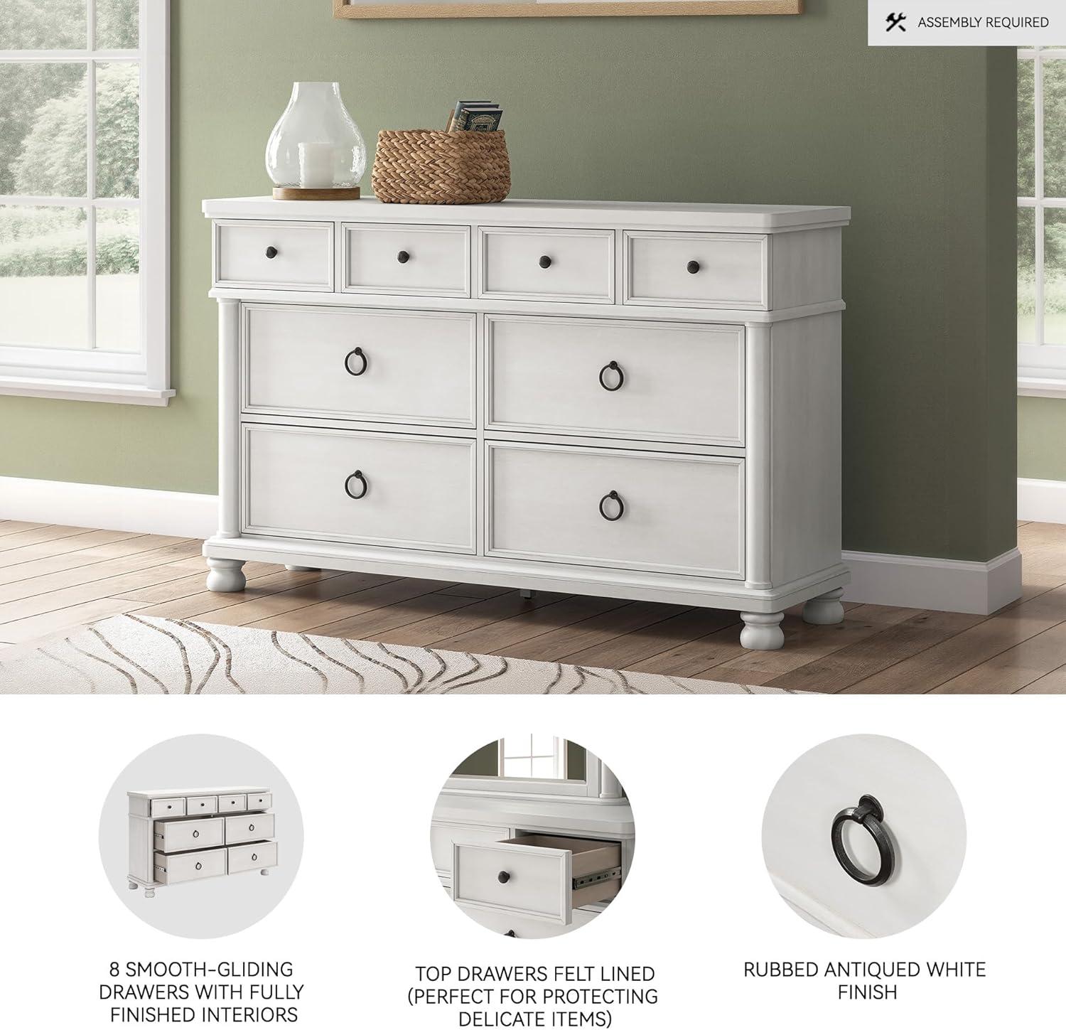QUALITY MADE: Made of hardwood solids, veneers & MDF substrates. Rubbed antiqued white finish. Pewter-tone metal hardware. 8 smooth-gliding drawers with French/English dovetail construction & ball-bearing side glides; top drawers felt lined