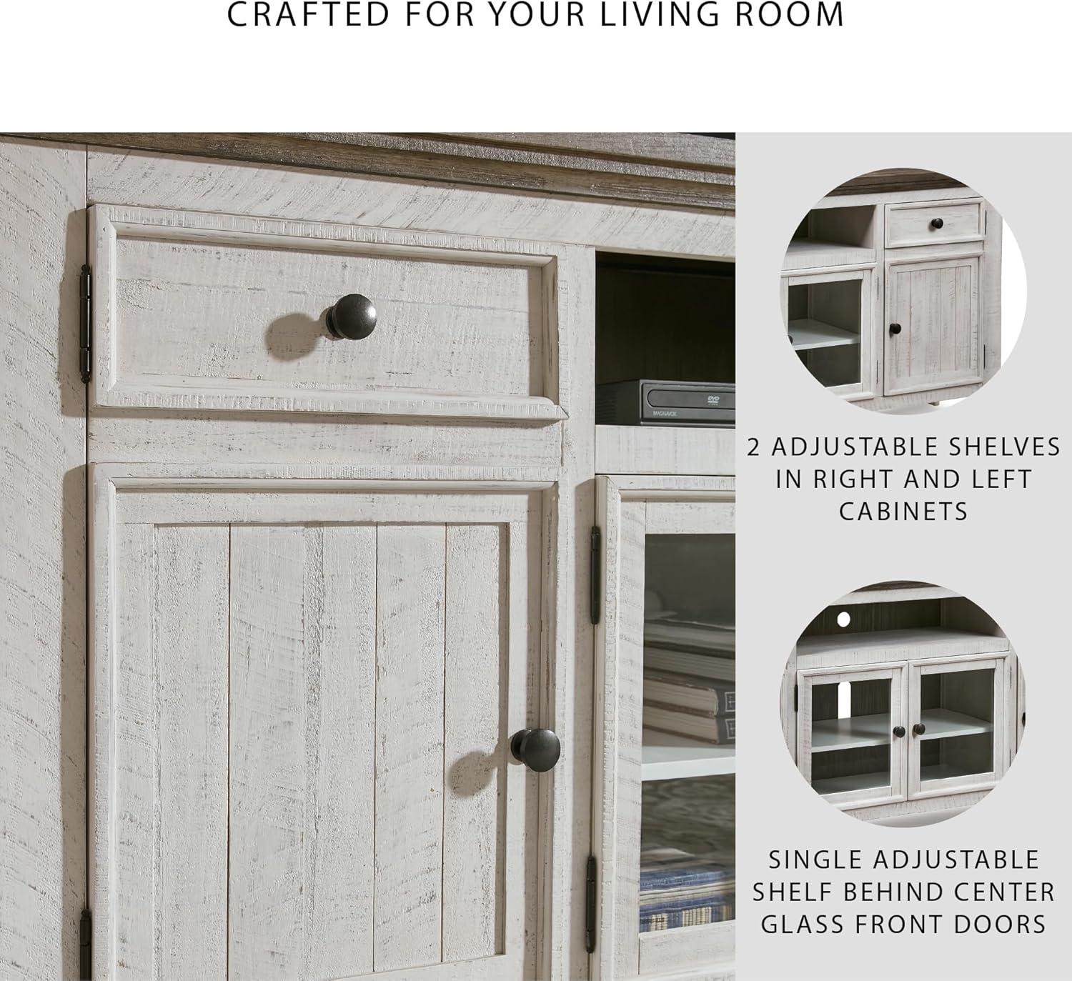 Have your fill of modern farmhouse style with this TV stand. Its distressed two-tone finish pairs a vintage white with a weathered gray for a look that’s utterly charming. Right and left cabinets open to reveal adjustable shelving for all your entertainment center storage needs. Center glass doors add to its relaxed appeal. A stylish TV stand can make your entertaining space a cozy place to relax and recharge. Our entertainment centers provide sturdy support for TVs and other electronics while hiding the wires and cords that could clutter your decor. Whether you're looking for mid-century, farmhouse or other styles, our furnishings include display and storage space, with open and closed-door compartments, drawers and adjustable shelving. And we go the extra mile to package, protect and deliver your purchase in a timely manner.