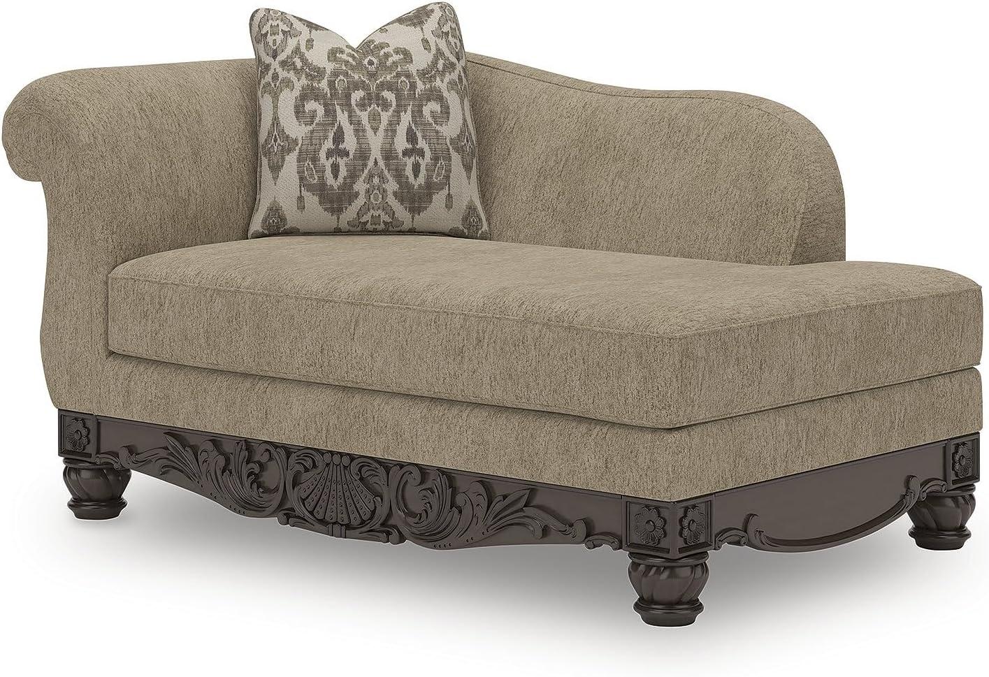 This right-arm facing corner chaise is a gorgeous example of new traditional design. Its graceful profile and plush cushions merge classic flair with modern comfort. Golden high-luster textured upholstery sets the tone for an easy elegant look, while carved details and decorative turned legs make a grand statement. Inspired by then, reinvented for the here and now.
