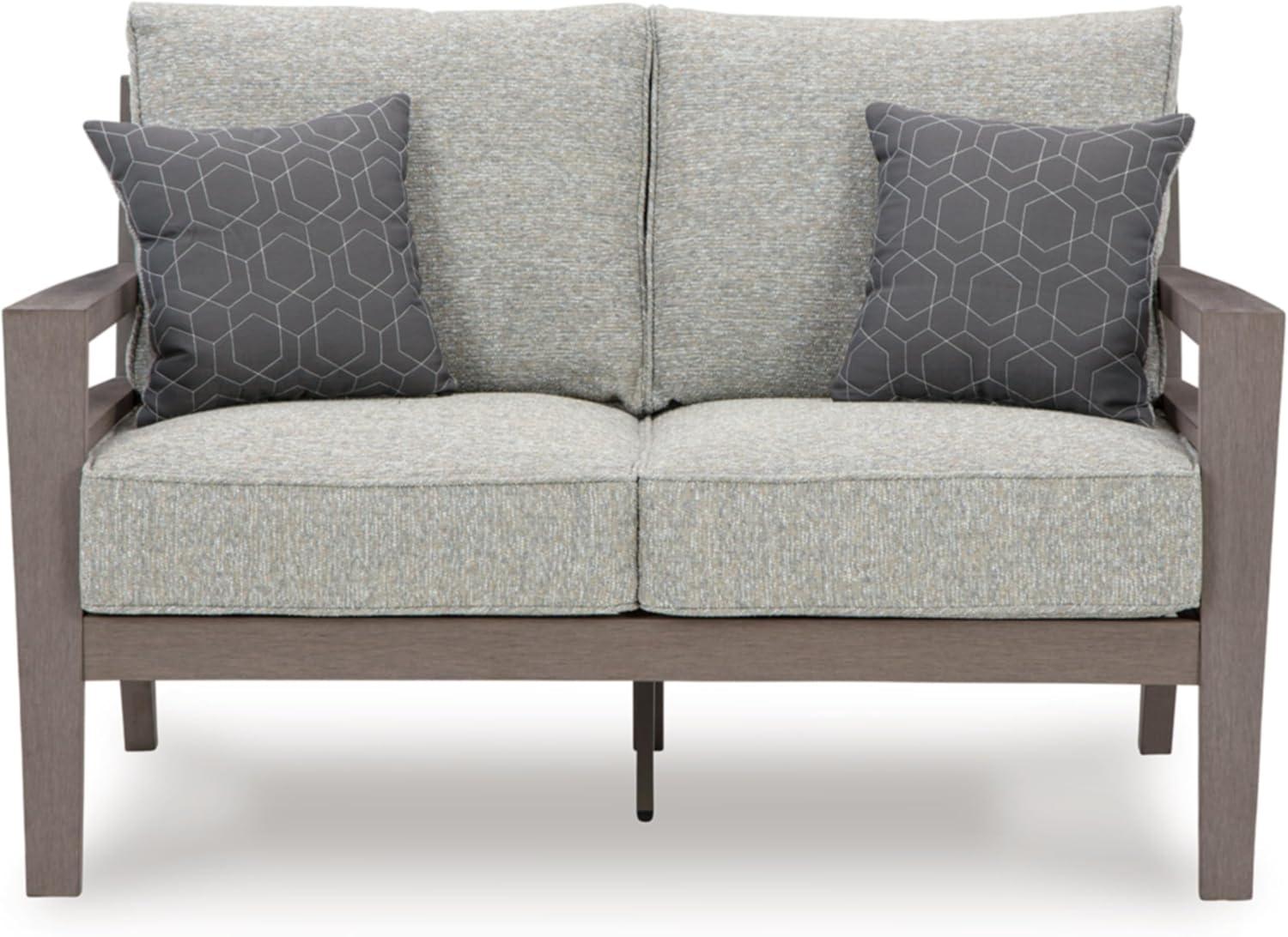 Signature Design by Ashley Hillside Barn Contemporary Nuvella Weather Resistant Fabric Outdoor Loveseat with Cushion and 2 Throw Pillows, Light Brown & Light Gray