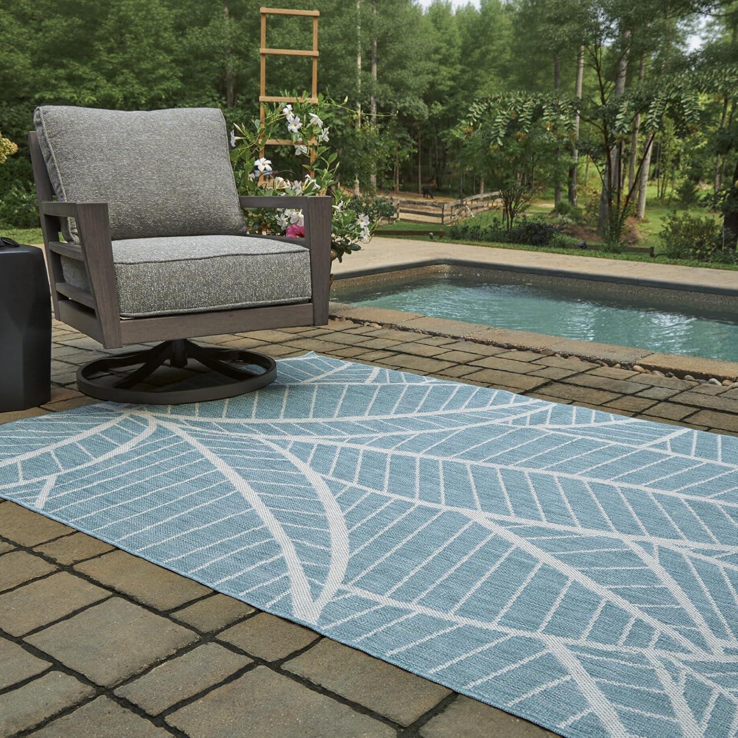 Give your patio, deck or porch an instant makeover with this area rug. Its botanical design features an aqua background with an ivory leaf pattern. This easy-care floor covering is perfect for high-traffic areas, adding a serene vibe to any indoor or outdoor space. Signature Design by Ashley is a registered trademark of Ashley Furniture Industries, Inc.