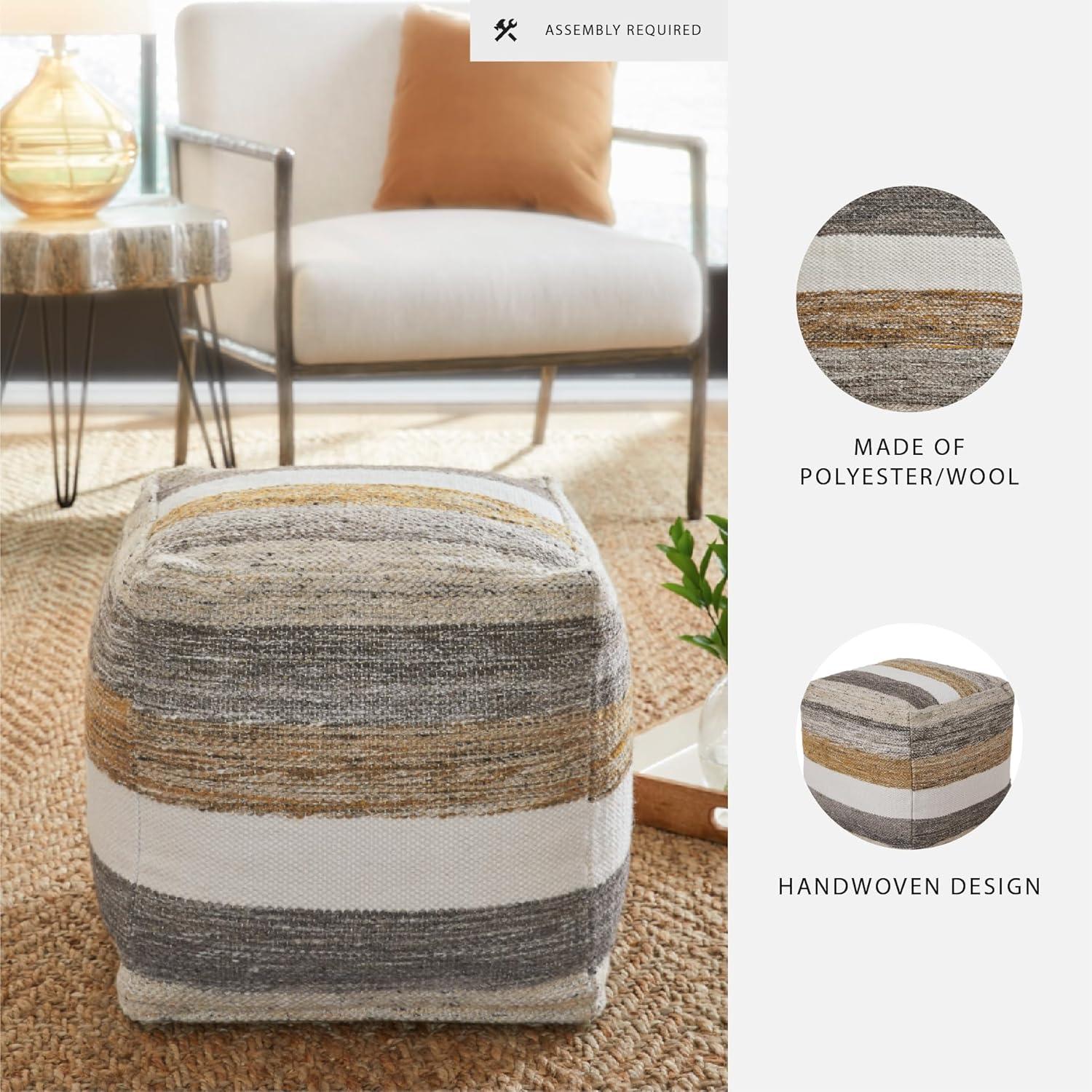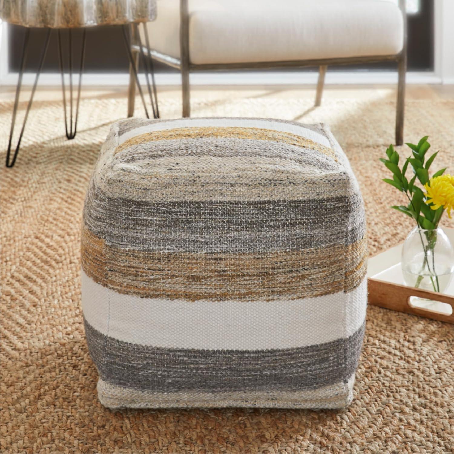 Weaving together stripes in grounded, earthy tones, this pouf is a natural beauty. It combines simple flair and function, with hues of white, honey and shades of gray and brown to keep things casually chic. Whether used as a footrest or a side table, this piece has an undeniably universal appeal. Once a trend and now a decorating staple, poufs are versatile pieces that everyone can experiment with in their home. This workhorse piece has a variety of uses, from extra seating to simply serving as a decorative accent. Find your perfect pouf through our range of special prints and patterns.