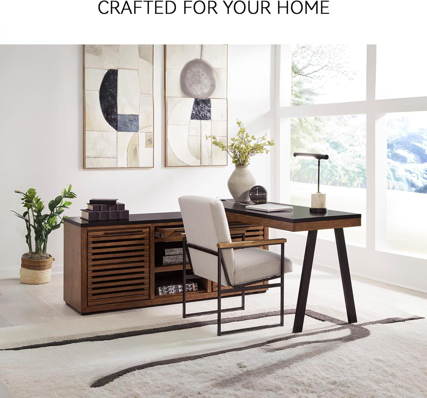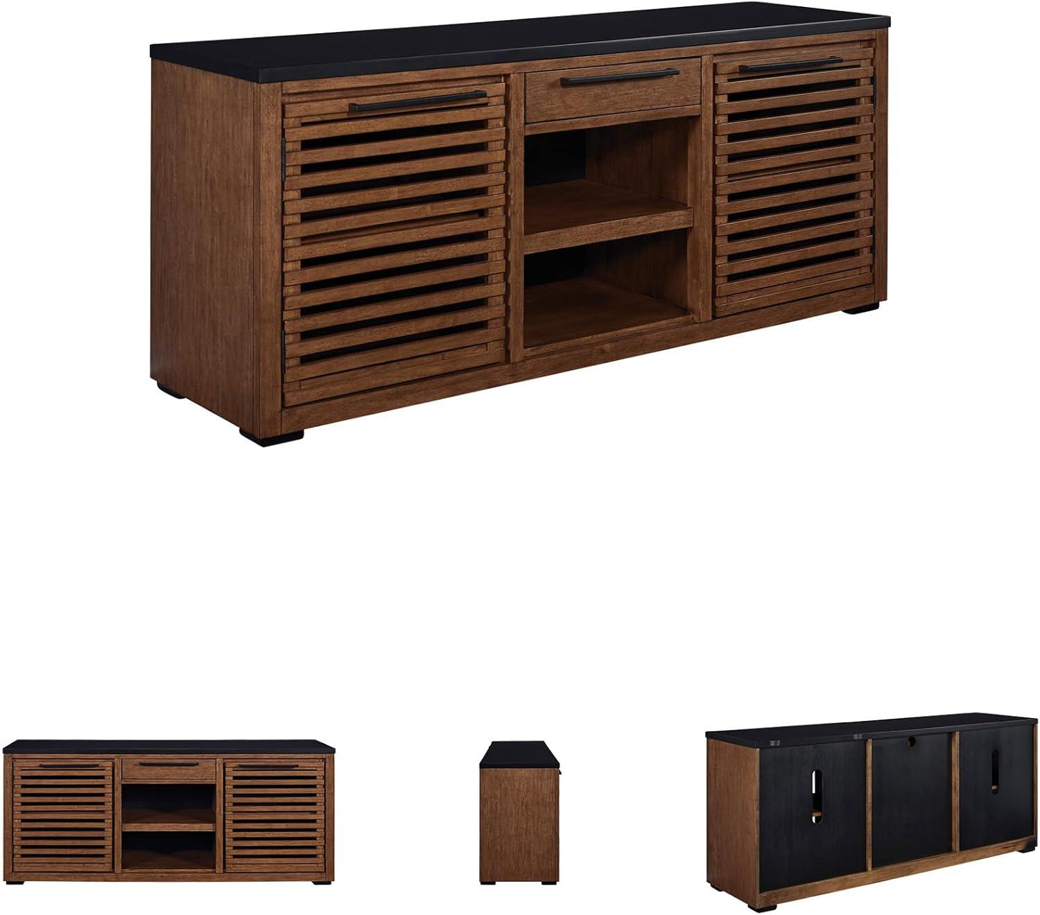 Double down on casual chic with the two-tone look of this credenza. with its warm brown and matte black finishes, it reflects your eye for modern design. The trend-right slatted styling on its doors brings added charm. and with the credenza's adjustable shelves, open storage and accessories drawer, keeping office essentials organized is a breeze.