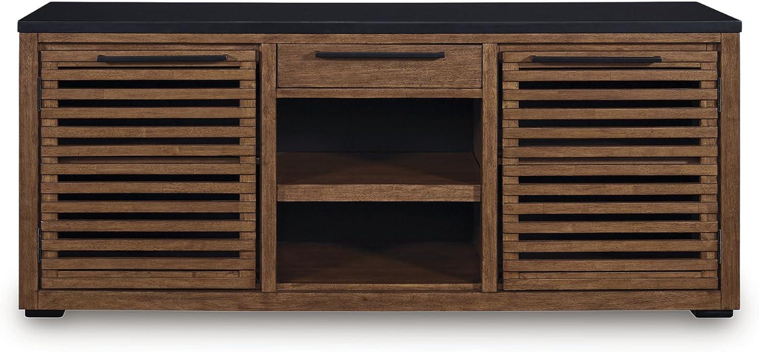 CASUAL CREDENZA: Double down on casual chic with this 2-tone credenza. Its warm brown and matte black finish reflects your modern style. Trend-right slatted doors add charm, while adjustable shelves and a drawer keep office essentials organized