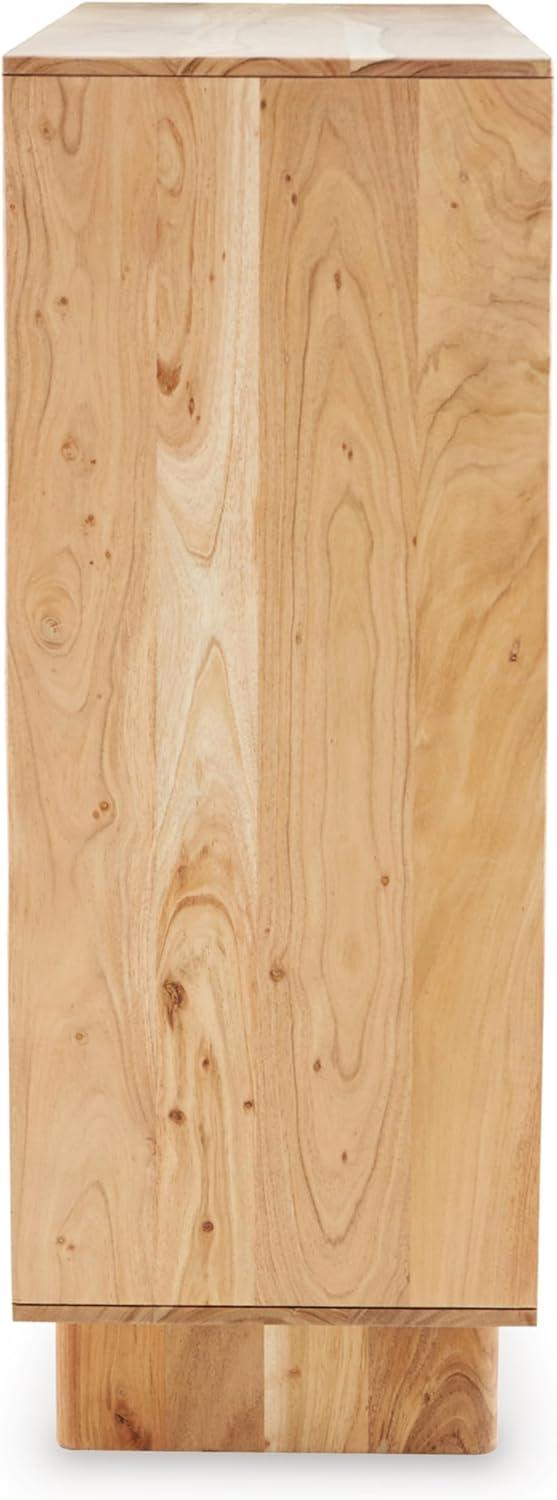 HANDSOMELY CRAFTED: Made of wood, veneer and engineered wood. Natural finish. Metal door pulls. 2 doors with soft-close hinges. 2 adjustable shelves, 3 fixed shelves