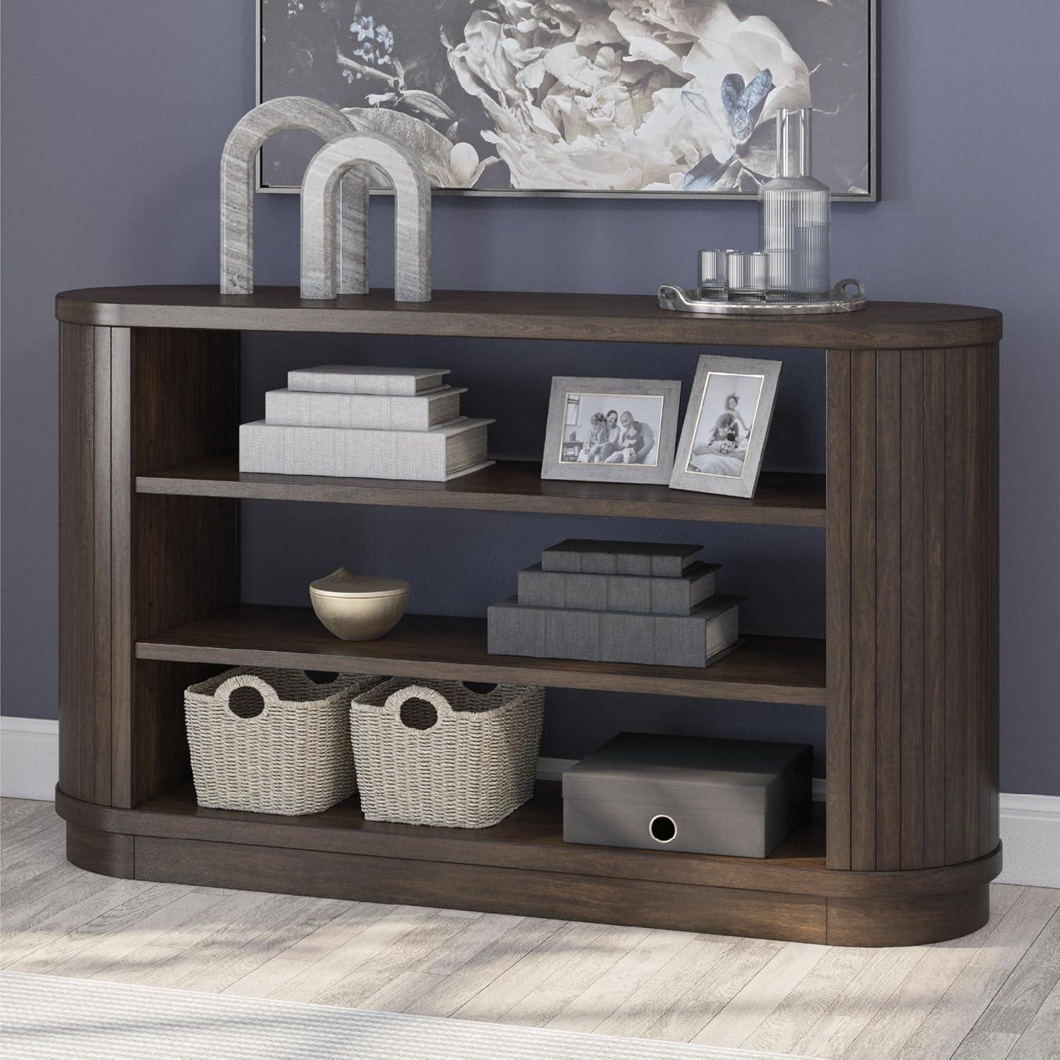 This credenza is perfectly modern in every way. Finished on both sides in a rich wood tone, the bookcase can be floated in a room or used as a divider. Adjustable shelving and open storage deliver a well-organized space for work-from-home professionals. It's a striking study in upscale contemporary form and function.