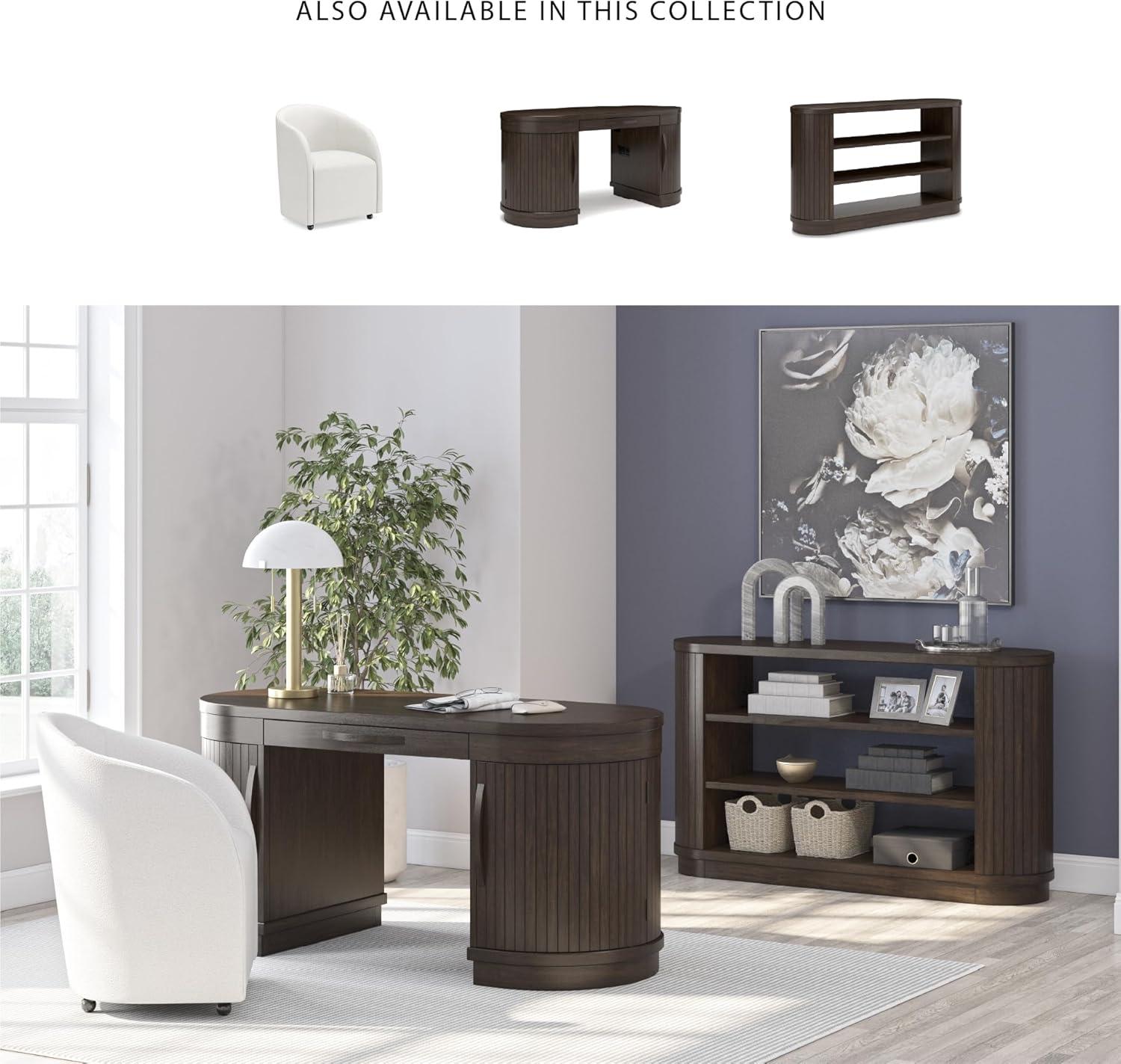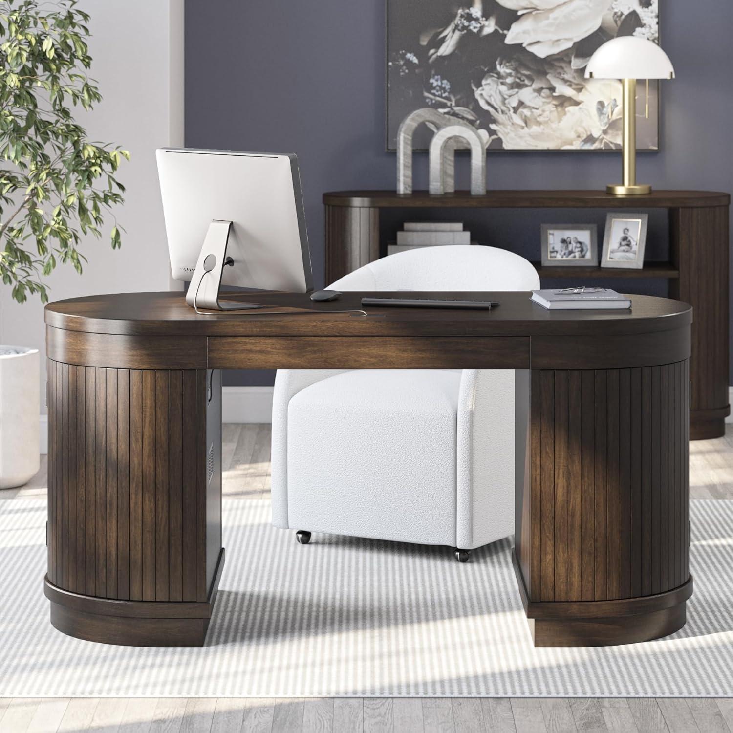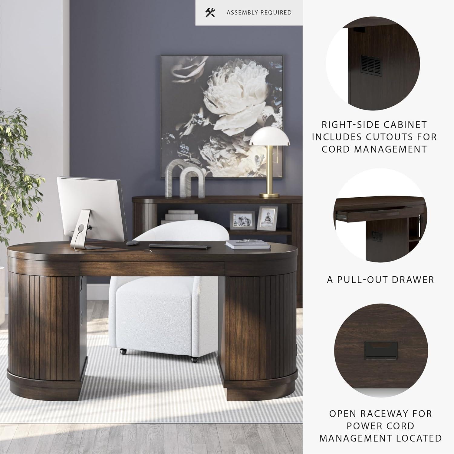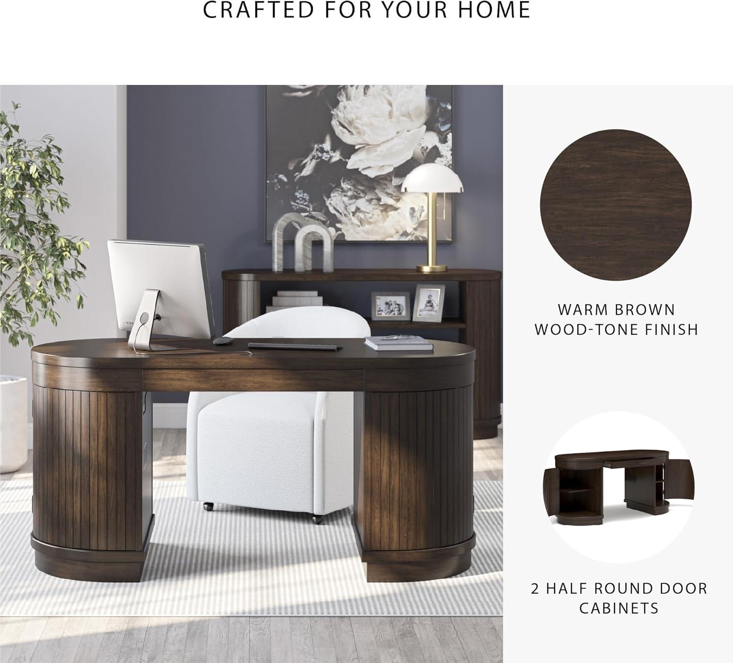This home office desk is perfectly modern in every way. Finished on both sides in a rich wood tone, it can be floated in a room or used as a divider. Two half round door cabinets, each with an adjustable shelf, deliver a well-organized space for work-from-home professionals. It's a striking study in upscale contemporary form and function.