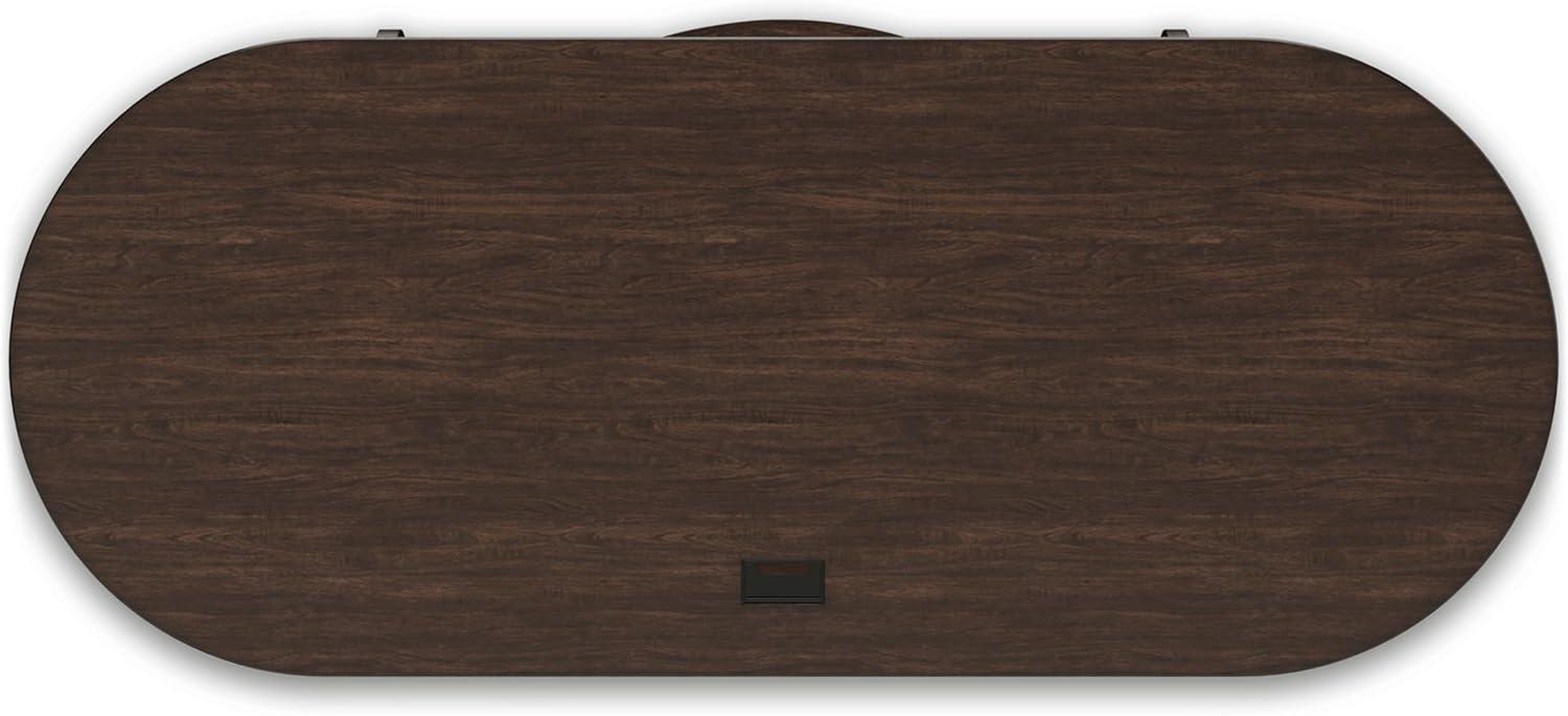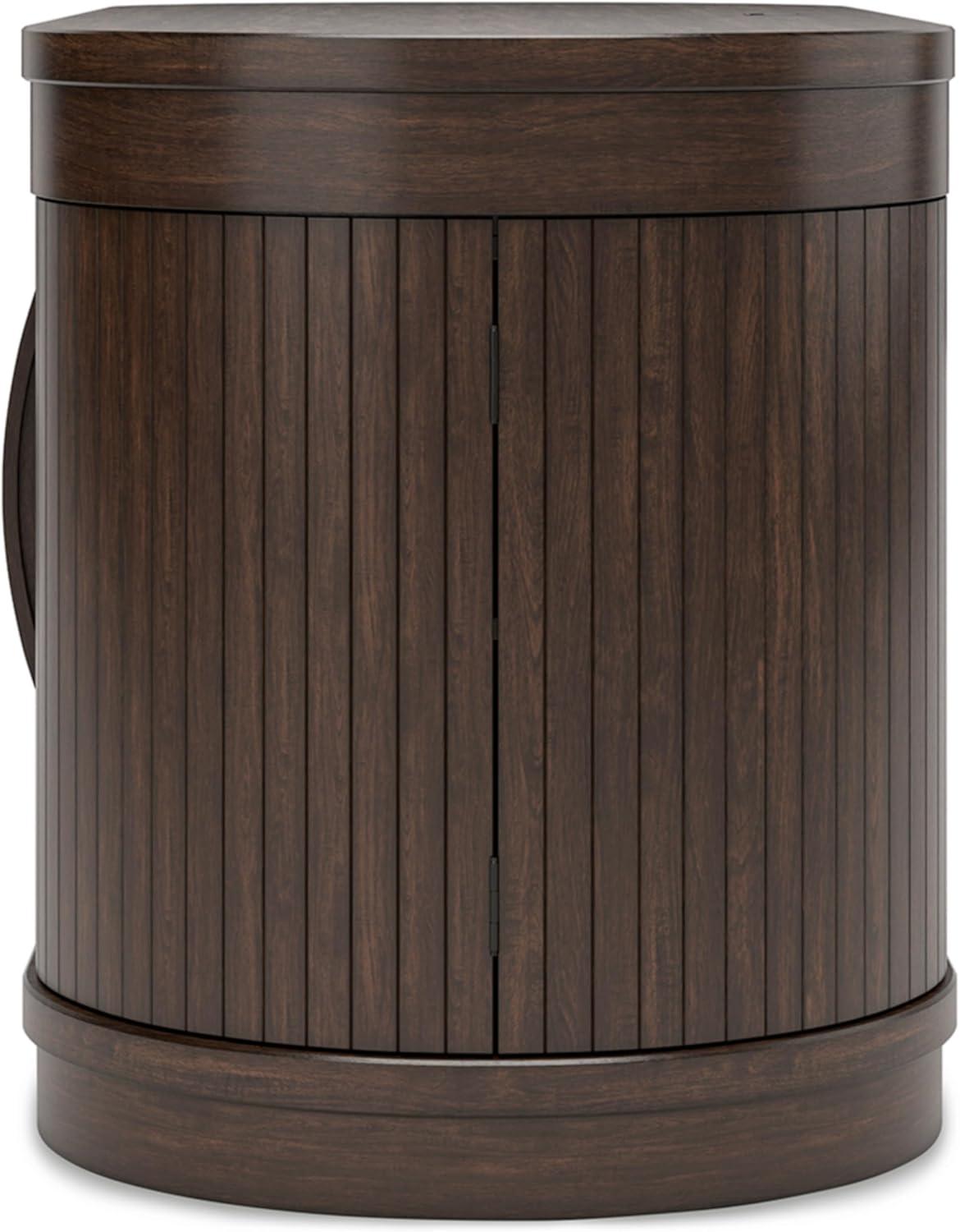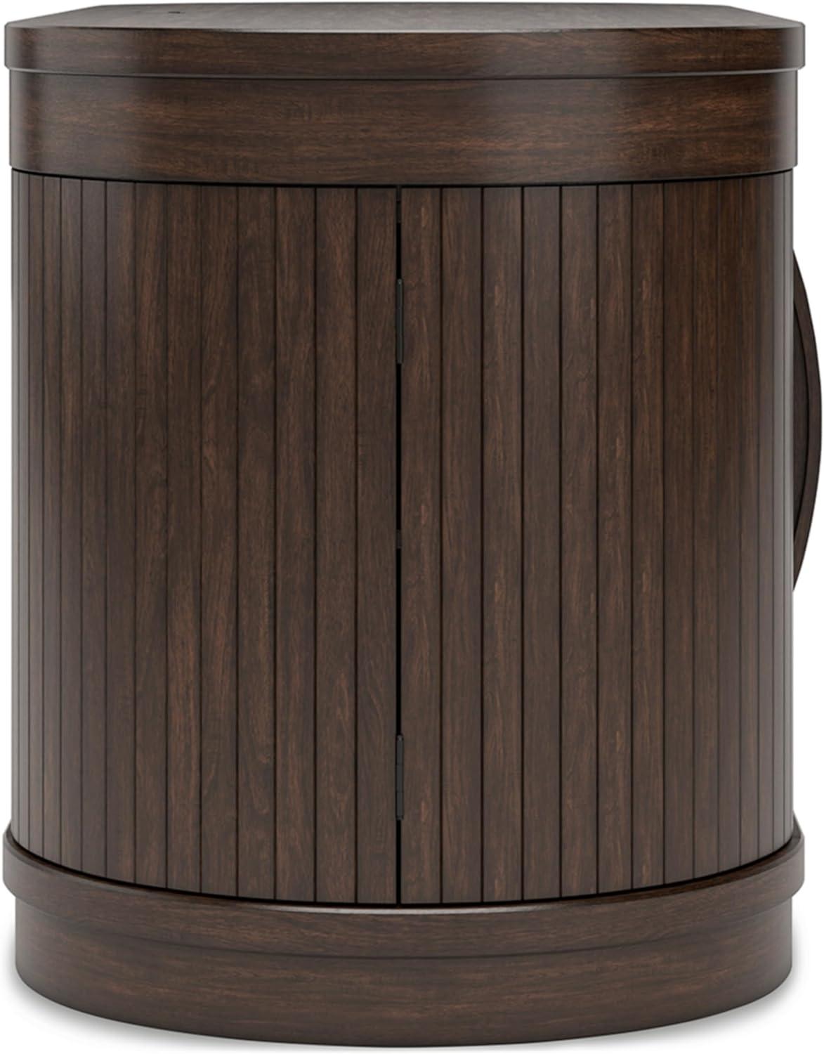 QUALITY CRAFTED: Made of hardwood solids and veneer with MDF substrate. Warm brown wood-tone finish. 2 half round door cabinets, each with adjustable shelf. Cutouts for cord management