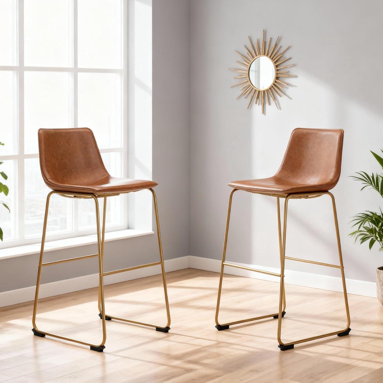 SET OF 2 BAR STOOLS: Dine in casual contemporary fashion with this bar stool set. A retro-inspired bucket design lends a mid-century vibe. Faux leather and goldtone frames bring the look into the present. Complete with contoured seats for comfort