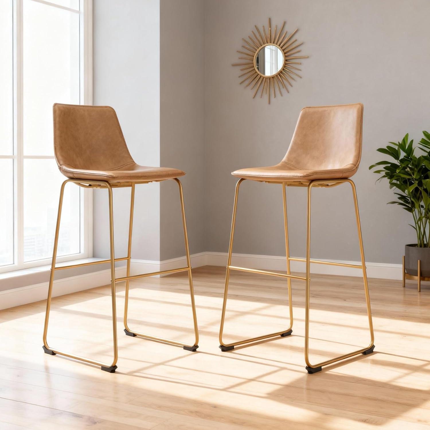 SET OF 2 BAR STOOLS: Dine in casual contemporary fashion with this bar stool set. A retro-inspired bucket design lends a mid-century vibe. Faux leather and goldtone frames bring the look into the present. Complete with contoured seats for comfort
