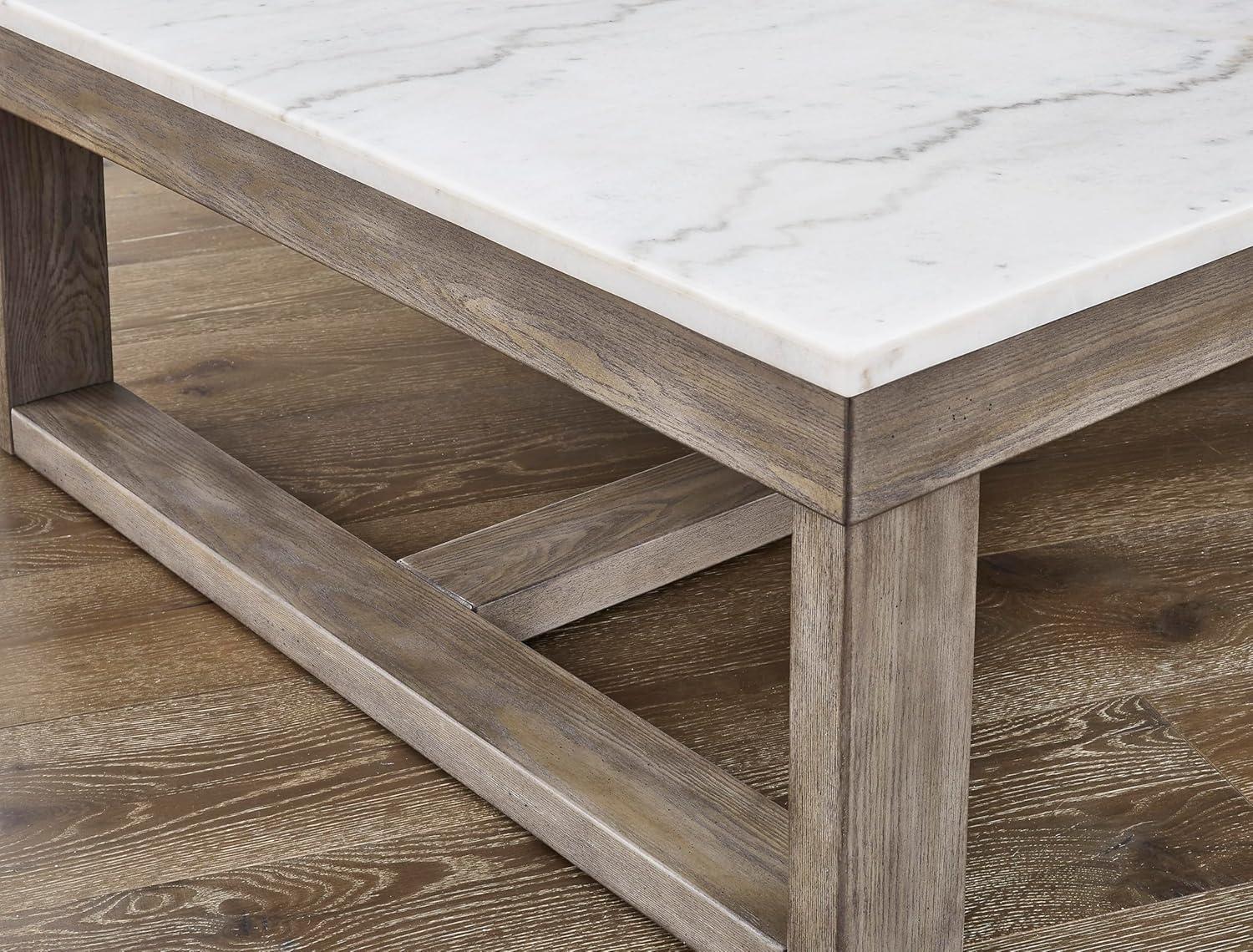 This coffee table is simple in design but big on style. Finished with a trend-right grayish brown wood tone, its bold, blocky profile and natural marble top are timeless classic choices that work so well with large sectional family room settings. Adding to its beauty, the marble top's color variations, fissures, mineral deposits and veining are naturally formed and are not defects.