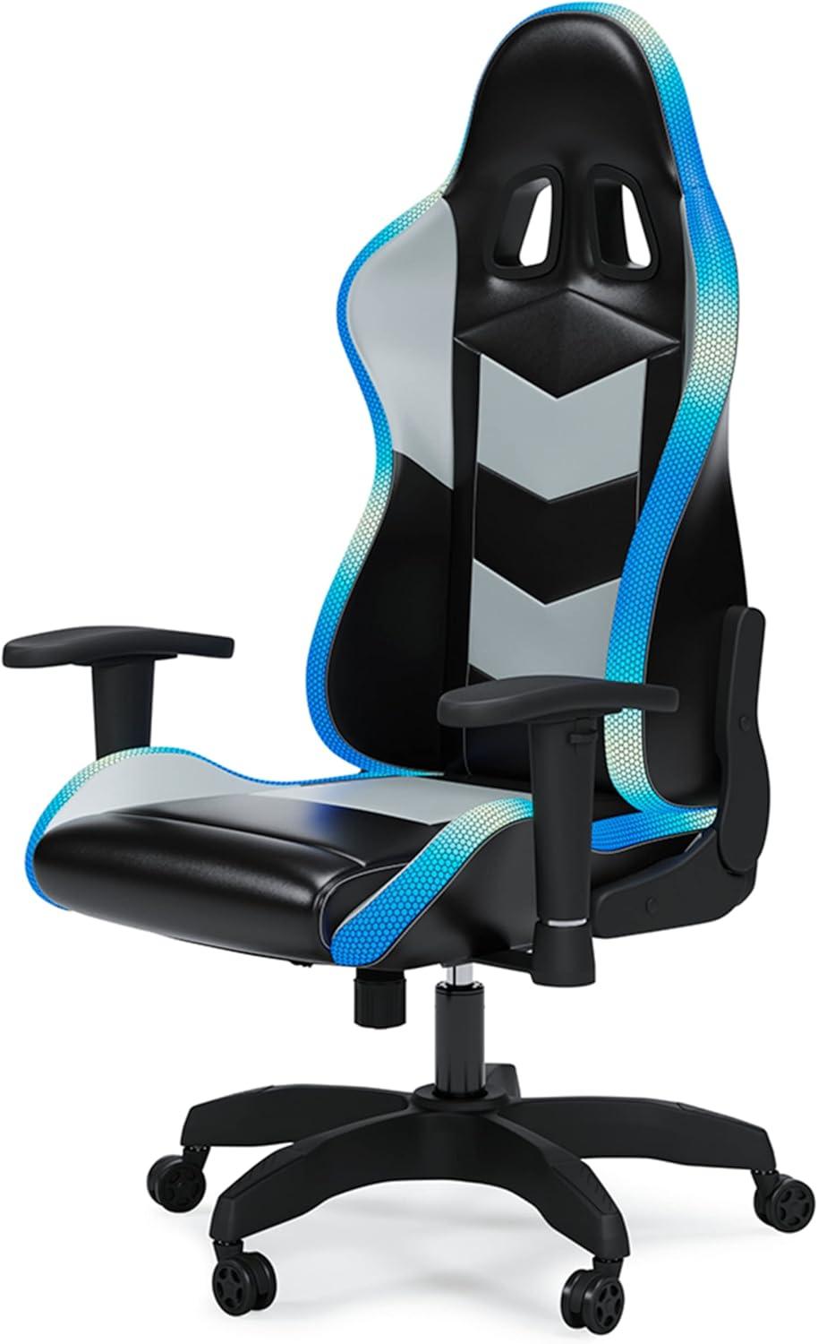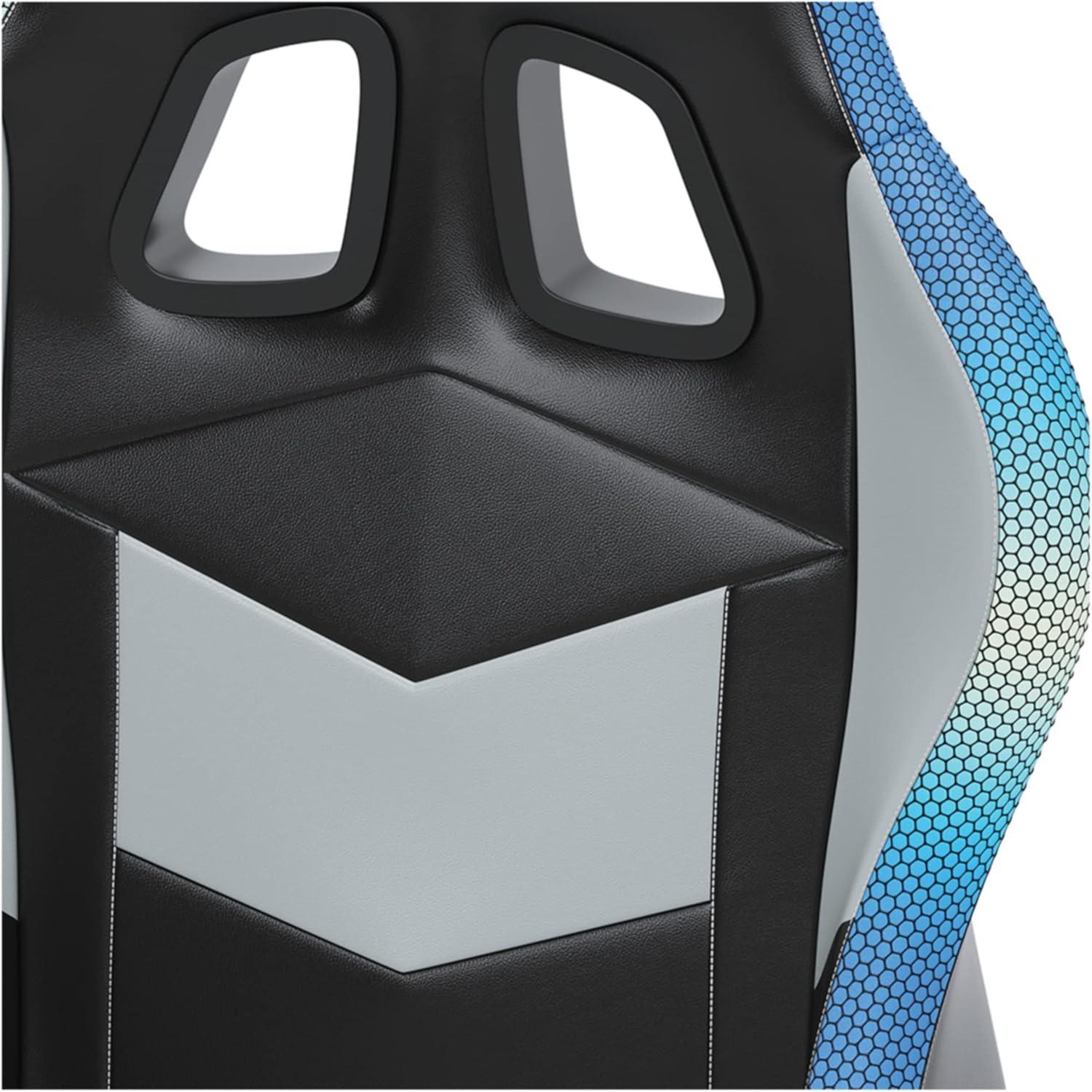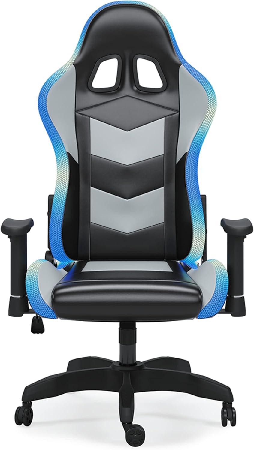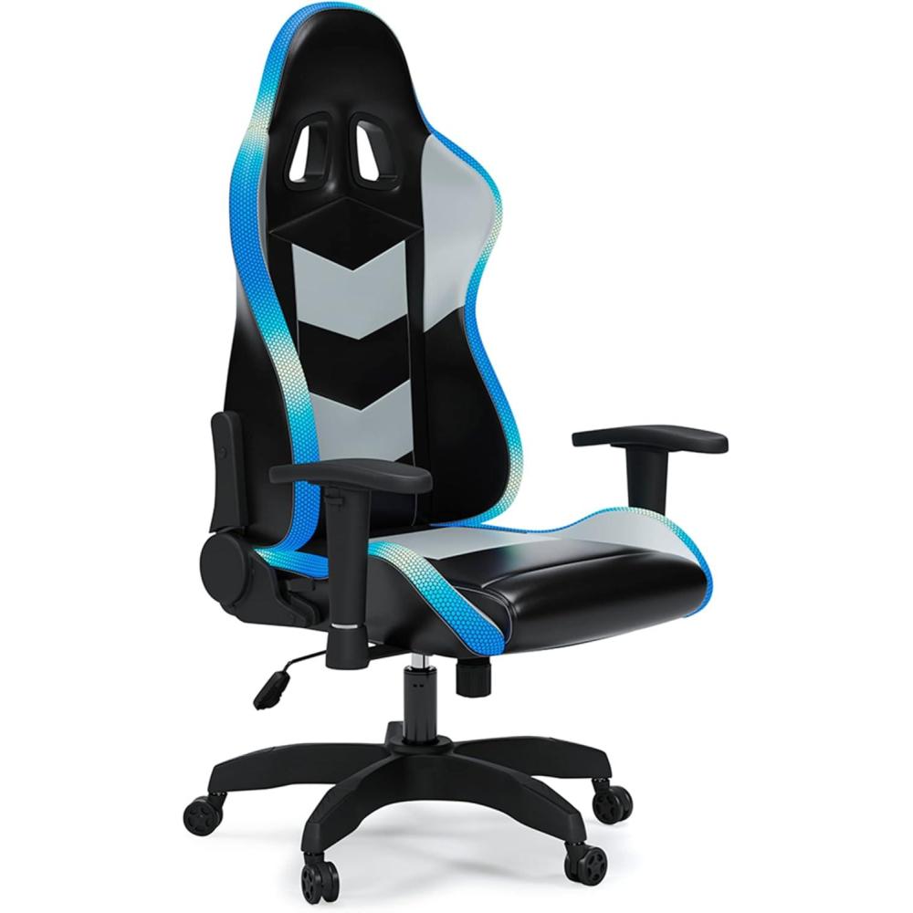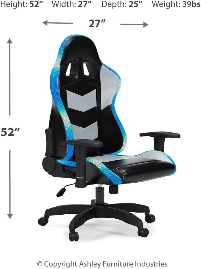 Tech this out: a swivel office chair that’s as cool as it is comfortable. The ultimate choice among gamers, this swivel office chair is hard to beat. Quality crafted with a sturdy steel frame, this swivel office chair with comfy contoured seat and cutting-edge design is upholstered in a durable faux leather in white and gray. Cleverly integrated into the chair: powered LED lighting to enhance the gaming experience. Choose from six different colors or stream a mix of color using the remote control. With a swivel base, smooth-gliding casters and adjustable seat height/tilt feature, this office chair with fully reclining backrest has serious game.