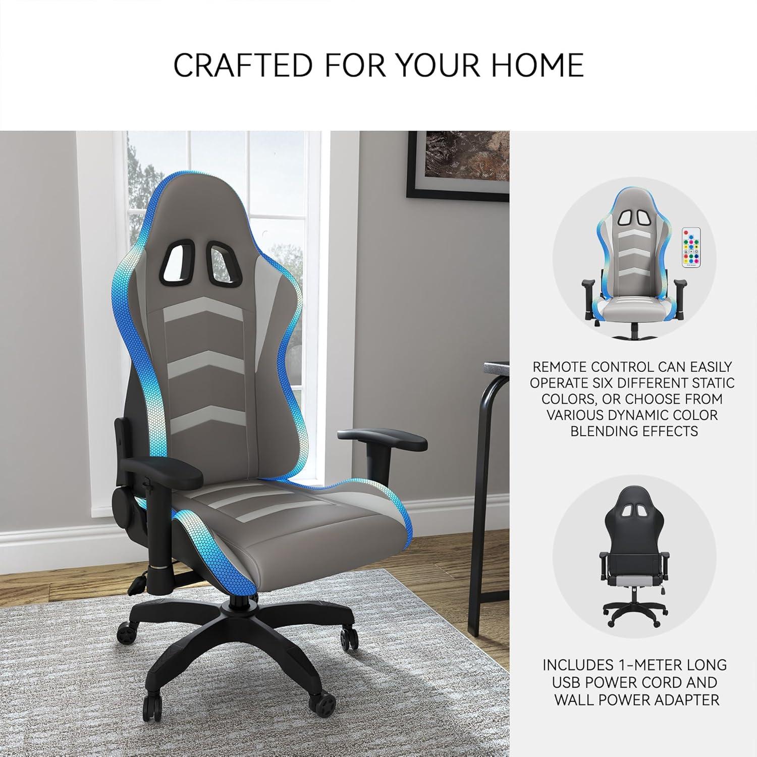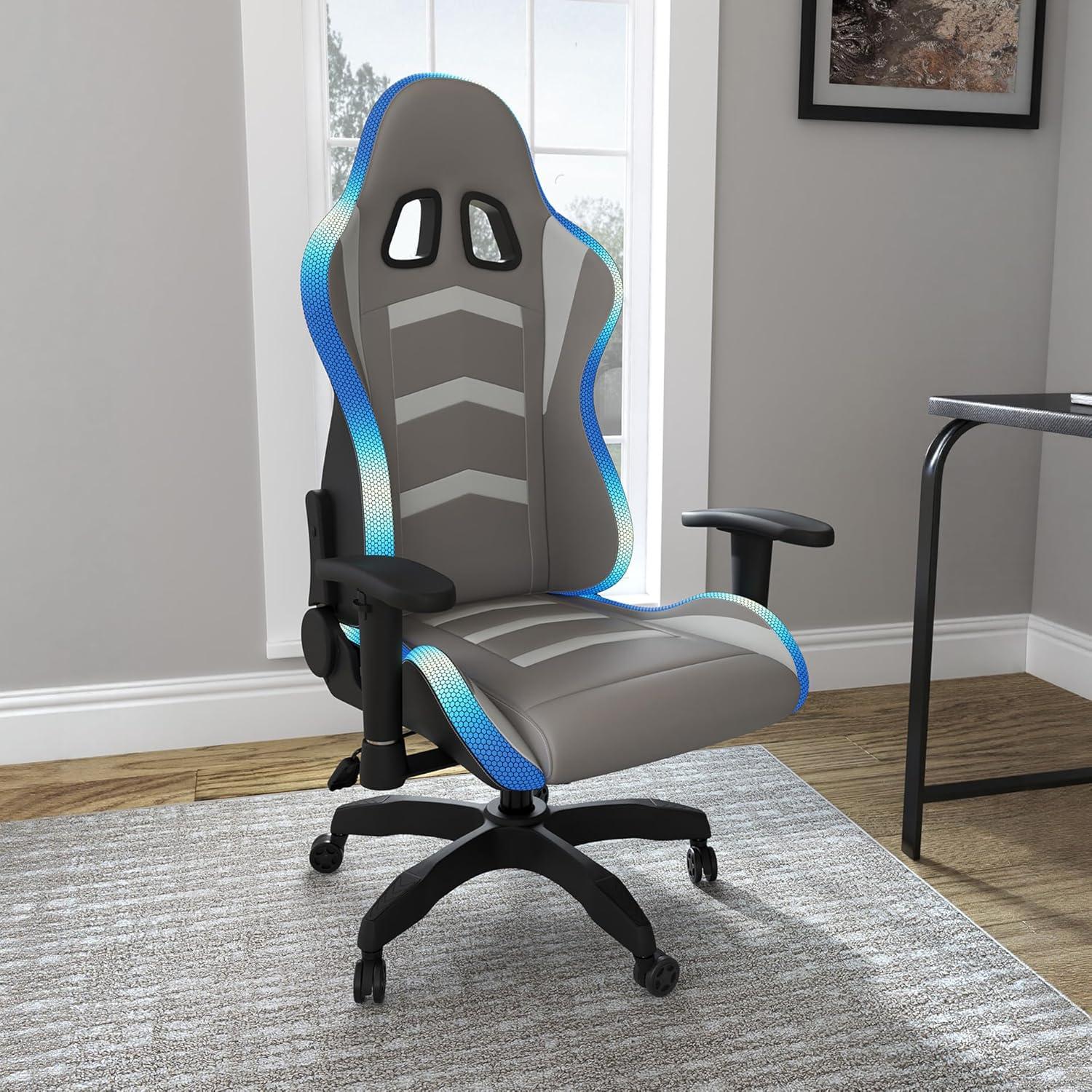 Tech this out: a swivel office chair that’s as cool as it is comfortable. The ultimate choice among gamers, this swivel office chair is hard to beat. Quality crafted with a sturdy steel frame, this swivel office chair with comfy contoured seat and cutting-edge design is upholstered in a durable faux leather in white and gray. Cleverly integrated into the chair: powered LED lighting to enhance the gaming experience. Choose from six different colors or stream a mix of color using the remote control. With a swivel base, smooth-gliding casters and adjustable seat height/tilt feature, this office chair with fully reclining backrest has serious game.