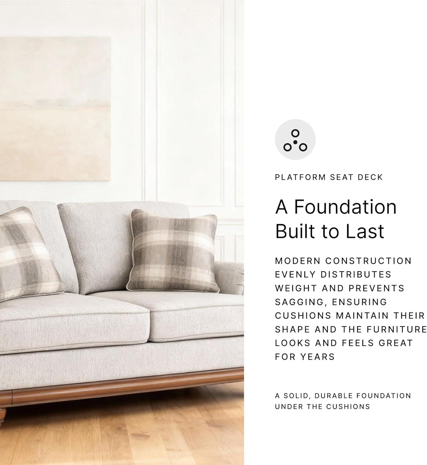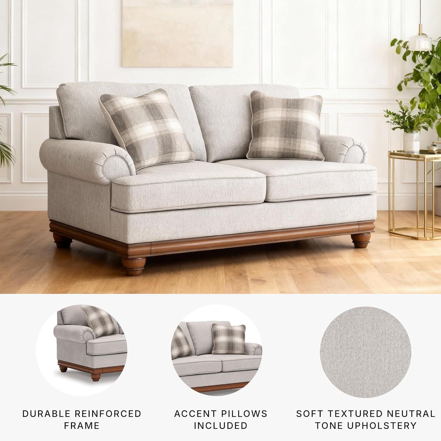 Fresh yet classic. That’s the beauty of this loveseat. Dressy and also soft to the touch, its organic neutral-toned upholstery is sure to bring a transitional farmhouse aesthetic to your living space. Accent pillows in windowpane plaid infuse a cozy and inviting farmhouse sensibility, while a full wraparound base and decorative turned legs complete the loveseat's timeless look. It's the perfect place to unwind with your bestie after a long day.