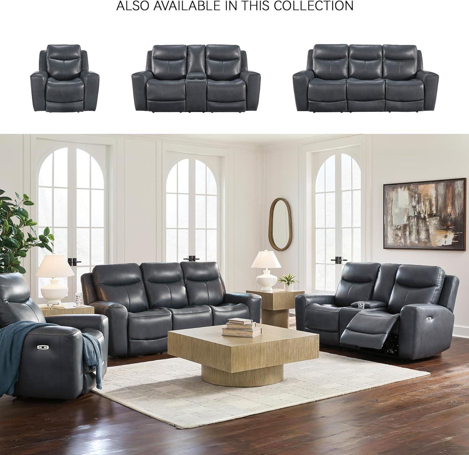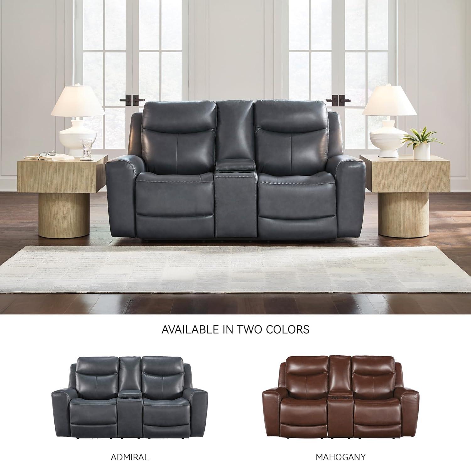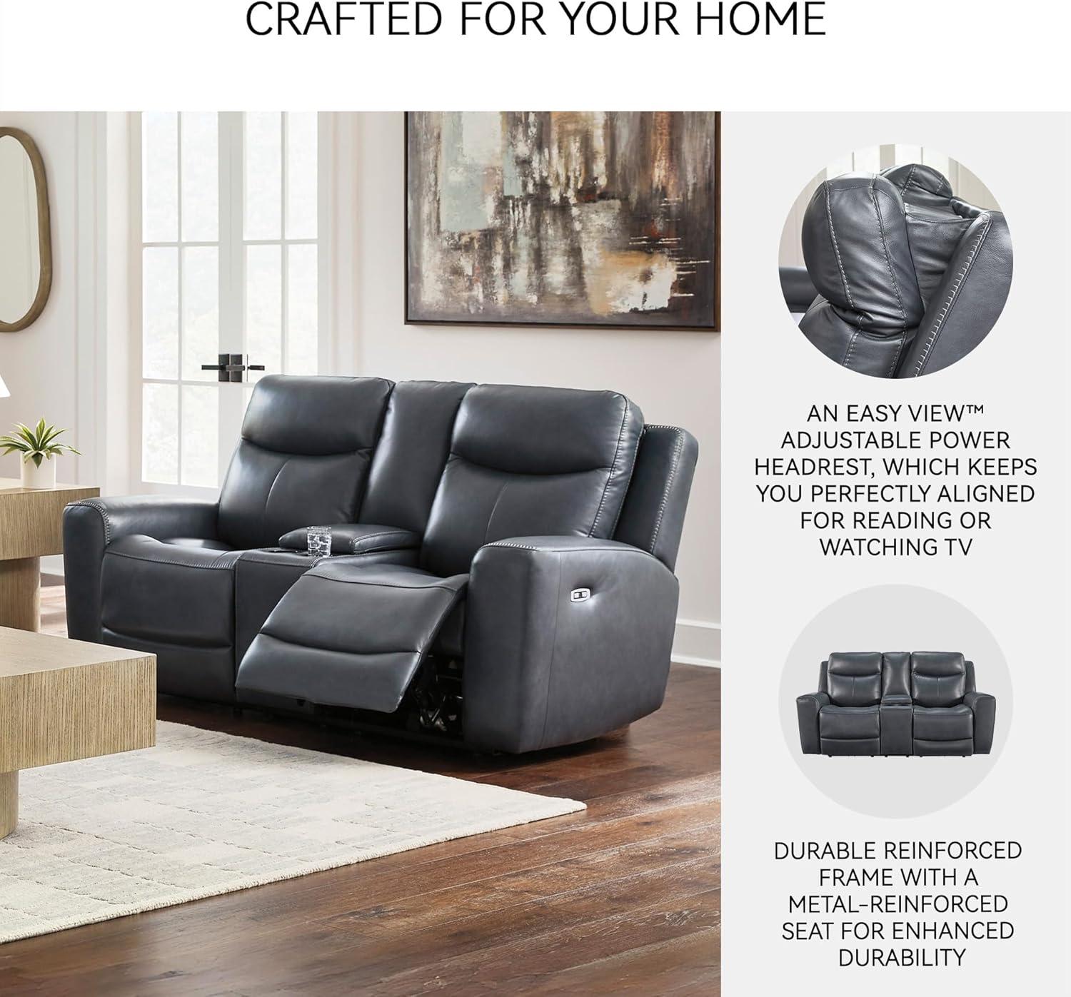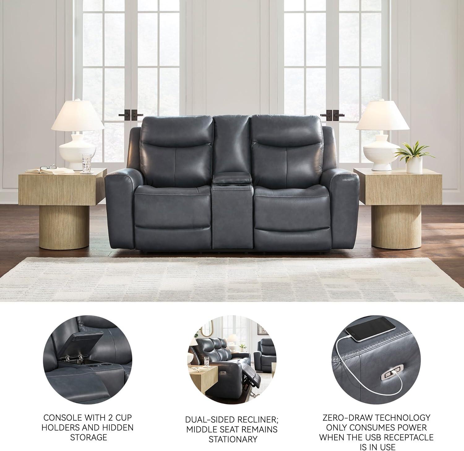Signature Design by Ashley Mighty Moves Contemporary Power Leather Match Reclining Loveseat with Console, Adjustable Headrest and USB Charging Ports, Blue