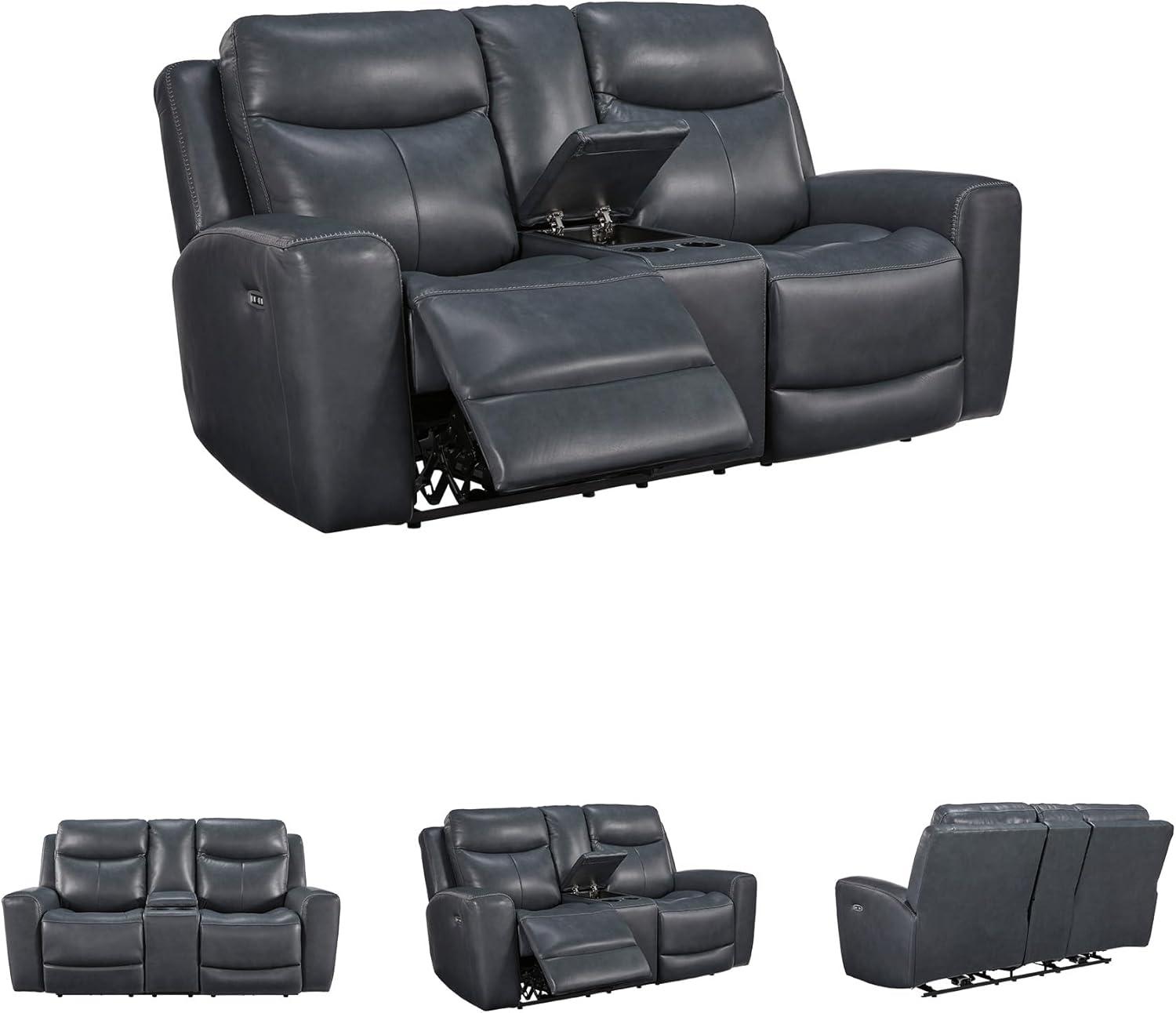 Prepare to be moved. This power reclining loveseat with console combines sleek modern design with all the soothing features you've been dreaming of. Wrapped in blue-hued leather and faux leather for affordable luxury, this highly contemporary piece with cozy scoop seating suits your relaxed vibe. Infinite reclining and headrest positions are yours at the touch of a button. It's the perfect choice for anyone who wants their comfort with a side of style.