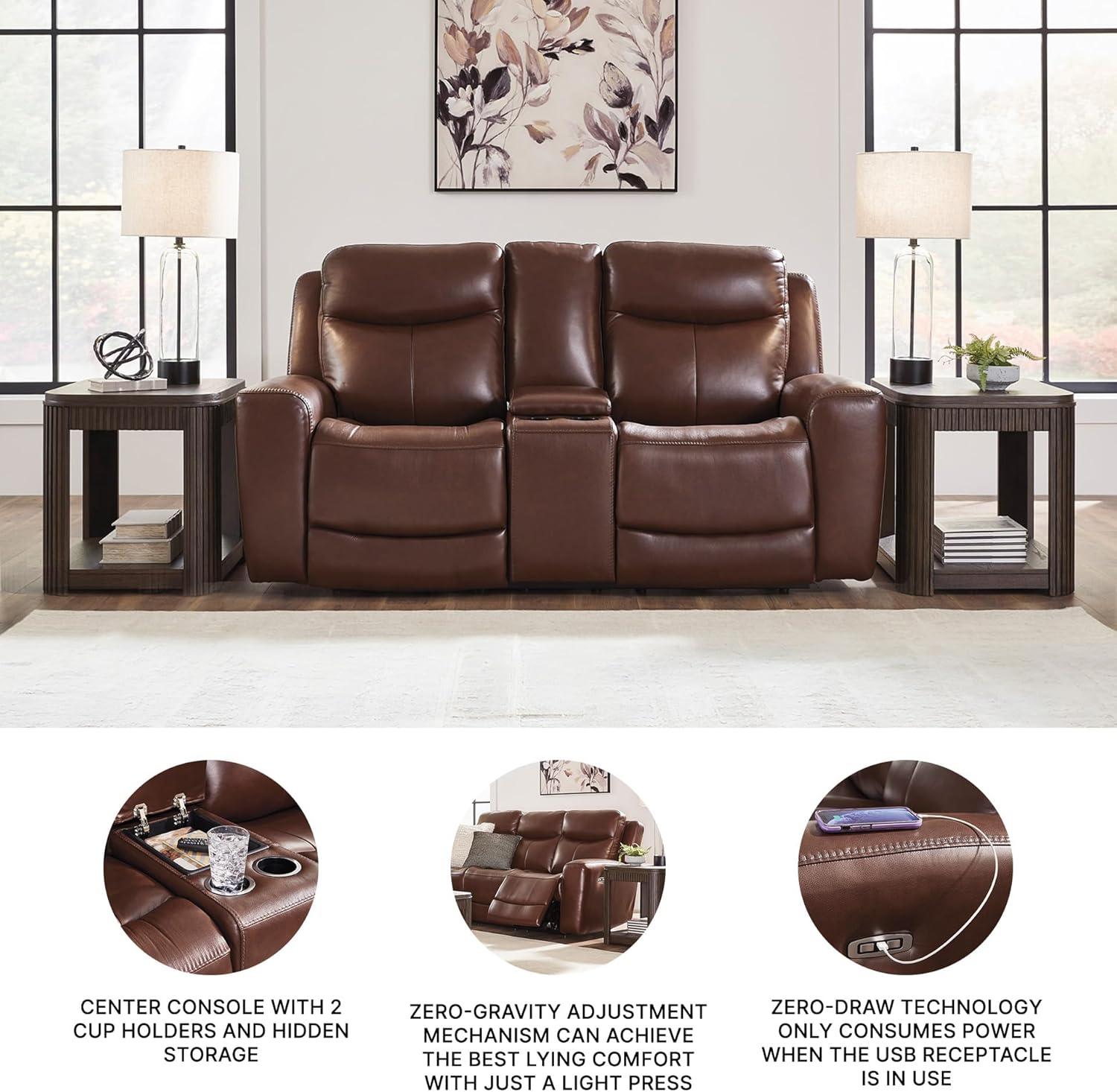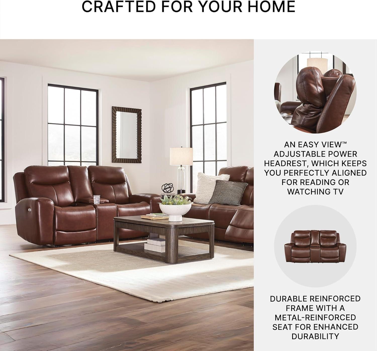 Signature Design by Ashley Mighty Moves Transitional Leather Match Power Reclining Loveseat with Console, Adjustable Headrest, USB Charging Port, Storage and 2 Cup Holders, Dark Brown