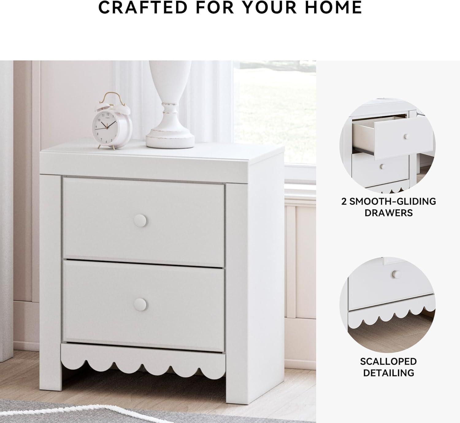 2-DRAWER NIGHTSTAND: Charmingly cute with its scalloped detailing and crisp white finish, this nightstand with USB charging appeals to both her sense of playful whimsy and your love for modern design