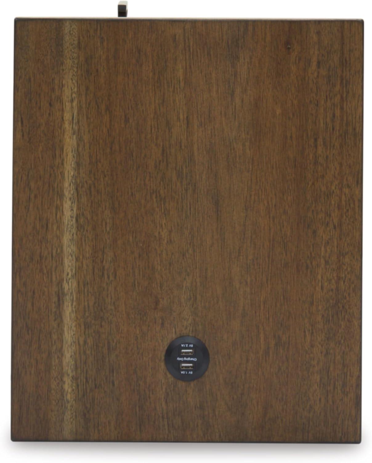 HANDSOMELY CRAFTED: Made with acacia wood solids, veneer and MDF substrate.. Single cabinet door with storage shelf. 110V power supply with dual USB ports