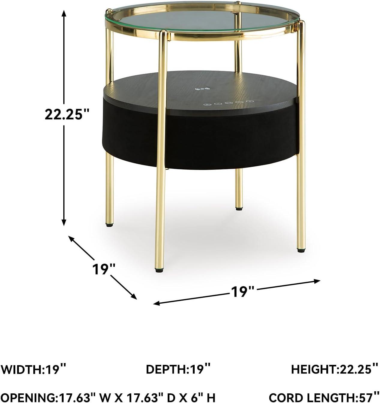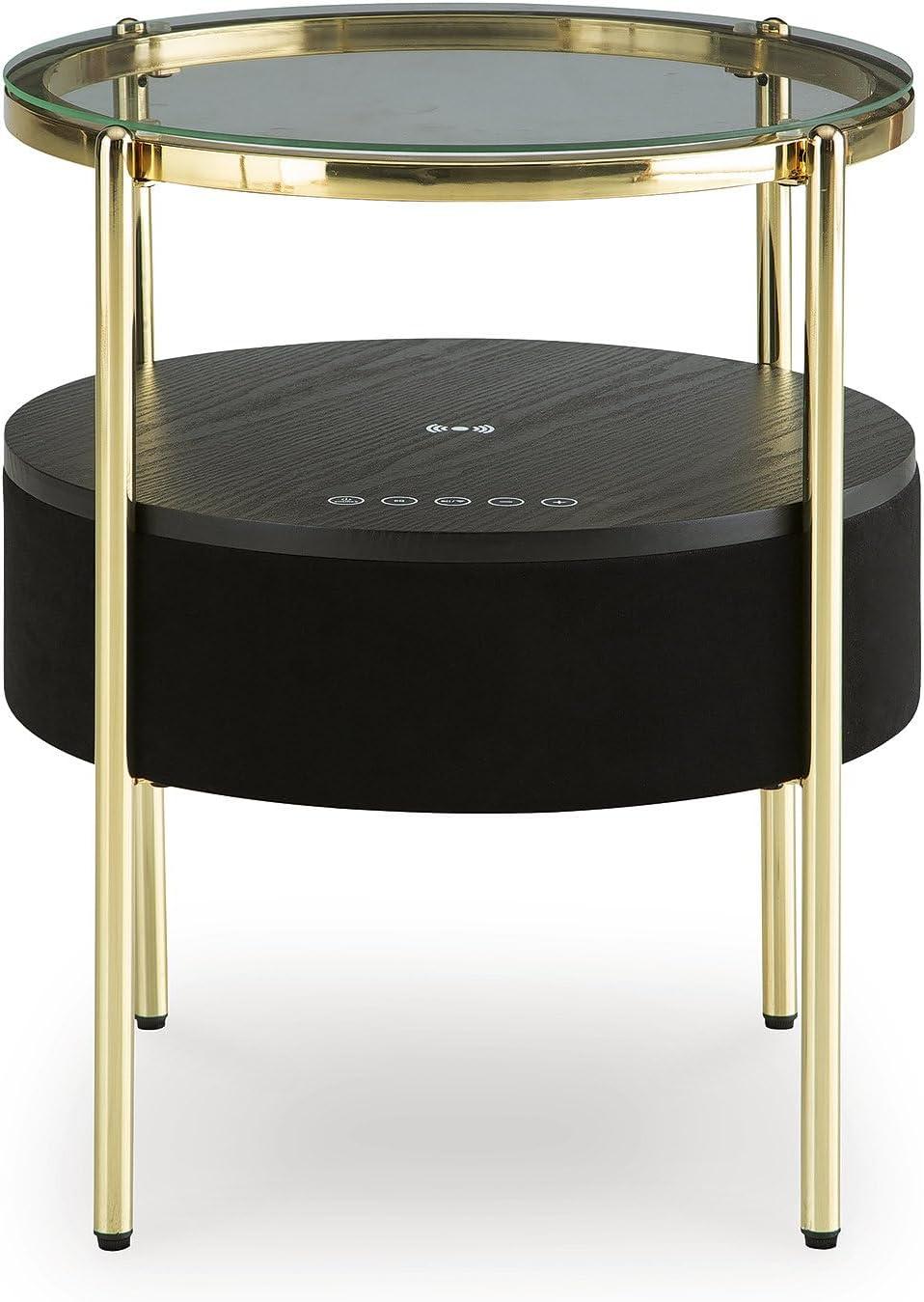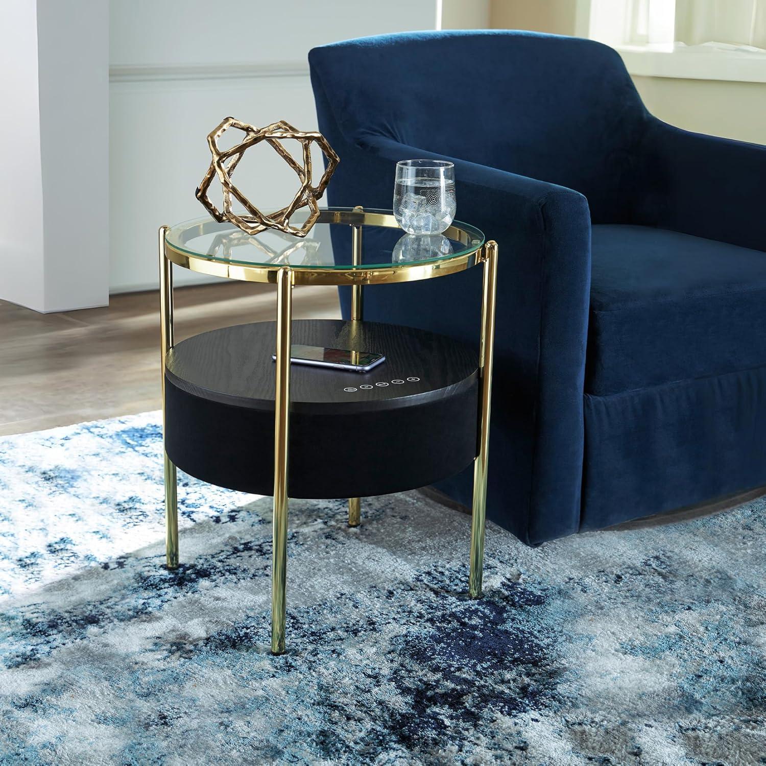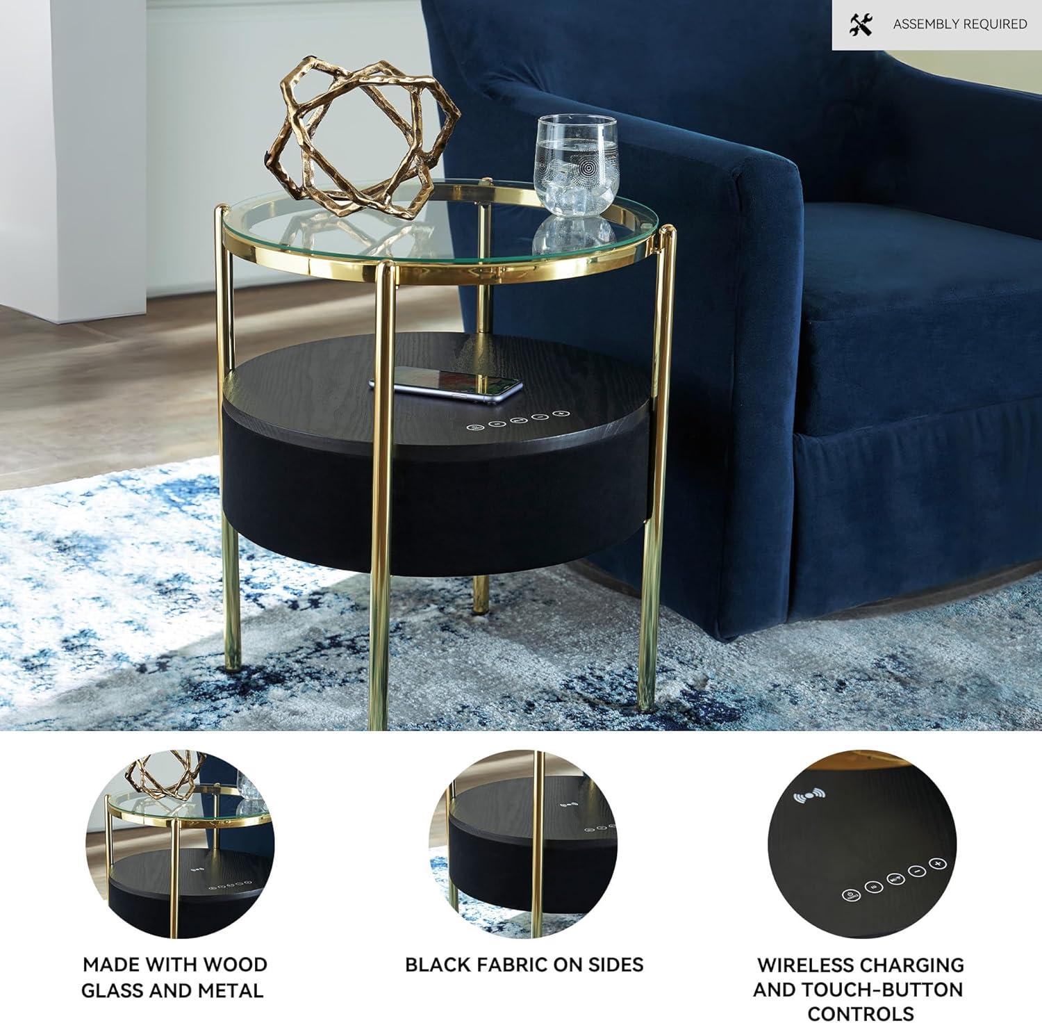 Signature Design by Ashley Nedman Modern Tempered Glass Tabletop Accent Table with Speaker, Shelf, USB and Qi Wireless Charging Options, Black & Metallic