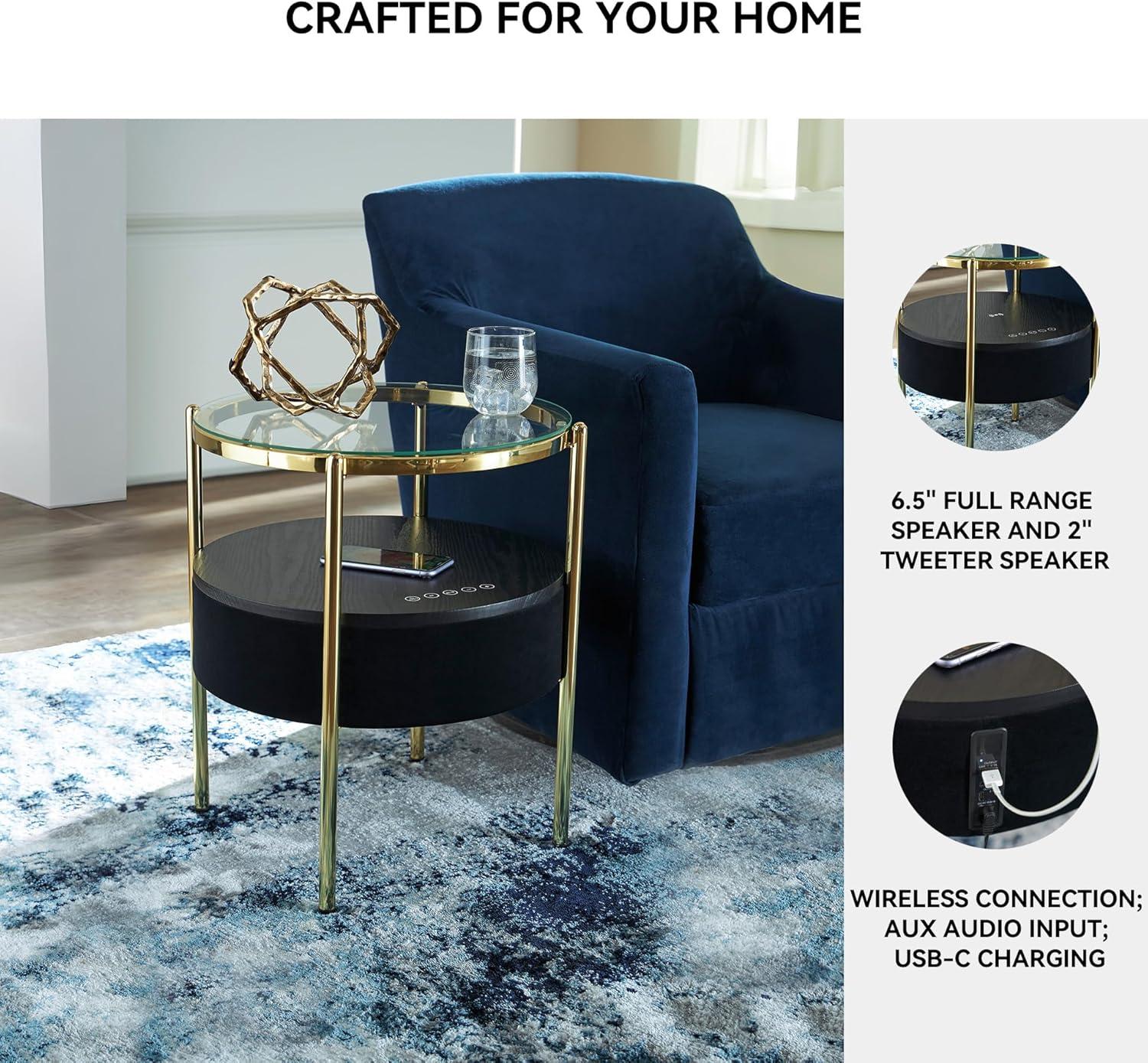 ACCENT TABLE WITH SPEAKER: This table is designed with an integrated speaker, allowing you to effortlessly stream your favorite tunes wirelessly. Its sleek glass top complements the goldtone frame
