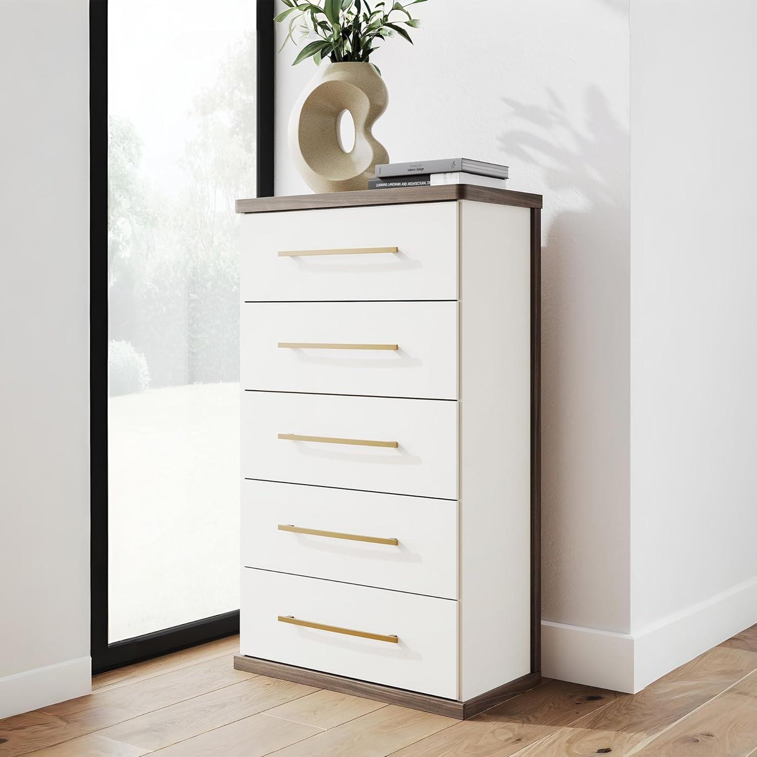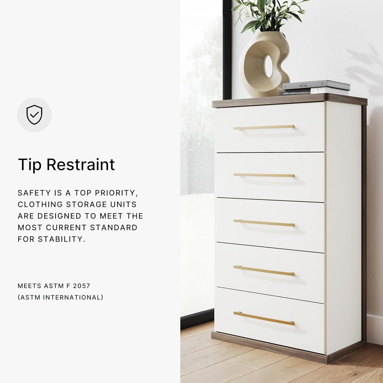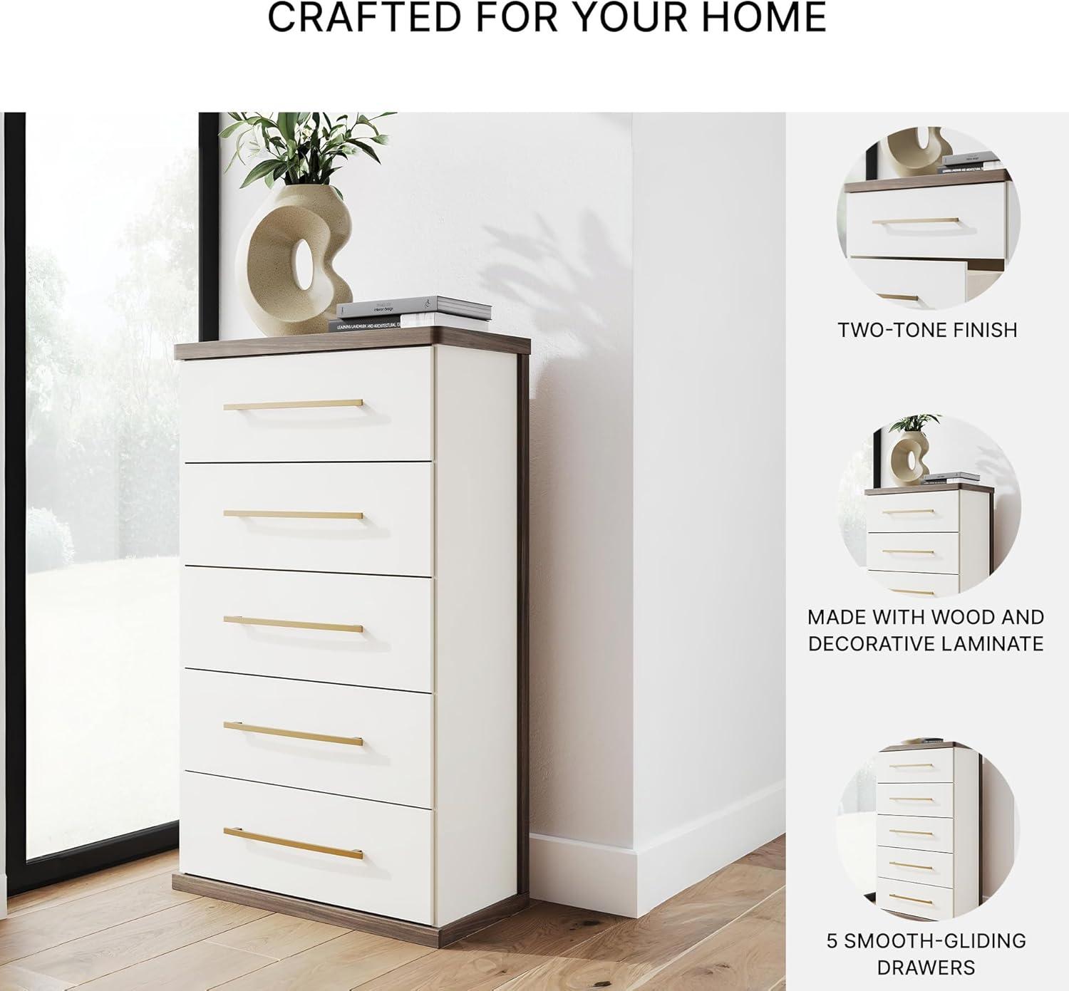 5-DRAWER CHEST: Make a striking statement with this dresser. Sophisticated 2-tone finish marries warm brown walnut grain with matte white. Rounded corners and a thick top radiate modern panache. Sleek champagne handles add a sparkling touch