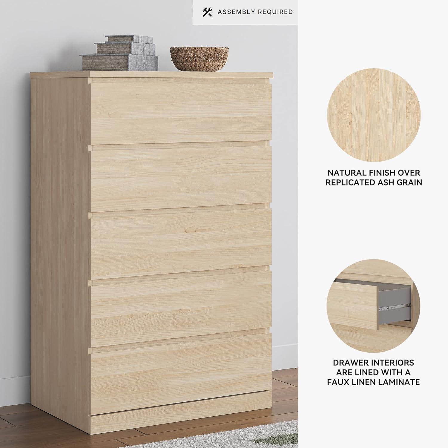 QUALITY CRAFTED: Made with engineered wood and decorative laminate. Natural finish over replicated ash grain. 5 smooth-gliding drawers with ball-bearing side glides and vinyl-wrapped side & back for durability