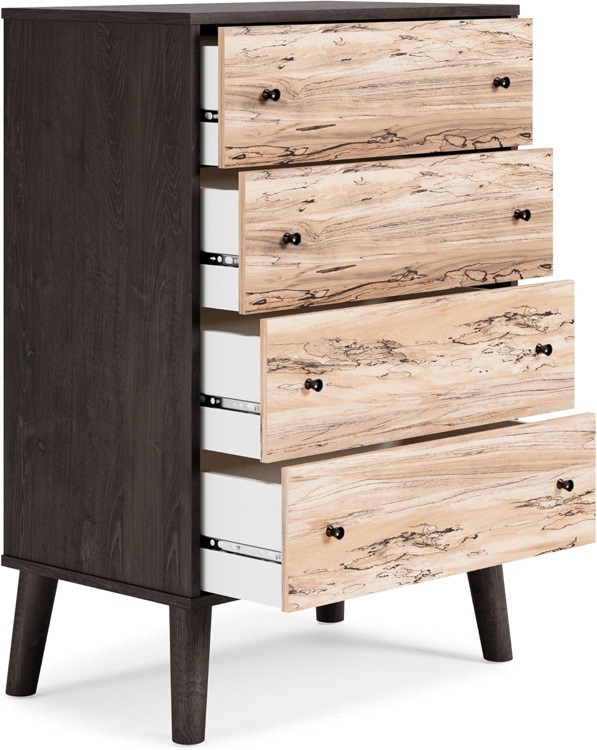 The perfect marriage of simple and contemporary style, this chest of drawers is a charming addition to your home. It features an expressive two-tone look, with a dark charcoal finish over replicated oak grain with an authentic touch and a replicated sugarberry wood grain. Ball-bearing glides offer smooth opening and closing of the drawers, while matte black knobs and splay legs add a finishing touch. Whether you need storage space for clothes, linens or toys, you're sure to find the right fit. Your dream bedroom is closer than you think–our wide selection of finishes and features fulfill your decor needs, from casual to contemporary. And we go the extra mile to package, protect and deliver your purchase in a timely manner.