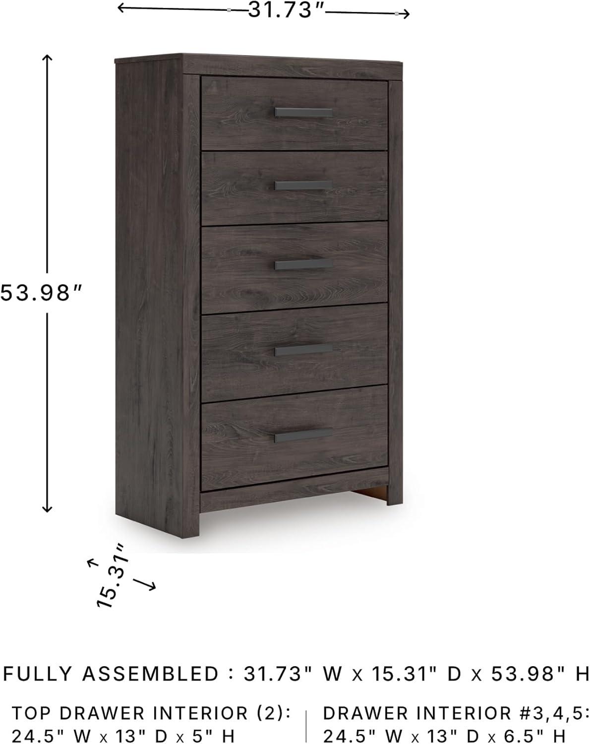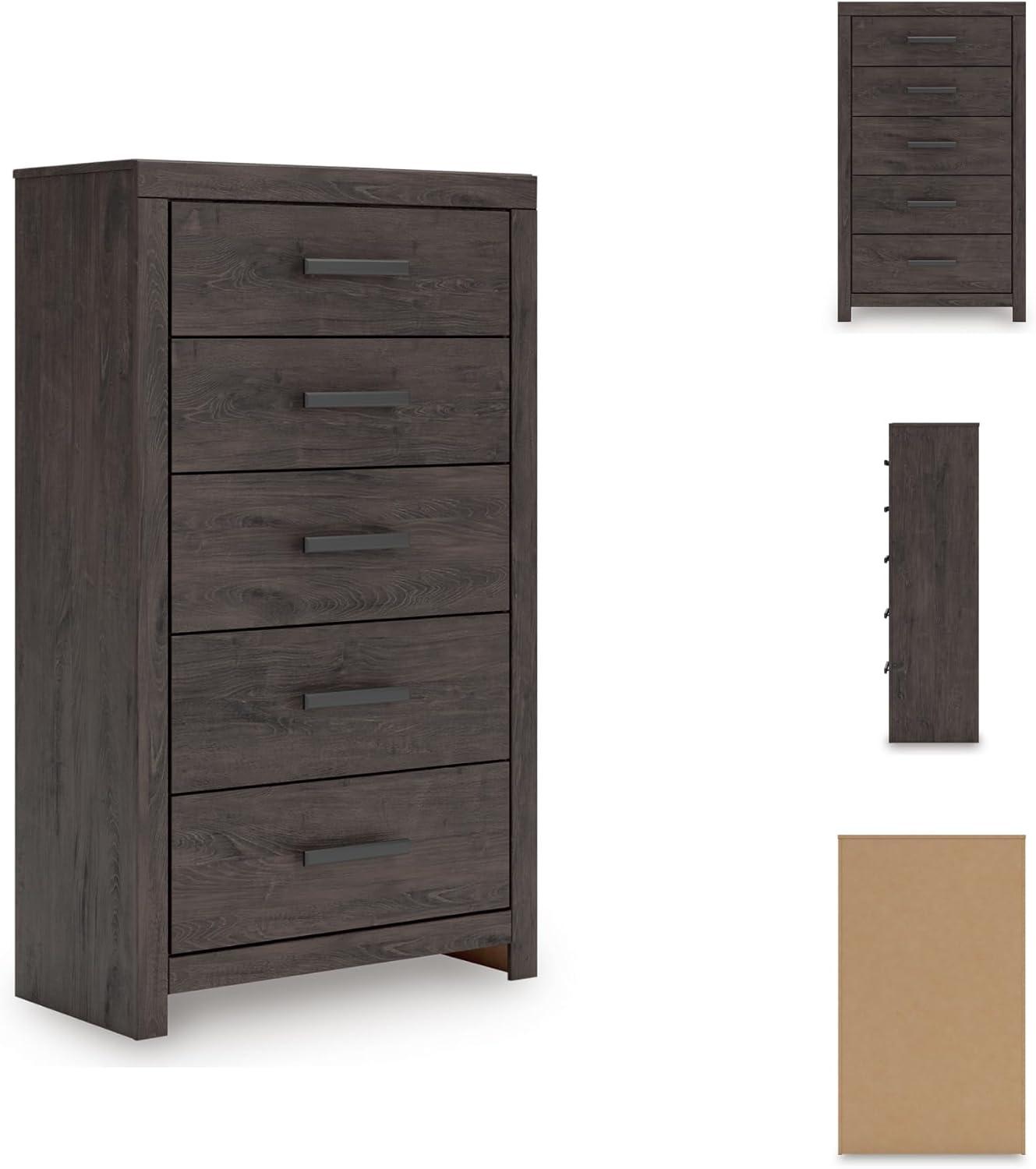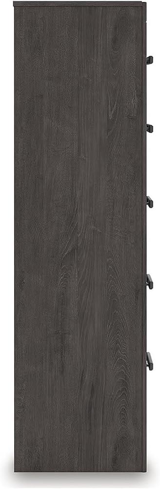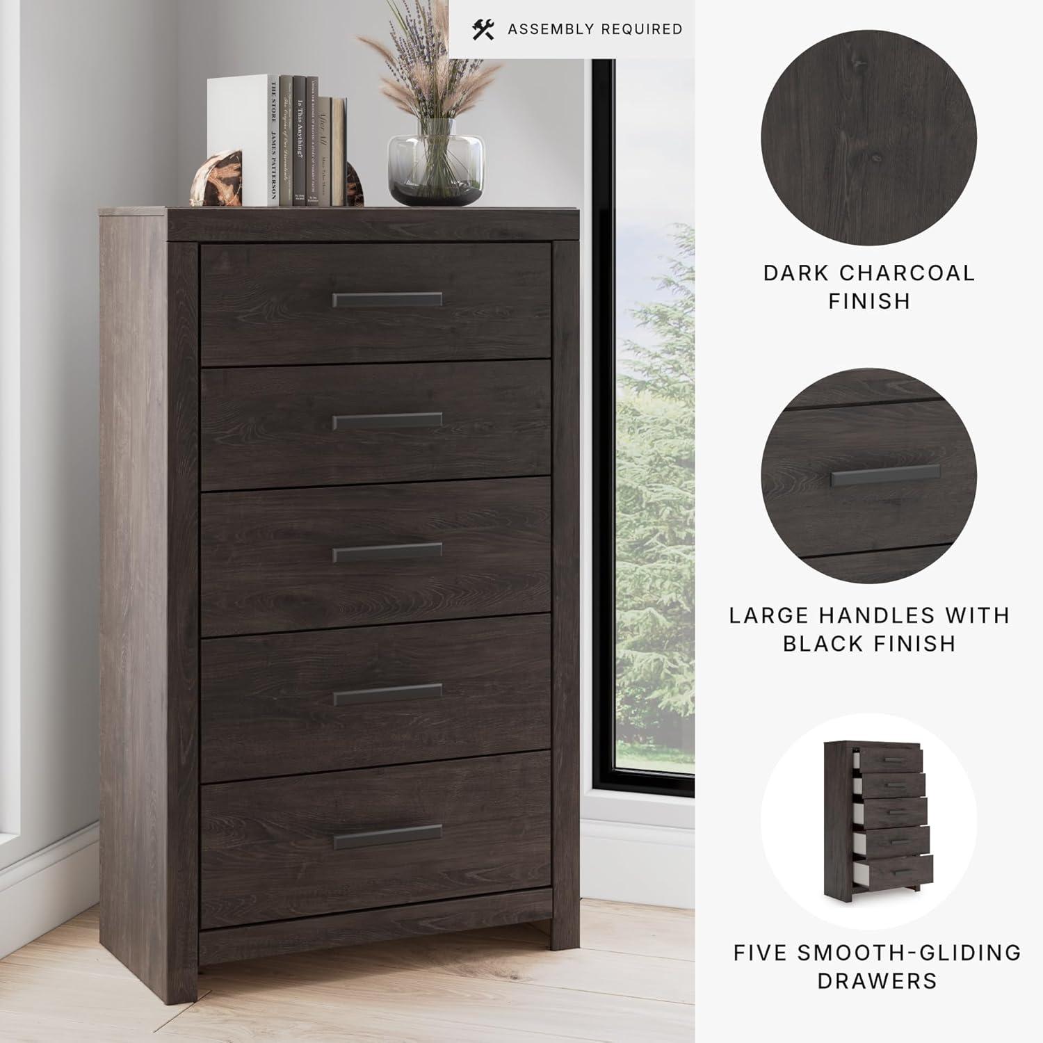 QUALITY CRAFTED: Made with engineered wood and decorative laminate. Dark charcoal finish over replicated oak grain. Large black handles. 5 smooth-gliding drawers. Framed front and pilasters