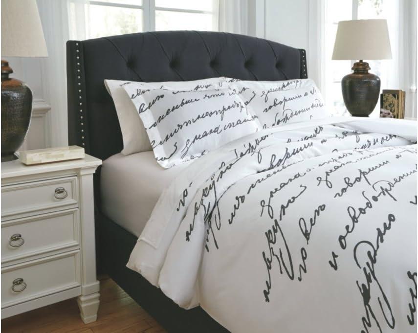 3-Piece Duvet Cover Set – Includes Duvet Cover and 2 Shams (Insert not Included). White with Script Design in Shades of Gray. 220 TC. Cotton. Machine Washable.