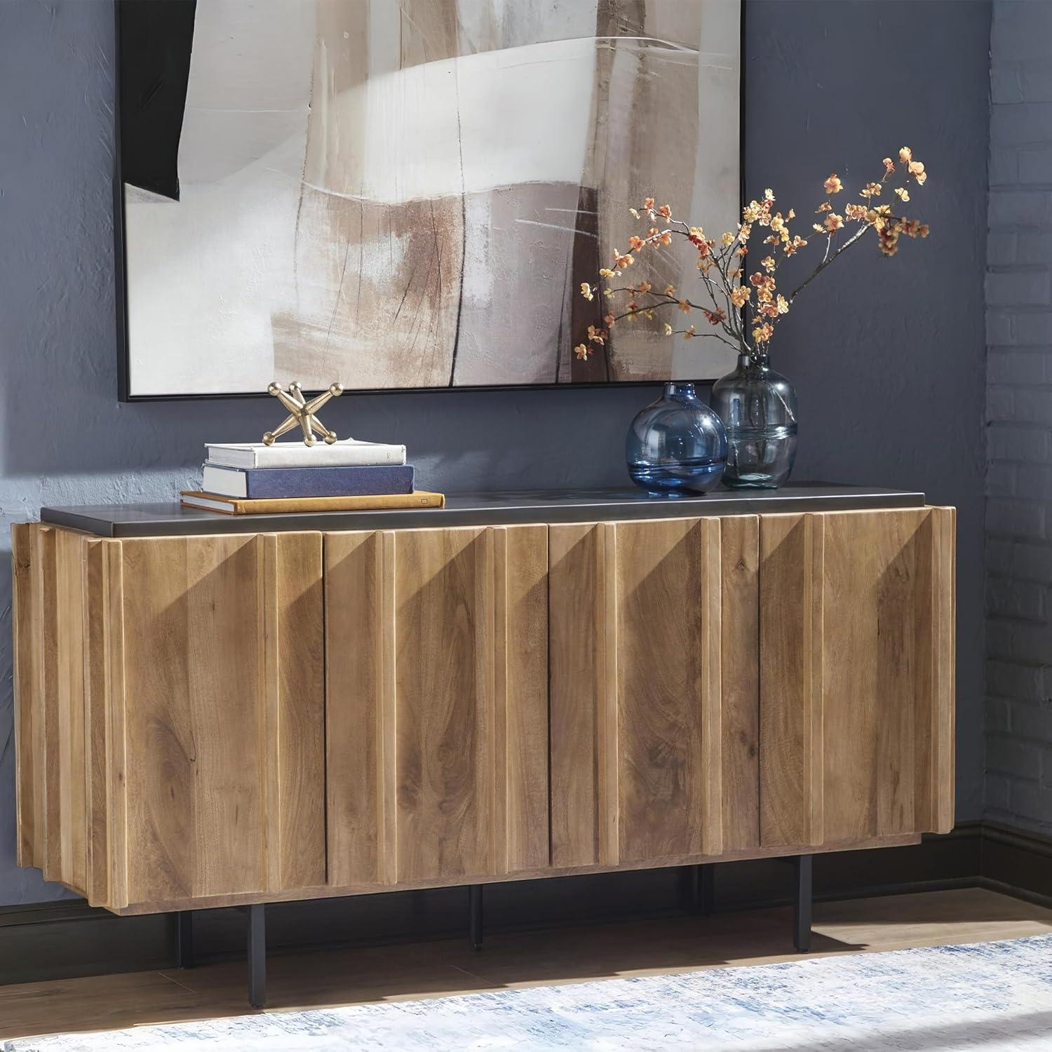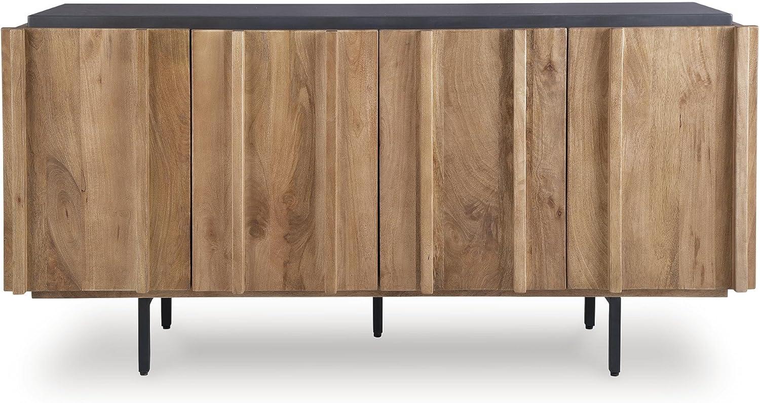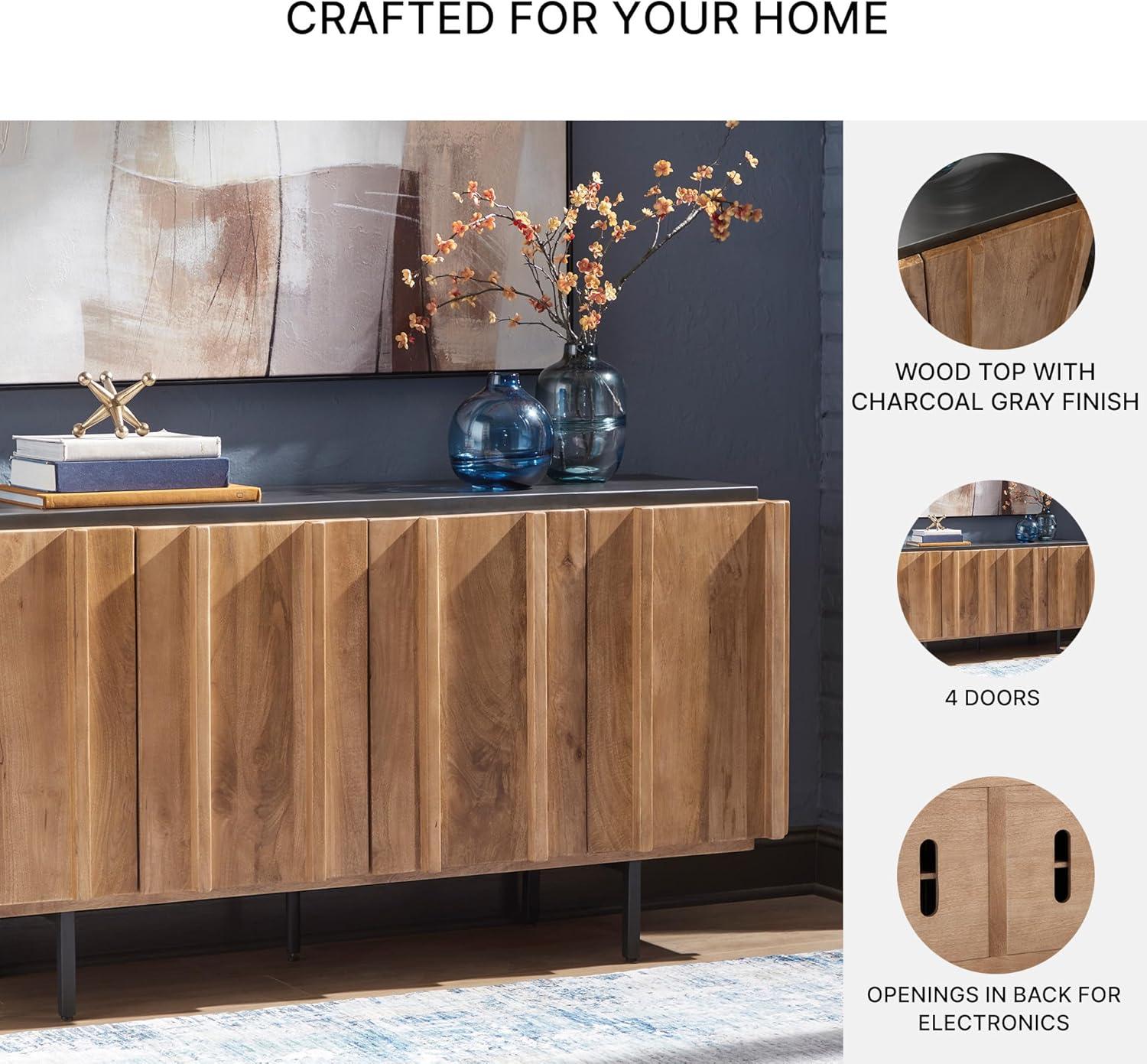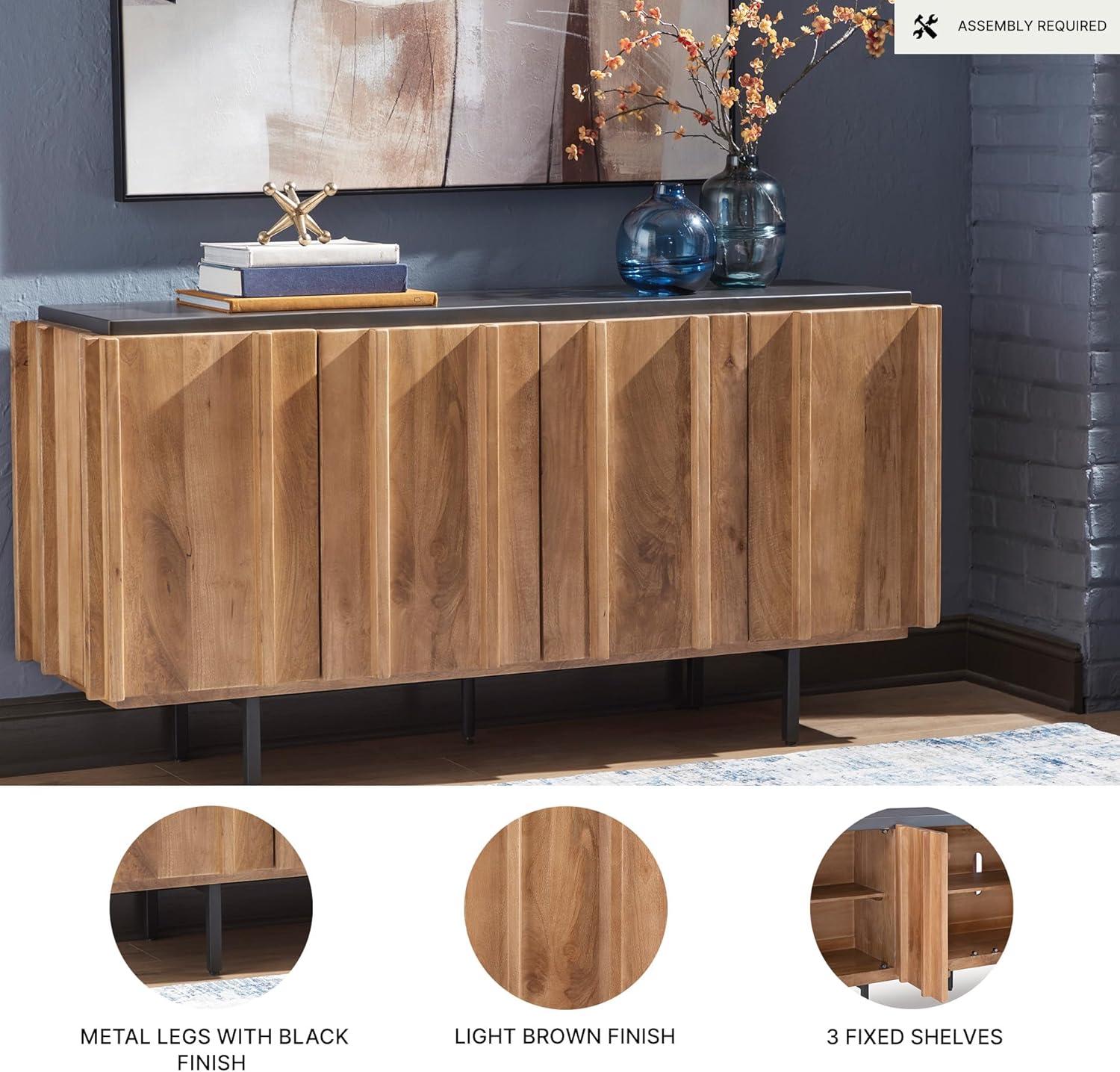 QUALITY MADE: Solid mango wood doors, sides & interior. Back made with mango veneer & engineered wood substrate. Light brown finish & charcoal gray top. Metal legs with black finish. Includes 4 doors, 3 fixed shelves & cord cut outs