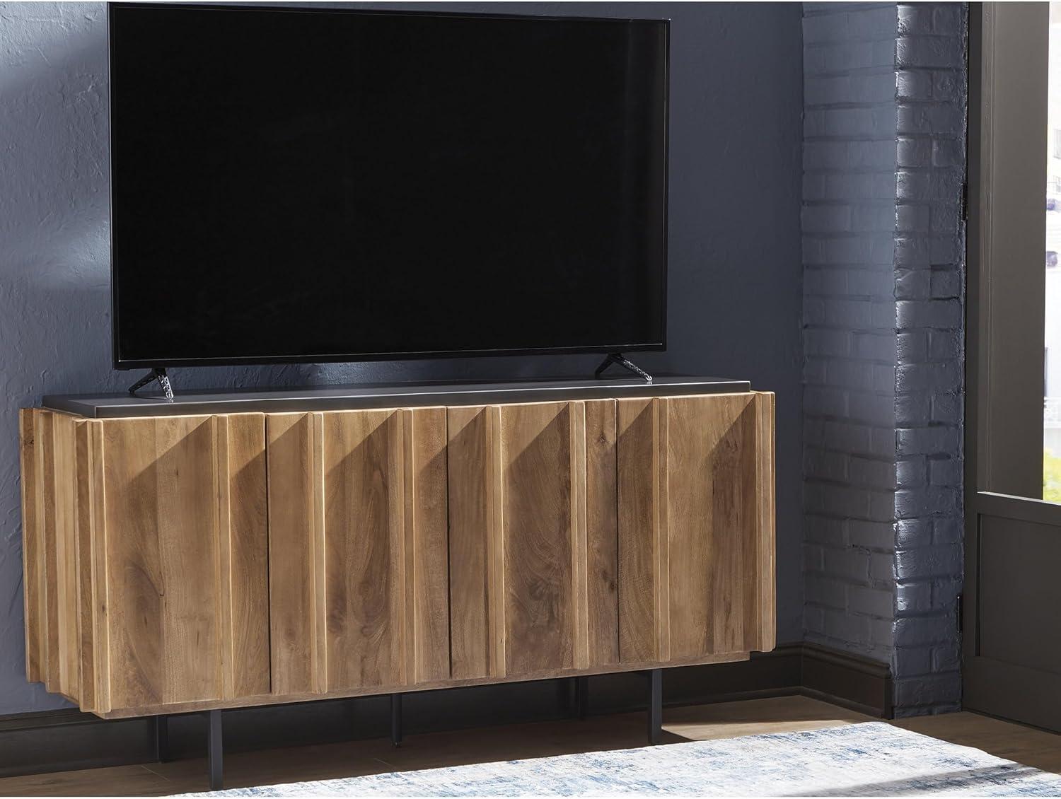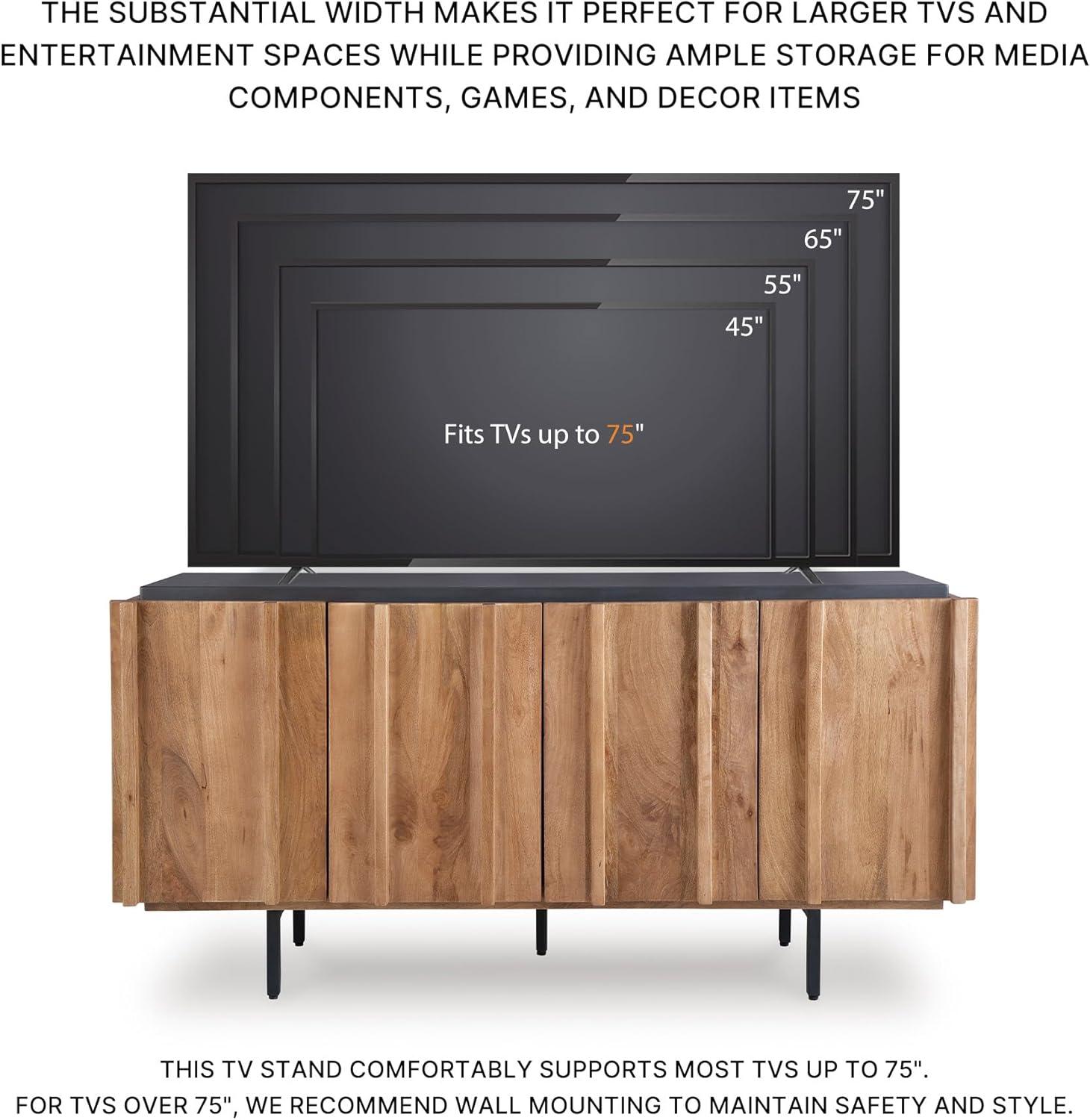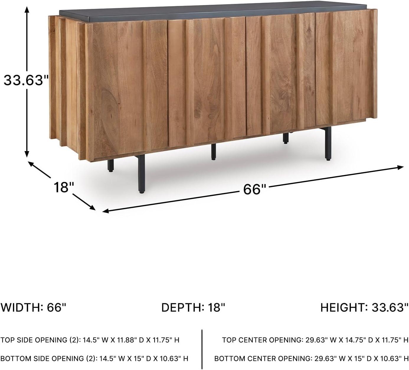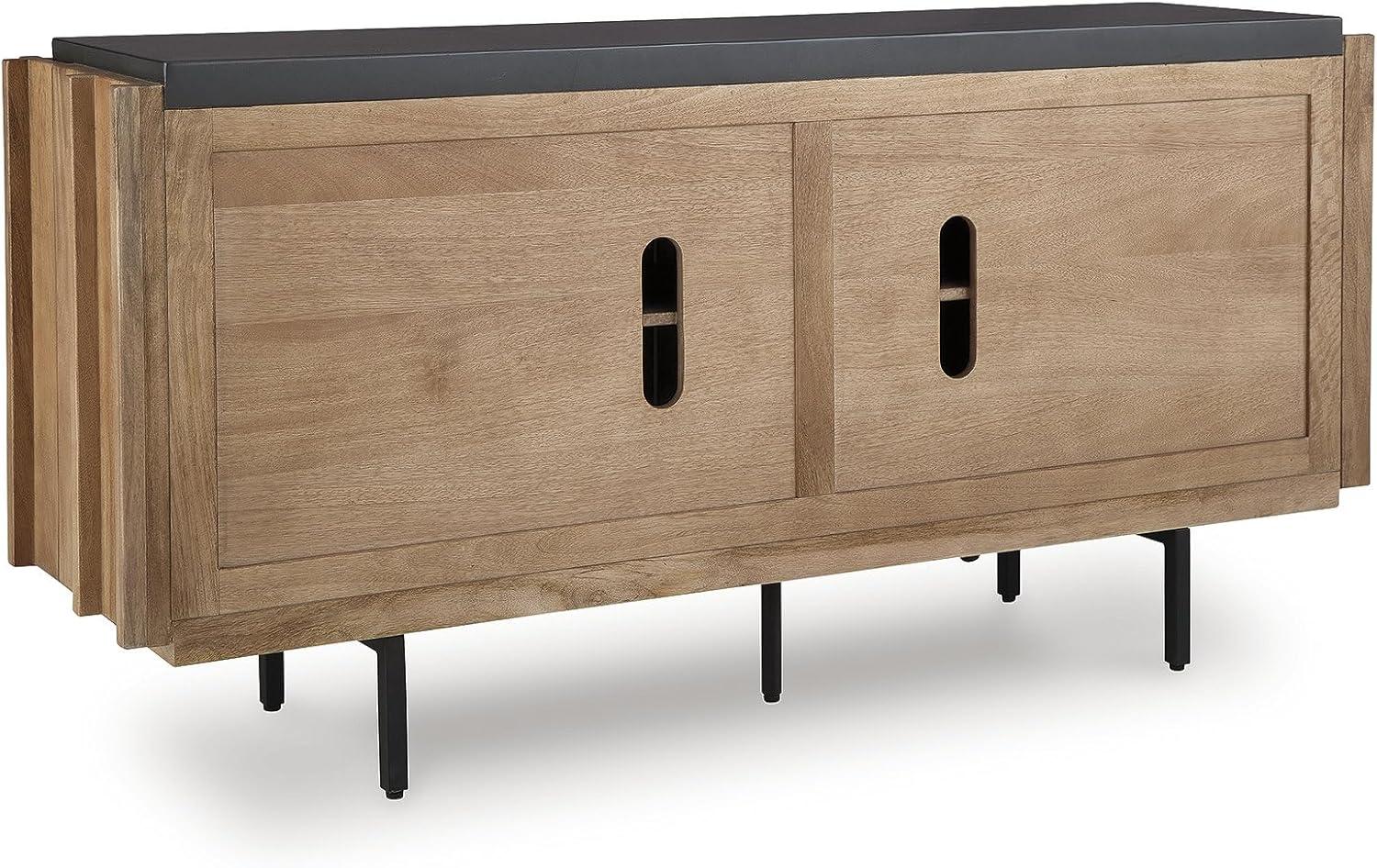 QUALITY MADE: Solid mango wood doors, sides & interior. Back made with mango veneer & engineered wood substrate. Light brown finish & charcoal gray top. Metal legs with black finish. Includes 4 doors, 3 fixed shelves & cord cut outs
