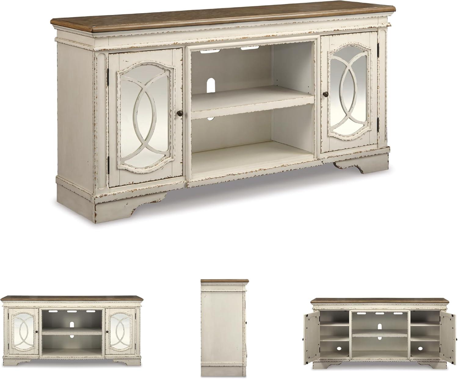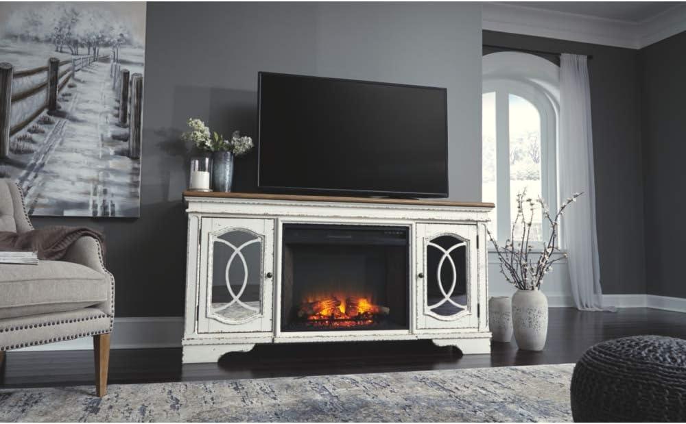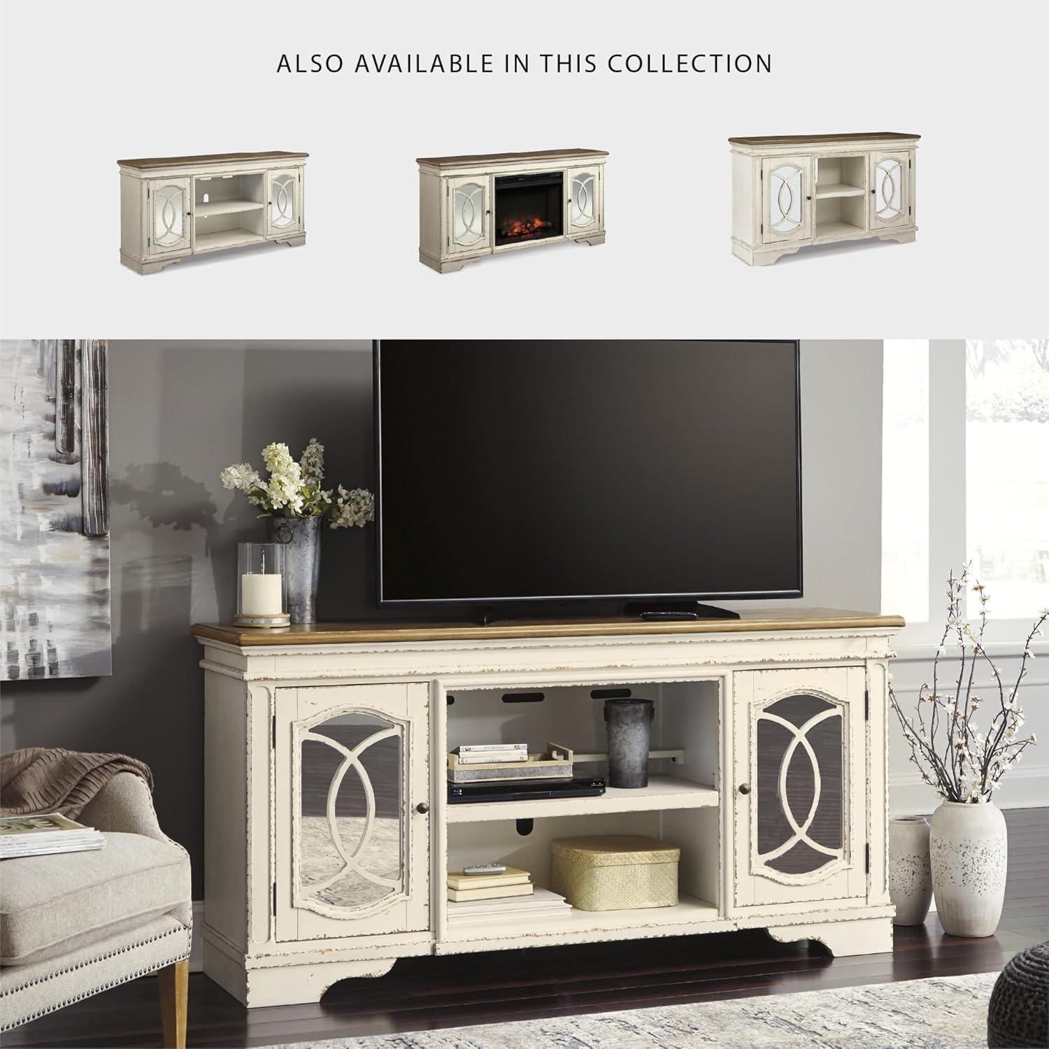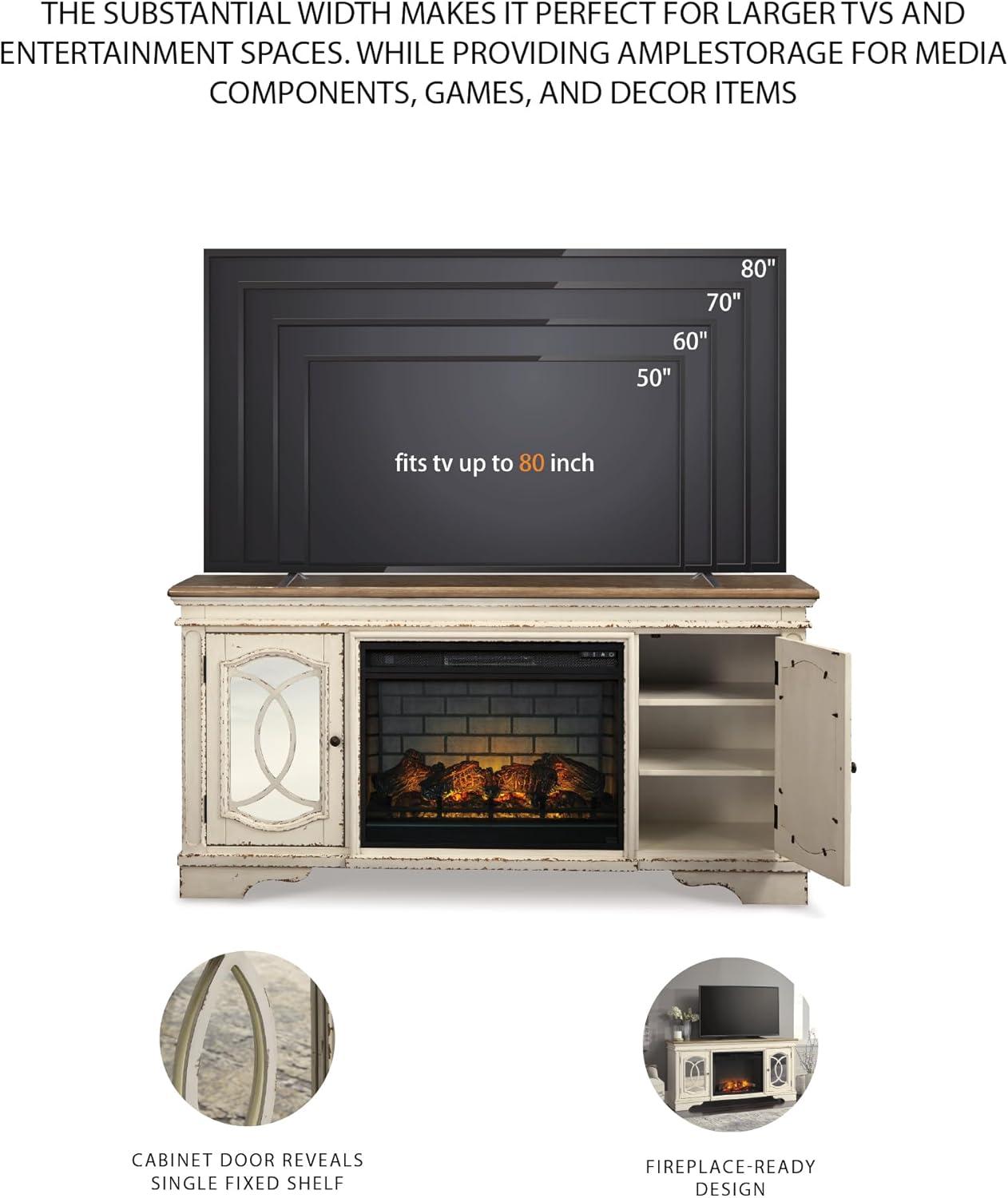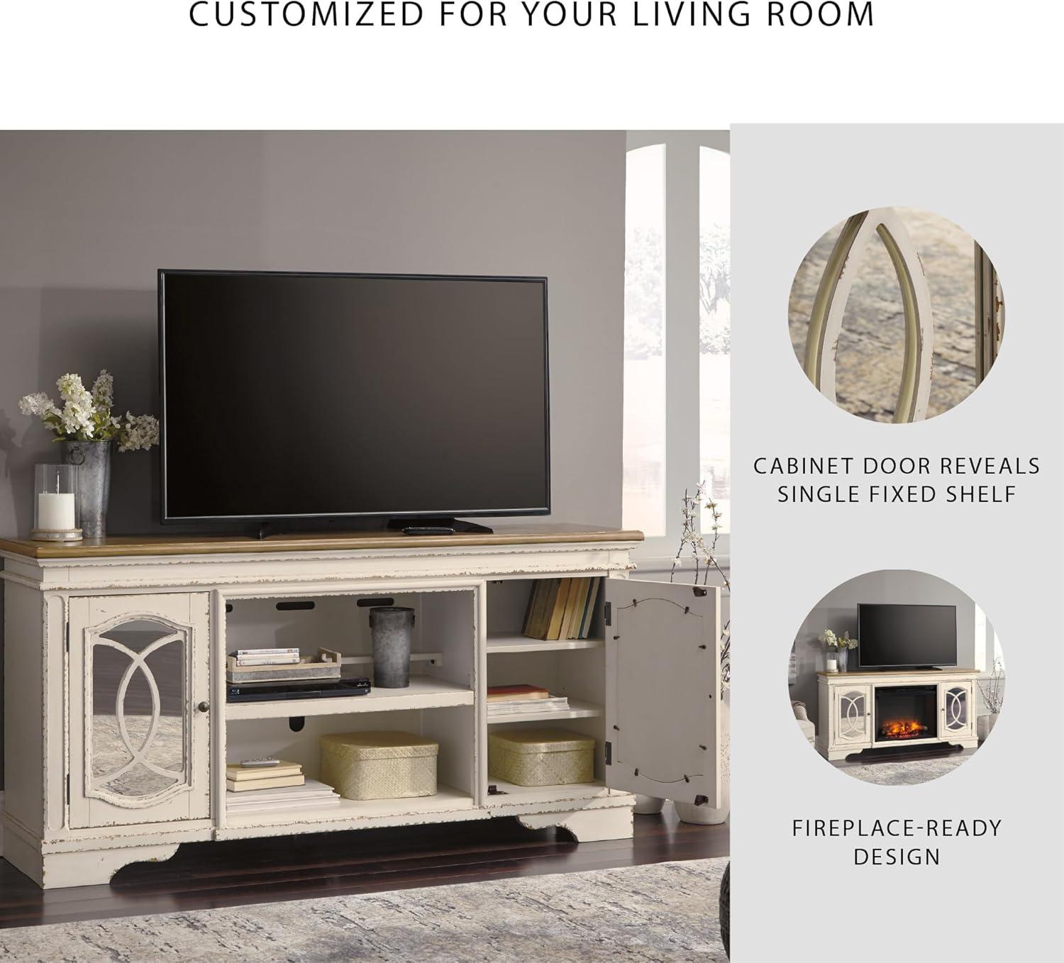Signature Design by Ashley Realyn Vintage Casual TV Stand with Electric Fireplace, Heats Larger Rooms, Bronze Hardware, Wood, 74″ Wide, White & Brown(XL TV Stand)