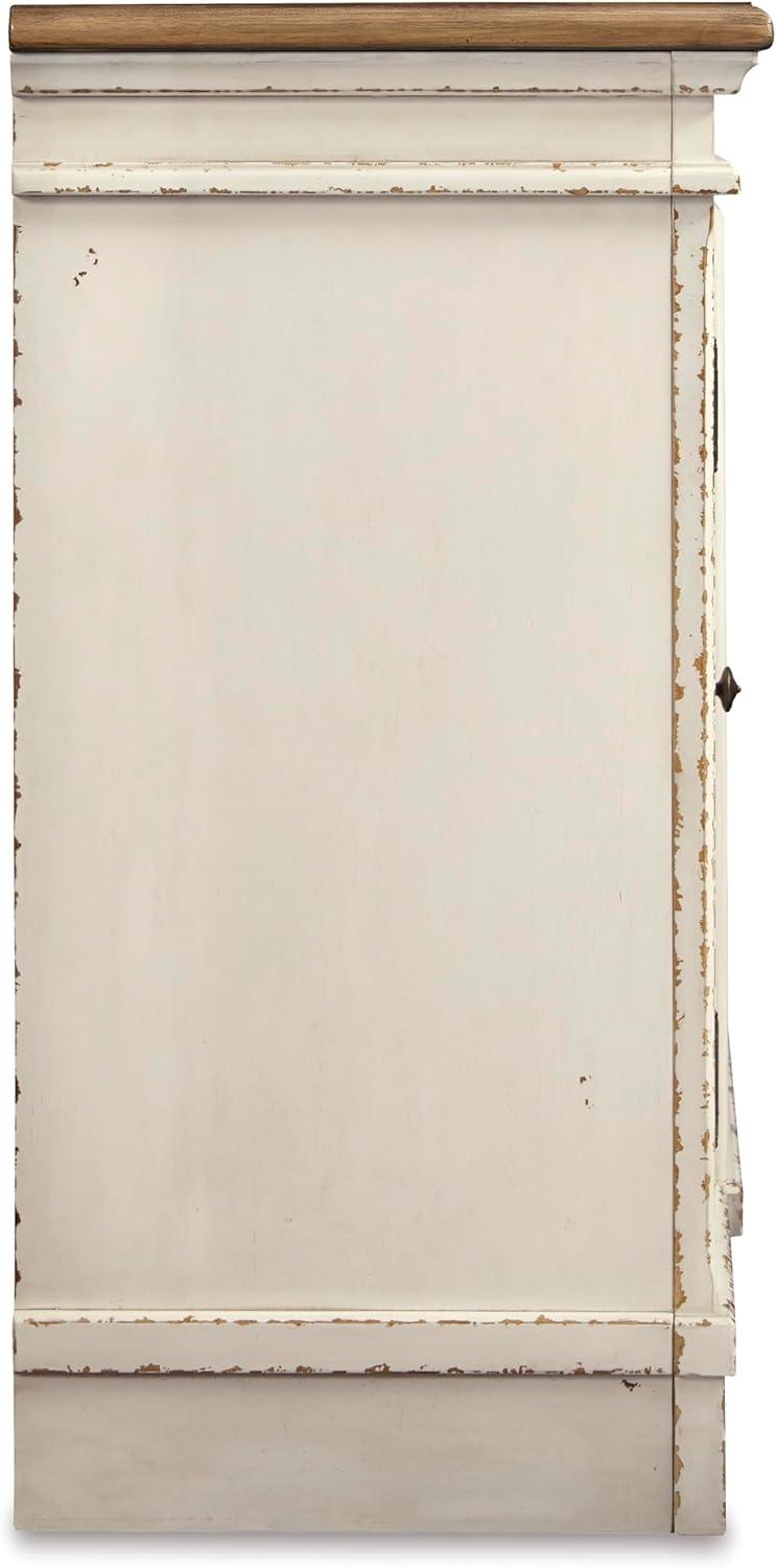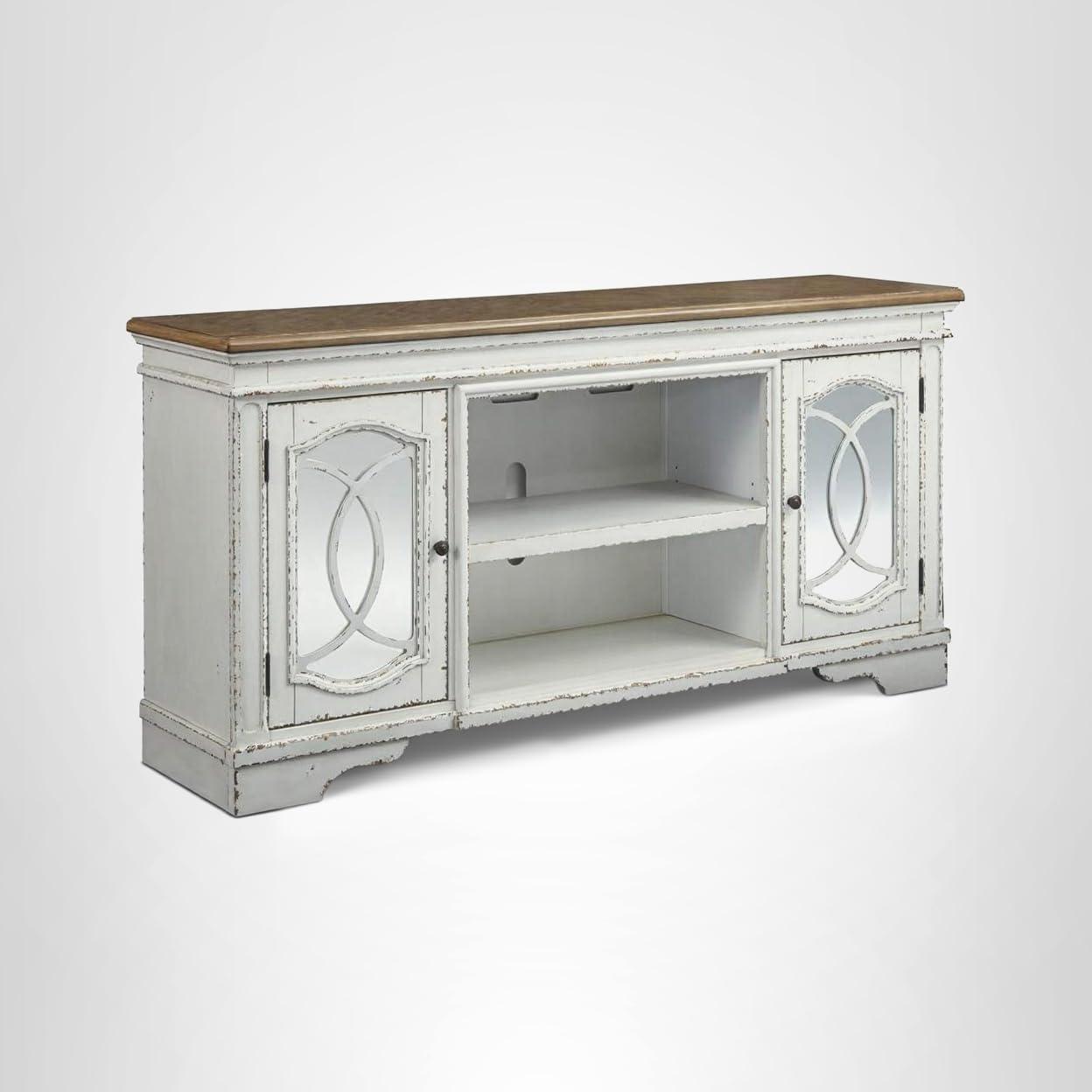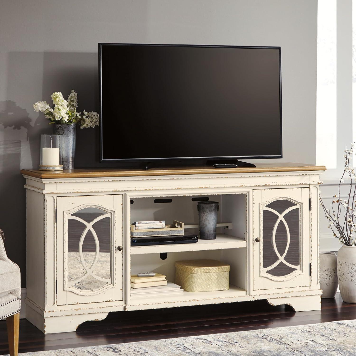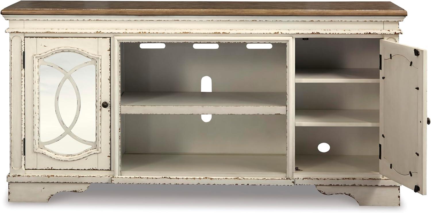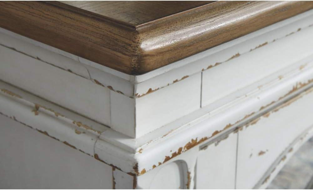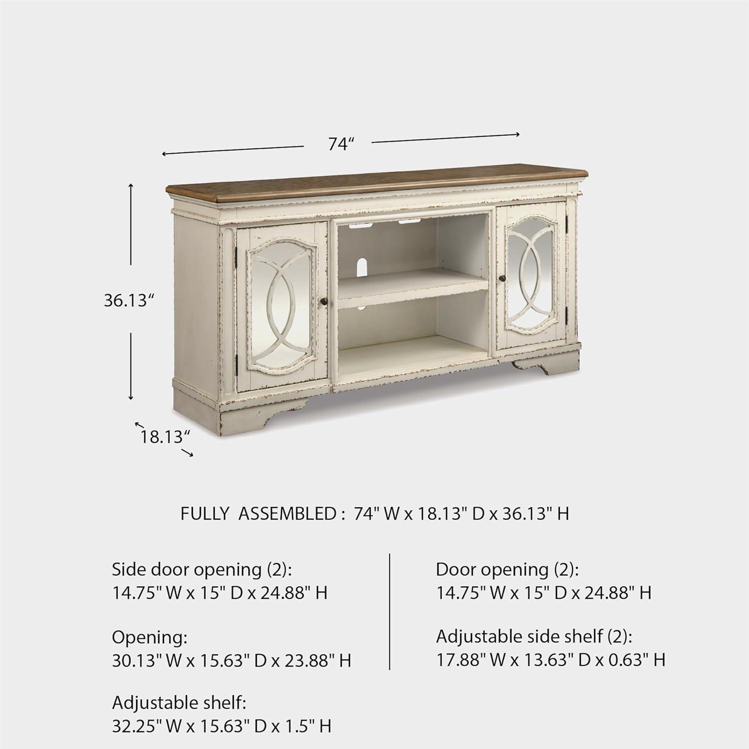 Signature Design by Ashley Realyn Vintage Casual TV Stand with Electric Fireplace, Heats Larger Rooms, Bronze Hardware, Wood, 74″ Wide, White & Brown(XL TV Stand)
