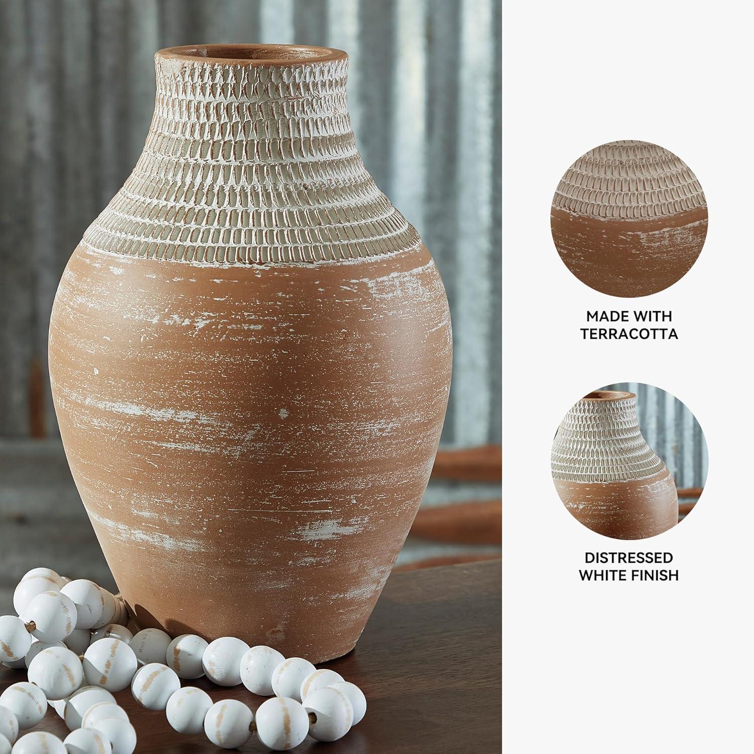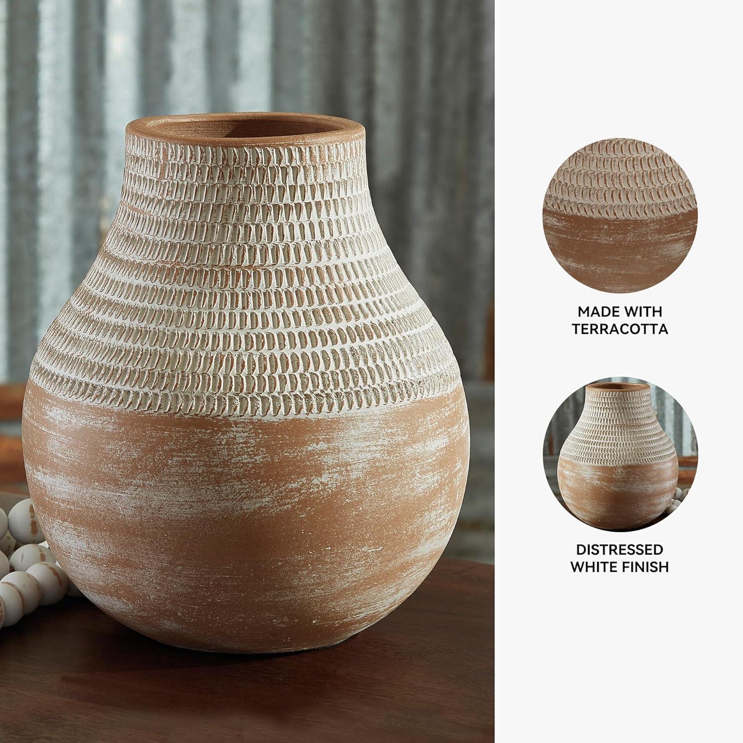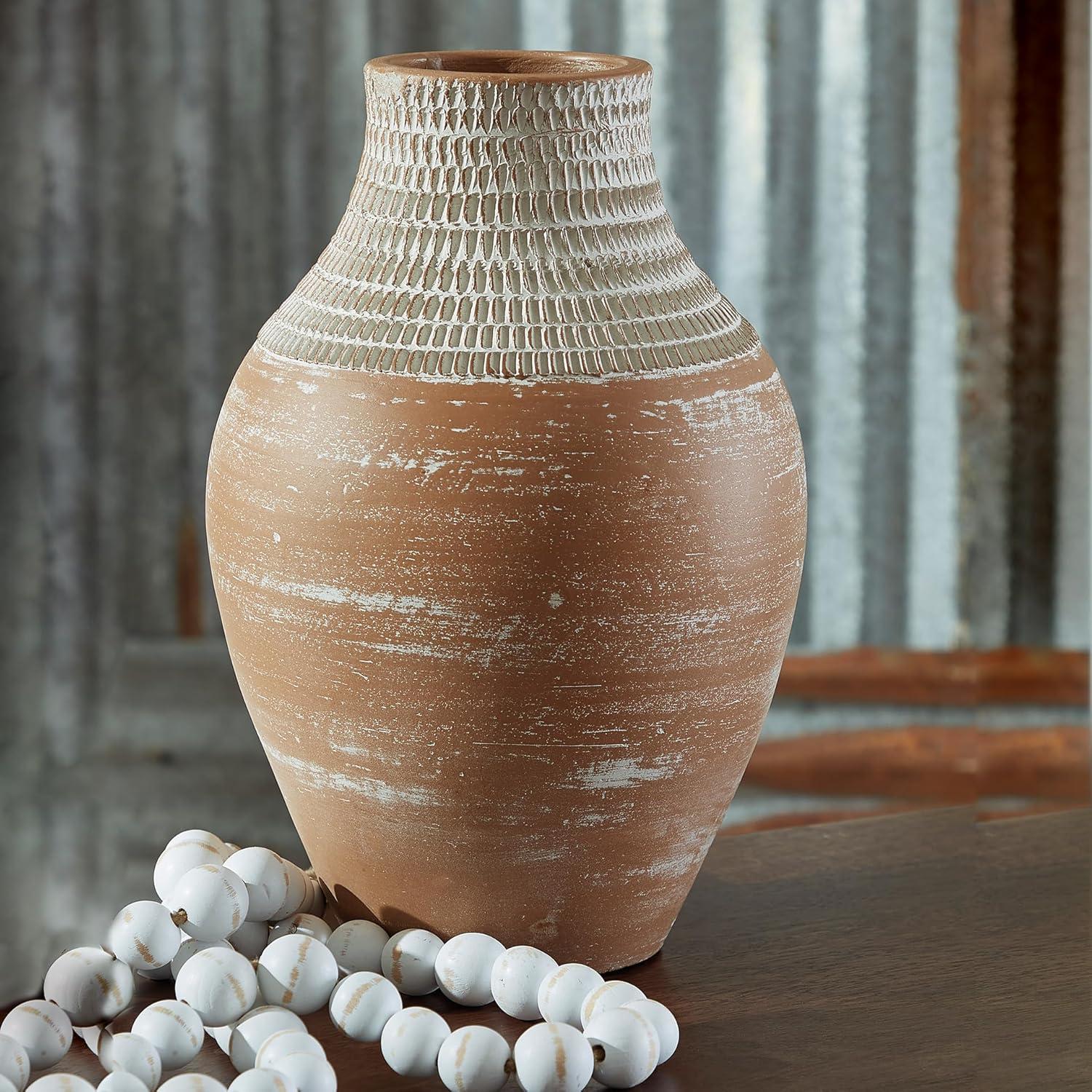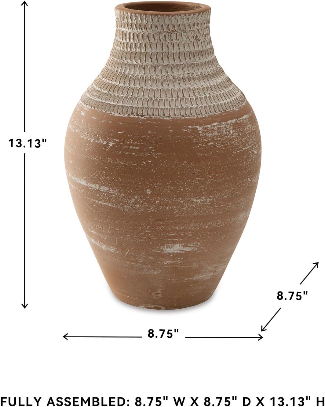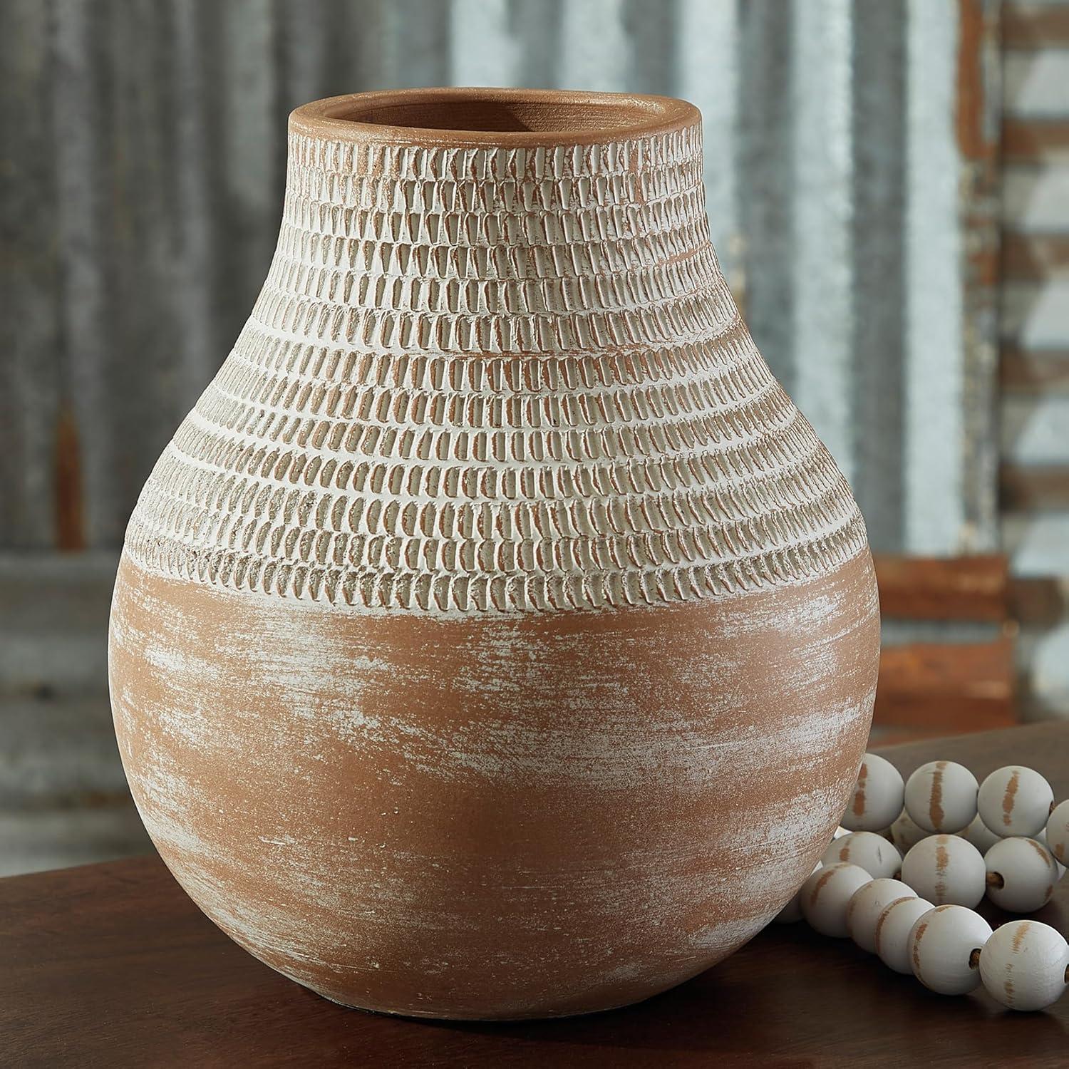 Casual, earthy design comes to life with this terra cotta vase. A distressed white patina is the perfect finish for this piece, giving it an understated presence to stand alone or in pairs on a shelf or display space. Signature Design by Ashley is a registered trademark of Ashley Furniture Industries, Inc.