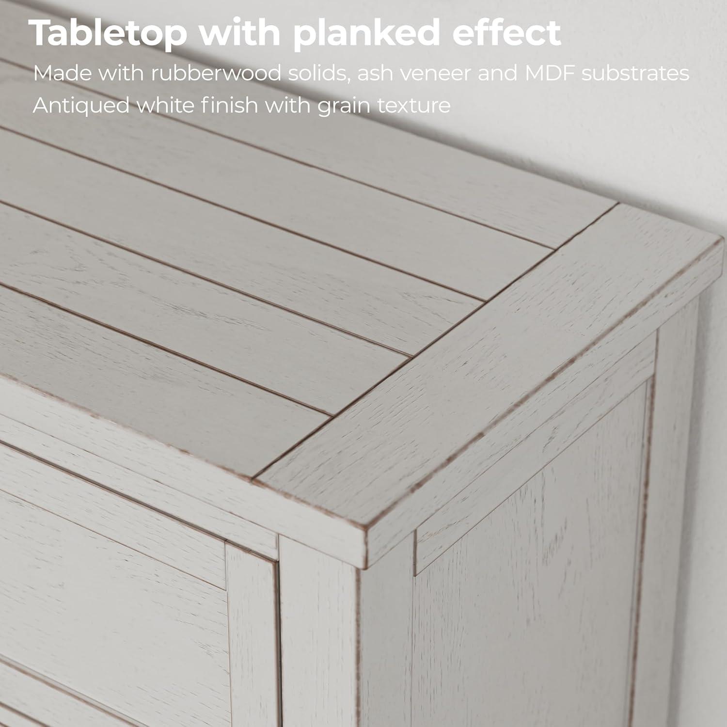 CASUAL FLAIR: With an antiqued white finish and a planked effect on the top & cabinet doors, farmhouse-style storage has never been so fashionable. It makes a great serving station, bar or buffet