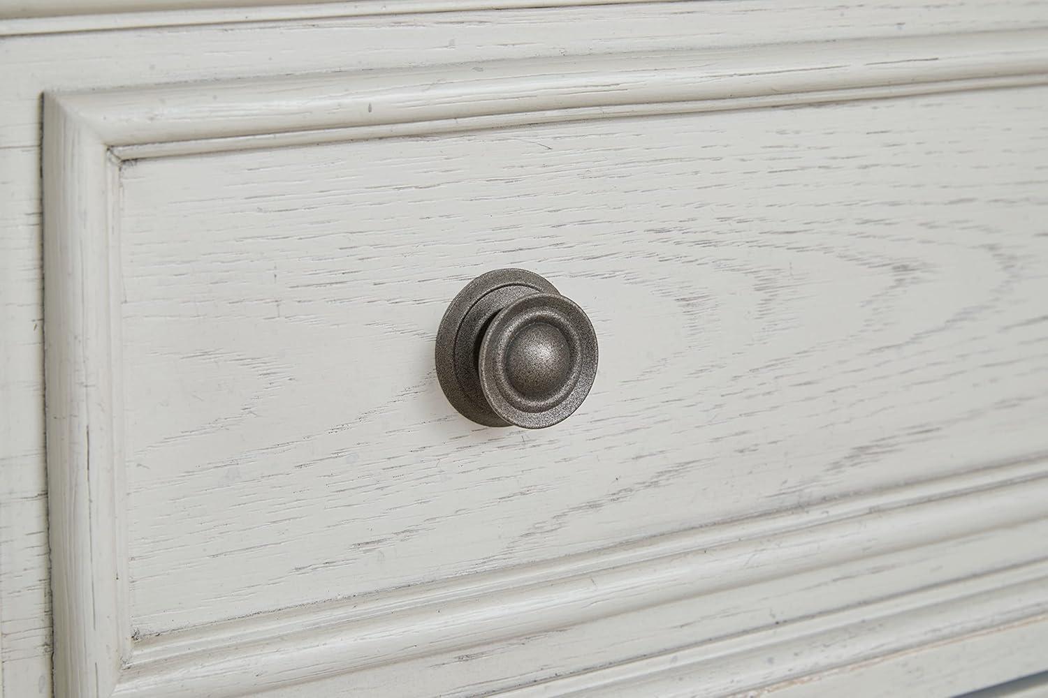 Elegant, timeless furnishings take your bedroom to the next level. Nothing does that better than this dresser with mirror. The antiqued white finish with a wonderful grain texture radiates sophistication, while the dark bronze-tone hardware adds an ornate touch. A hidden pull-out tray behind the top middle drawer puts your small valuables out of sight. Felt-finished top drawers round out the piece for the ultimate tasteful bedroom.