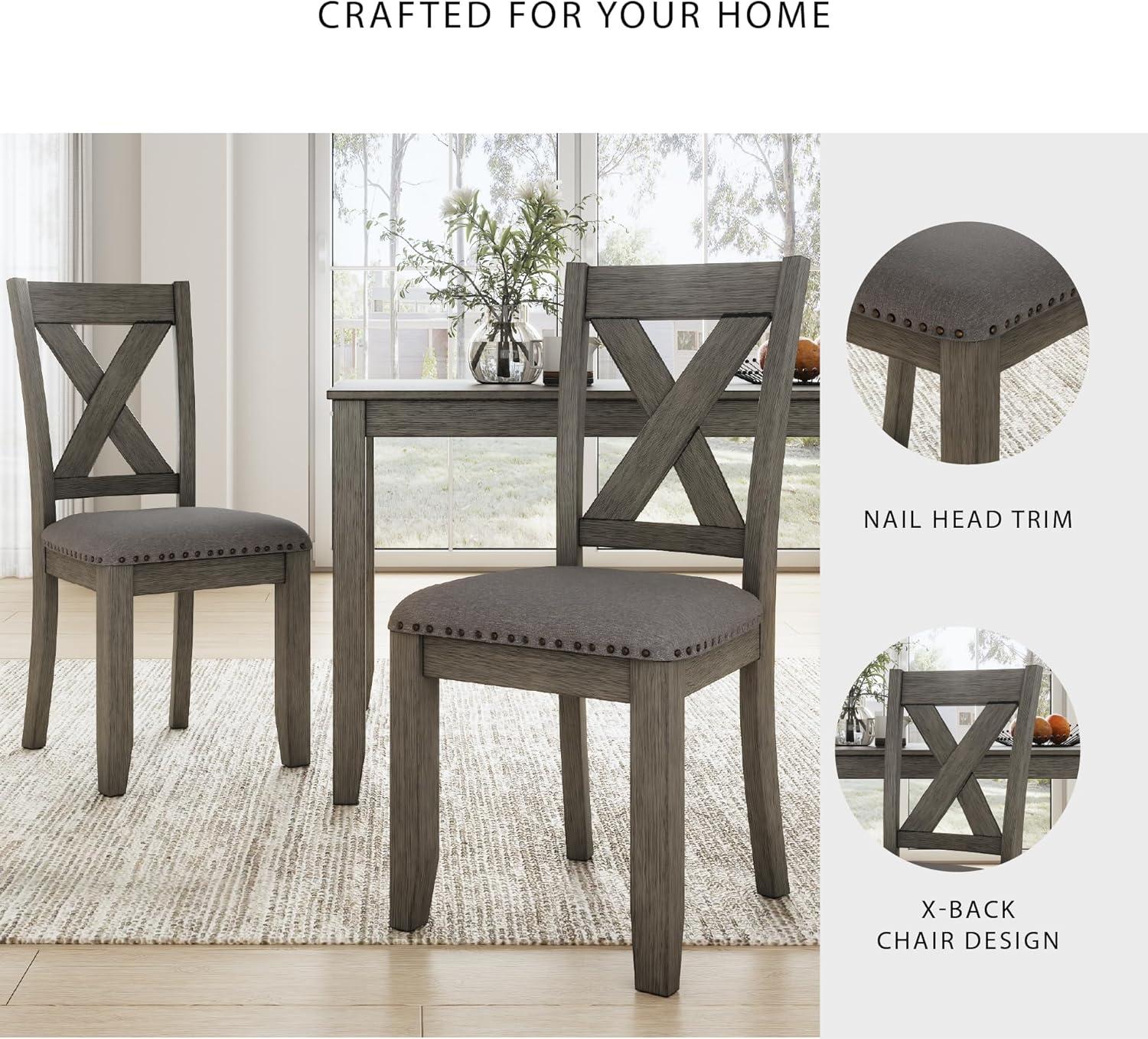 X-BACK CHAIR DESIGN: Mastering modern farmhouse flair, the clean-lined design sports seats upholstered in neutral polyester and punctuated by nailhead trim
