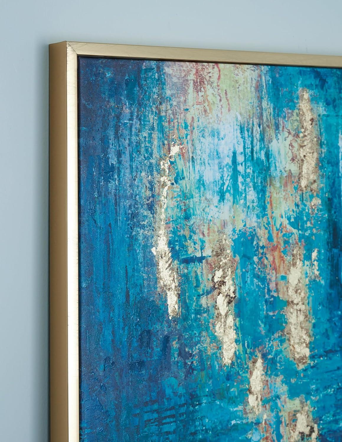 ABSTRACT WALL ART: Its cool tones blend expertly with shades of rust and gold for added depth and dimension. A goldtone leaf embellishment lends a dash of glam character