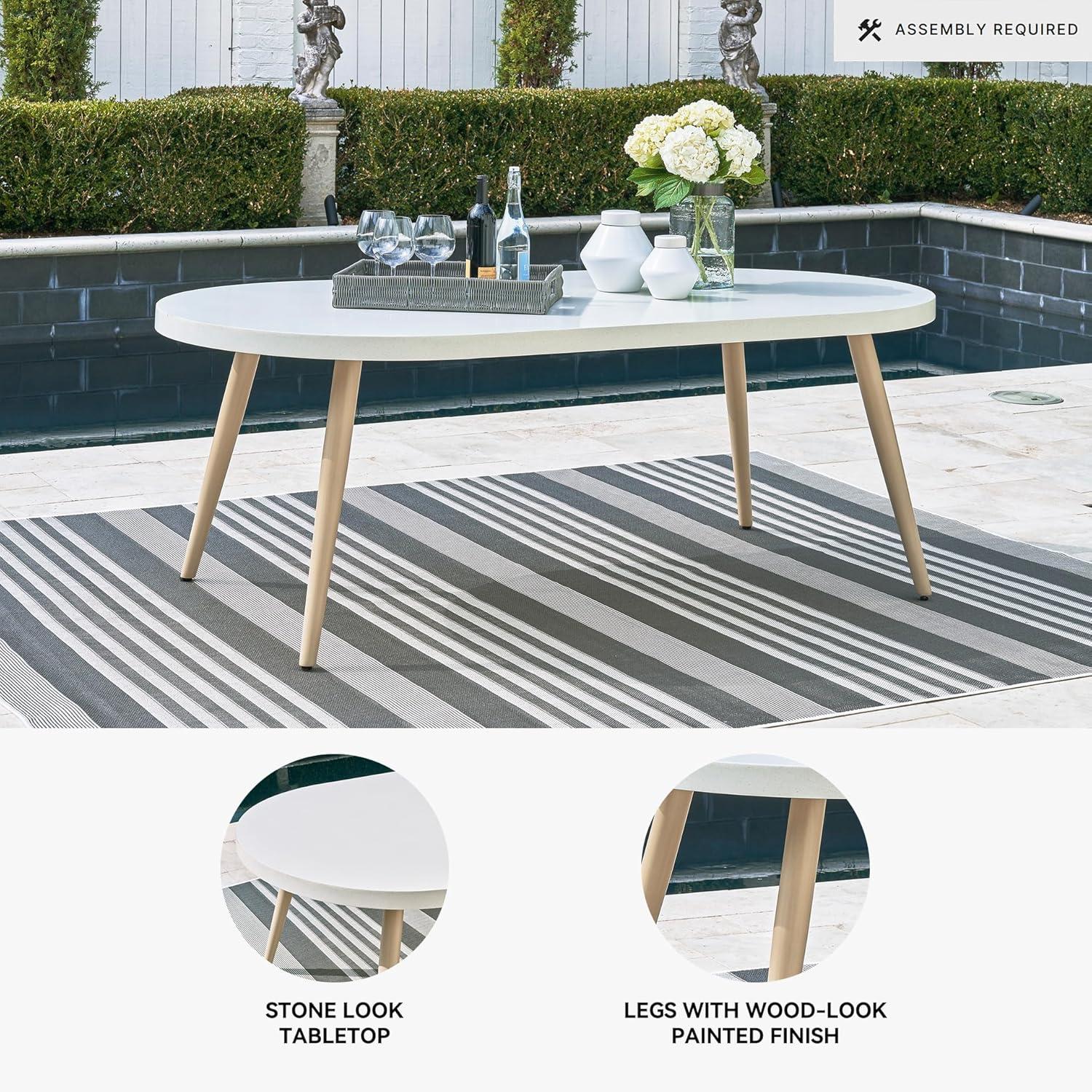 DURABLE DESIGN: Made with aluminum. Stone-look top. Legs with wood-look painted finish. Stainless steel hardware