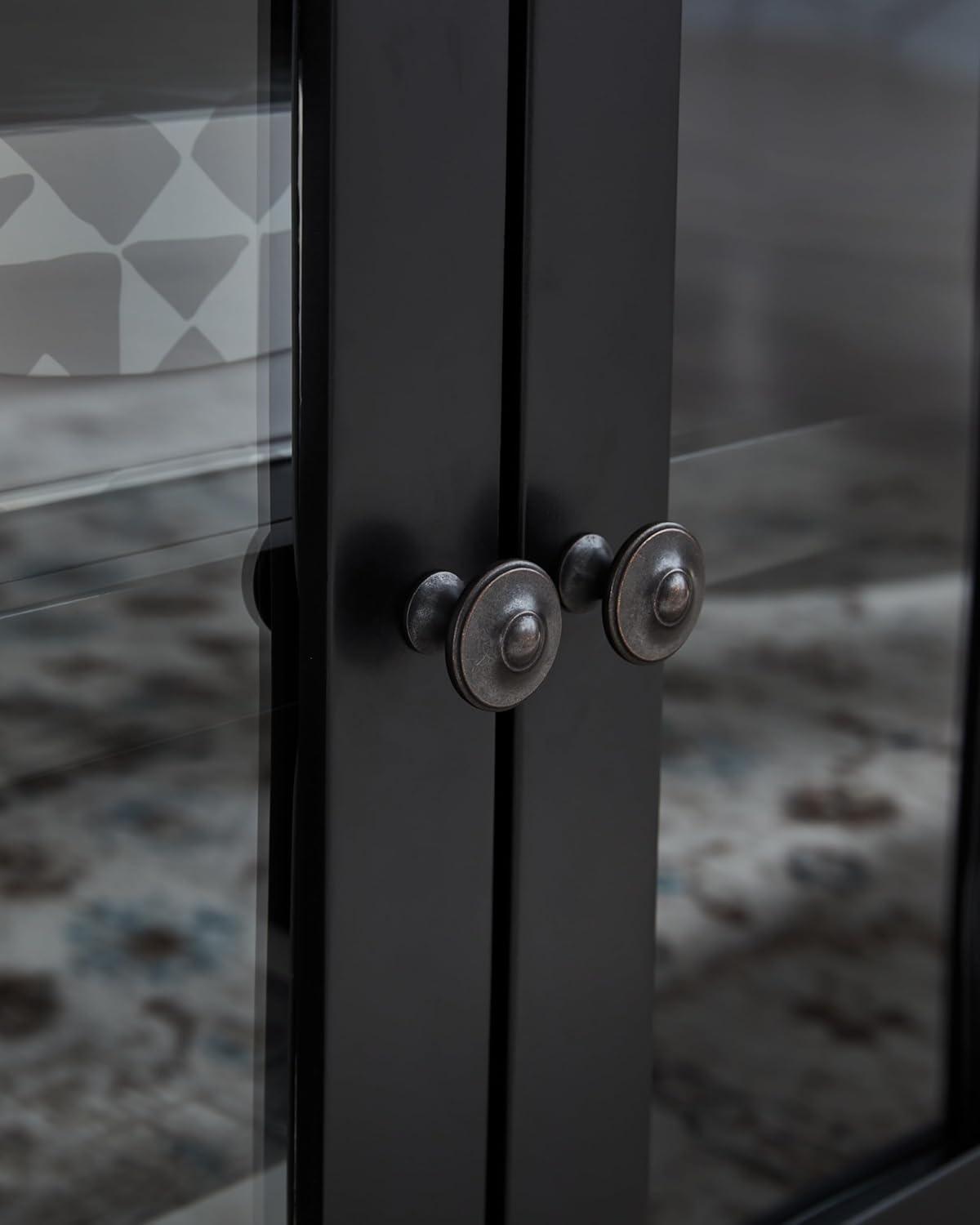 QUALITY CRAFTED: Made with hardwood solids, hickory wood veneer and MDF substrate. Light brown wood-tone finish. Dark bronze-tone drawer pulls. 2 cabinets, each with an adjustable shelf. 4 smooth-gliding drawers. Cutouts for wire management
