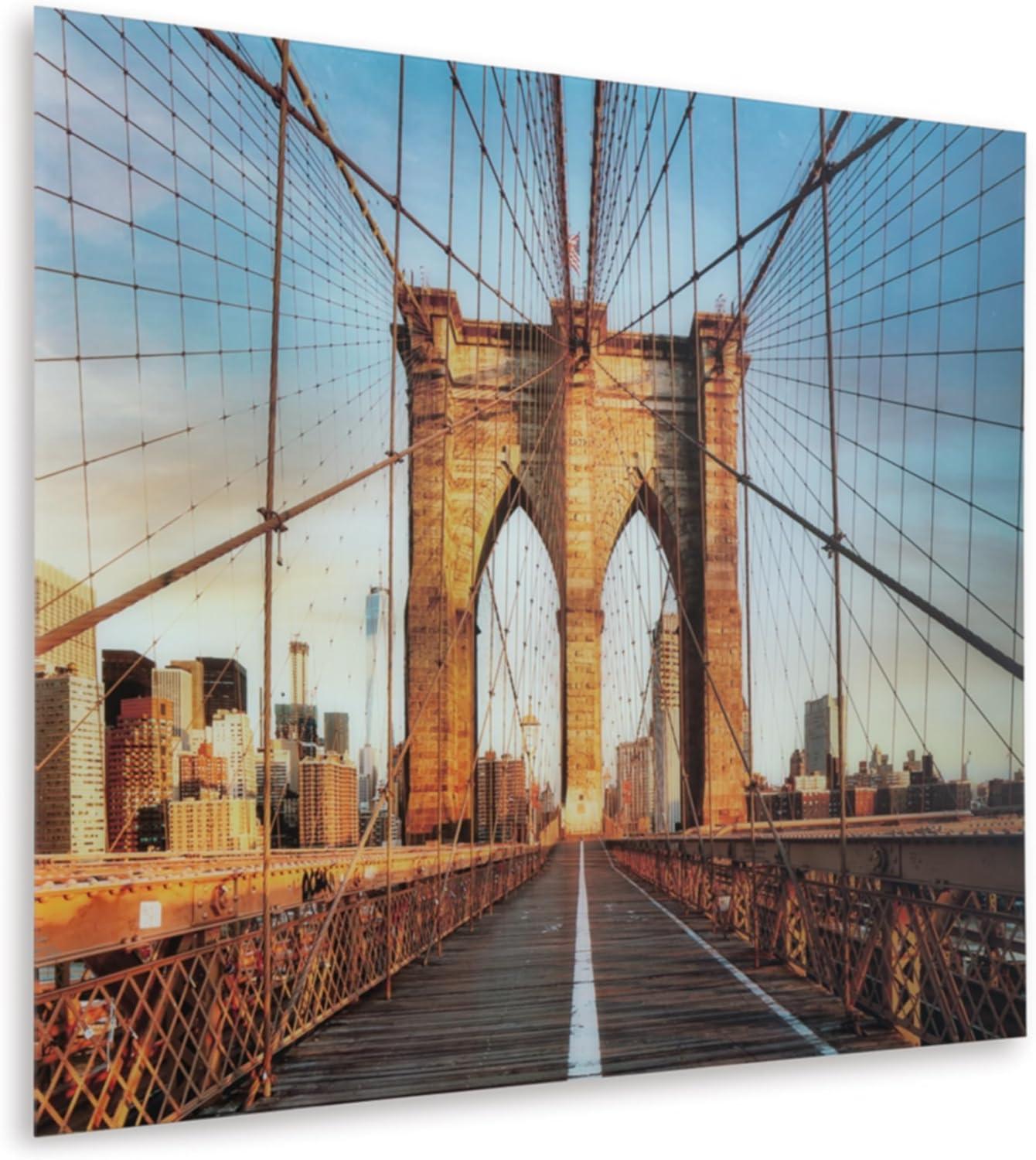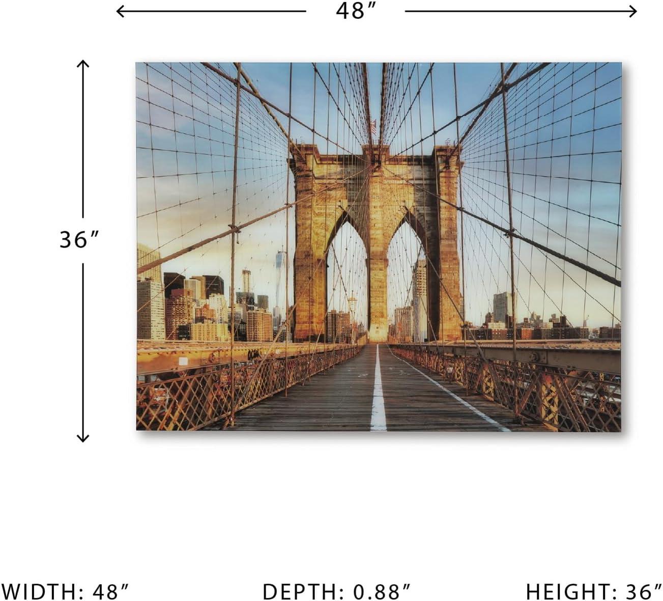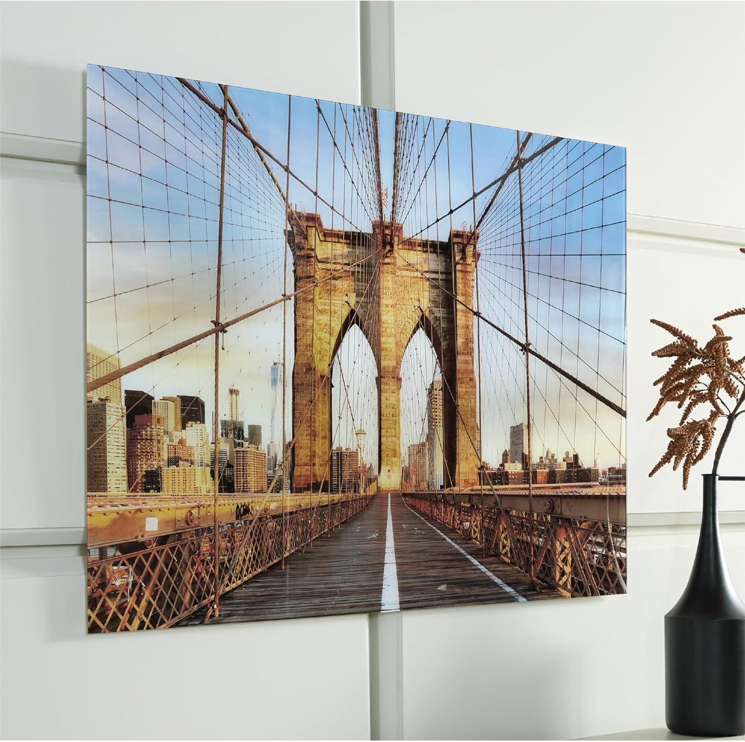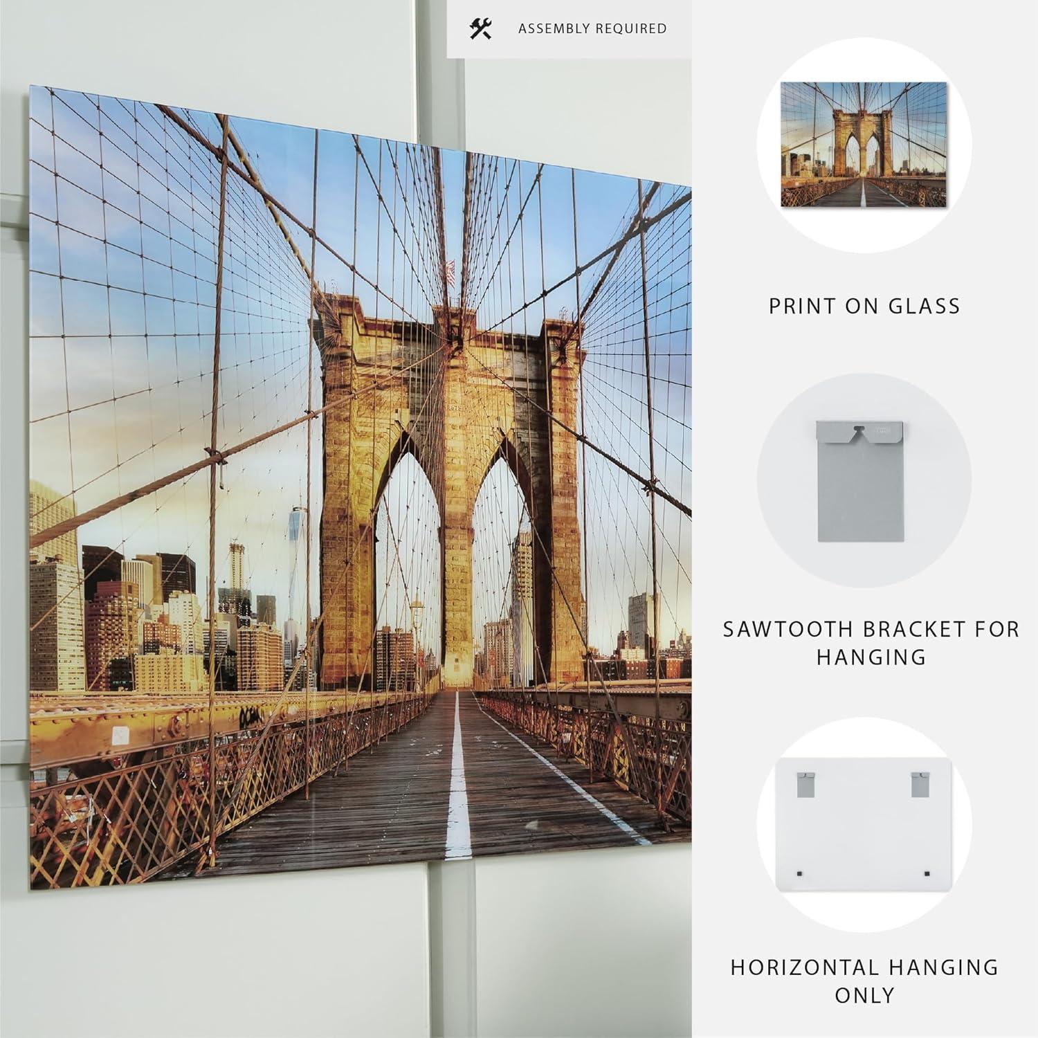 WALL ART: Bring a touch of iconic architecture to your home with this wall art. The print on glass showcases the Brooklyn Bridge's arches & intricate cables, set against the backdrop of a city skyline