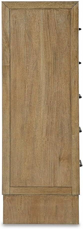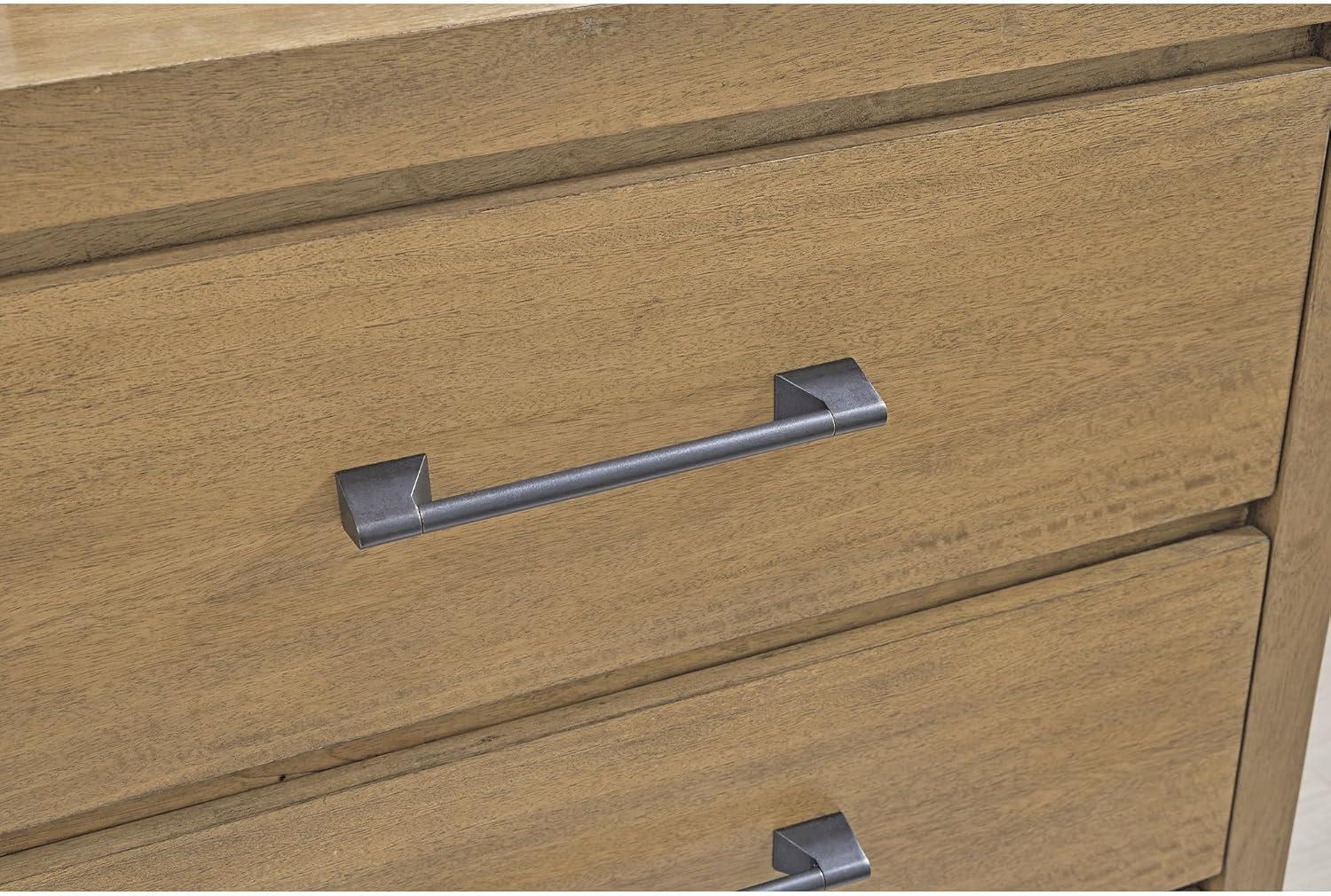HANDSOMELY CRAFTED: Made with hardwood solids, mango wood veneer and MDF substrate. Light wood-tone finish. Darkened bronze-tone pulls. 5 drawers with fully finished interior (top drawers felt lined)
