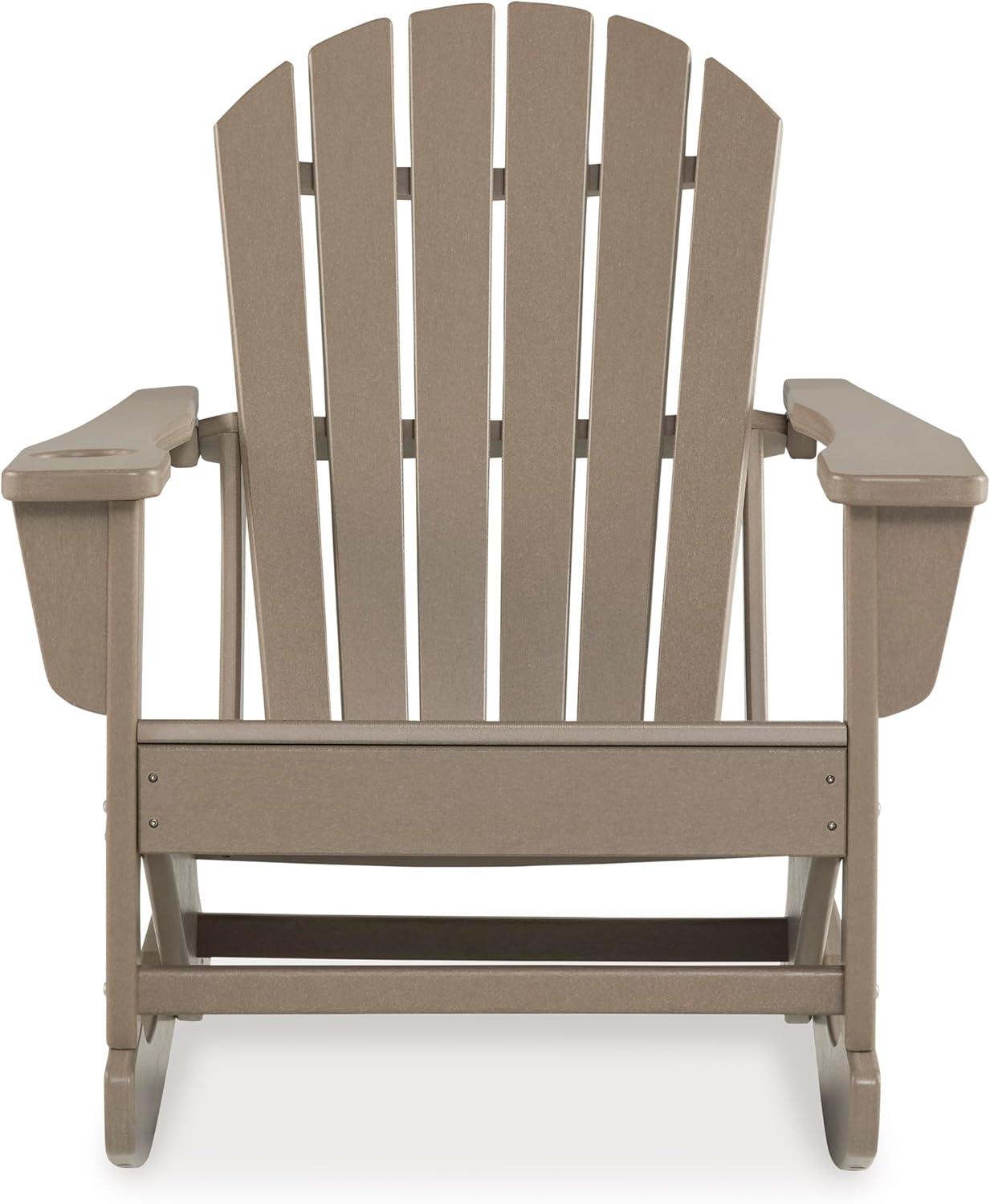 Add cottage-quaint charm to your outdoor oasis with this rocking chair in a driftwood finish. Made of MEGA TUFF™ high-density polyethylene material, it’s sure to weather the seasons beautifully. Designed to shed rainwater, the chair’s slatted styling and classic Adirondack design provide exceptional form and function. Signature Design by Ashley is a registered trademark of Ashley Furniture Industries, Inc.
