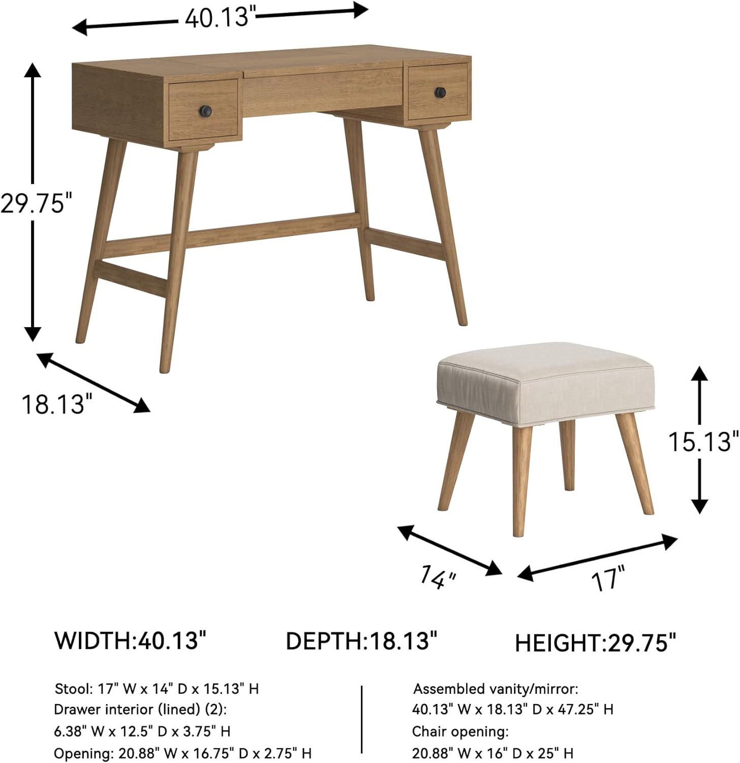 VANITY & STOOL: Constructed of wood and engineered wood, this piece has a mid-century inspired design that includes a center storage bin with flip-up mirror and stay-arm hinges. Includes vanity and stool