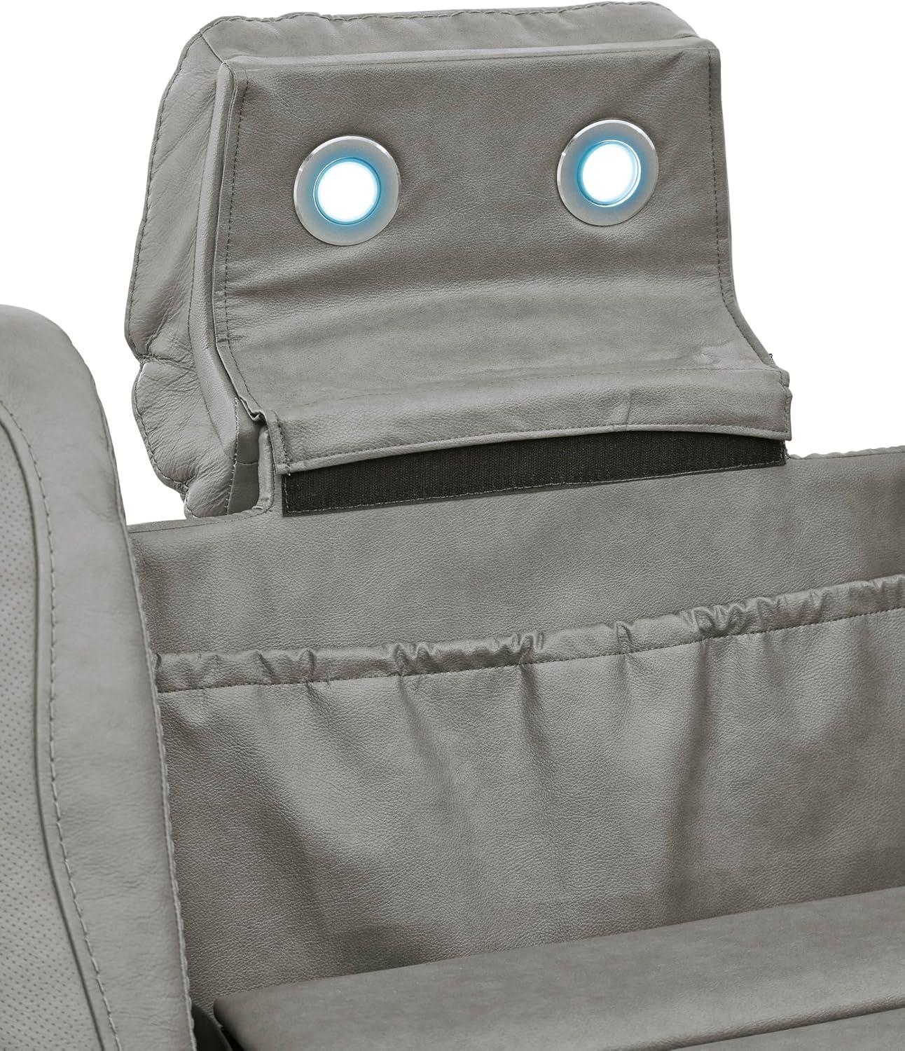 Reserved for him and made for her, this power reclining sofa in gray delivers all the comfort and style you could ask for. Inspired by sports car interiors, the seating area is covered in real leather for your pleasure, with a “perforated automotive” treatment for that much more appeal. Positioned at your fingertips, the advanced one-touch power control puts you in the driver’s seat with everything from an Easy View™ power headrest and power lumbar support, to a USB port and wireless charging for your phone. Talk about fully loaded. The middle seat reveals a pull-down table with dimmable reading lights and cup holders. And with integrated cup holders and hidden storage compartments under the posh, padded armrests, this designer power reclining sofa makes the most of every inch of space.