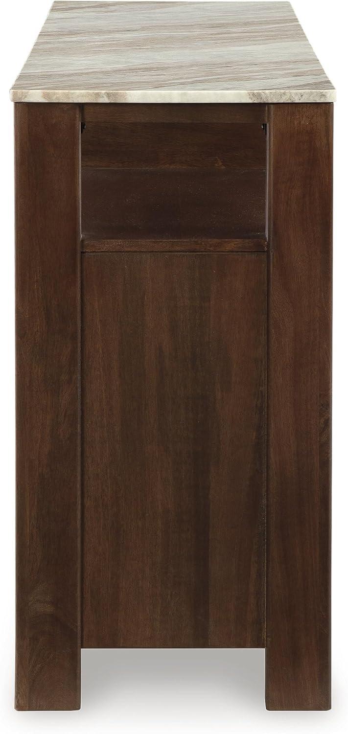 WELL MADE: Crafted with mango wood solids, engineered wood & veneer in a dark brown finish. Taupe, white & gray marble top. Doors with rounded wood bar pulls. Includes 4 sliding doors & 2 shelves