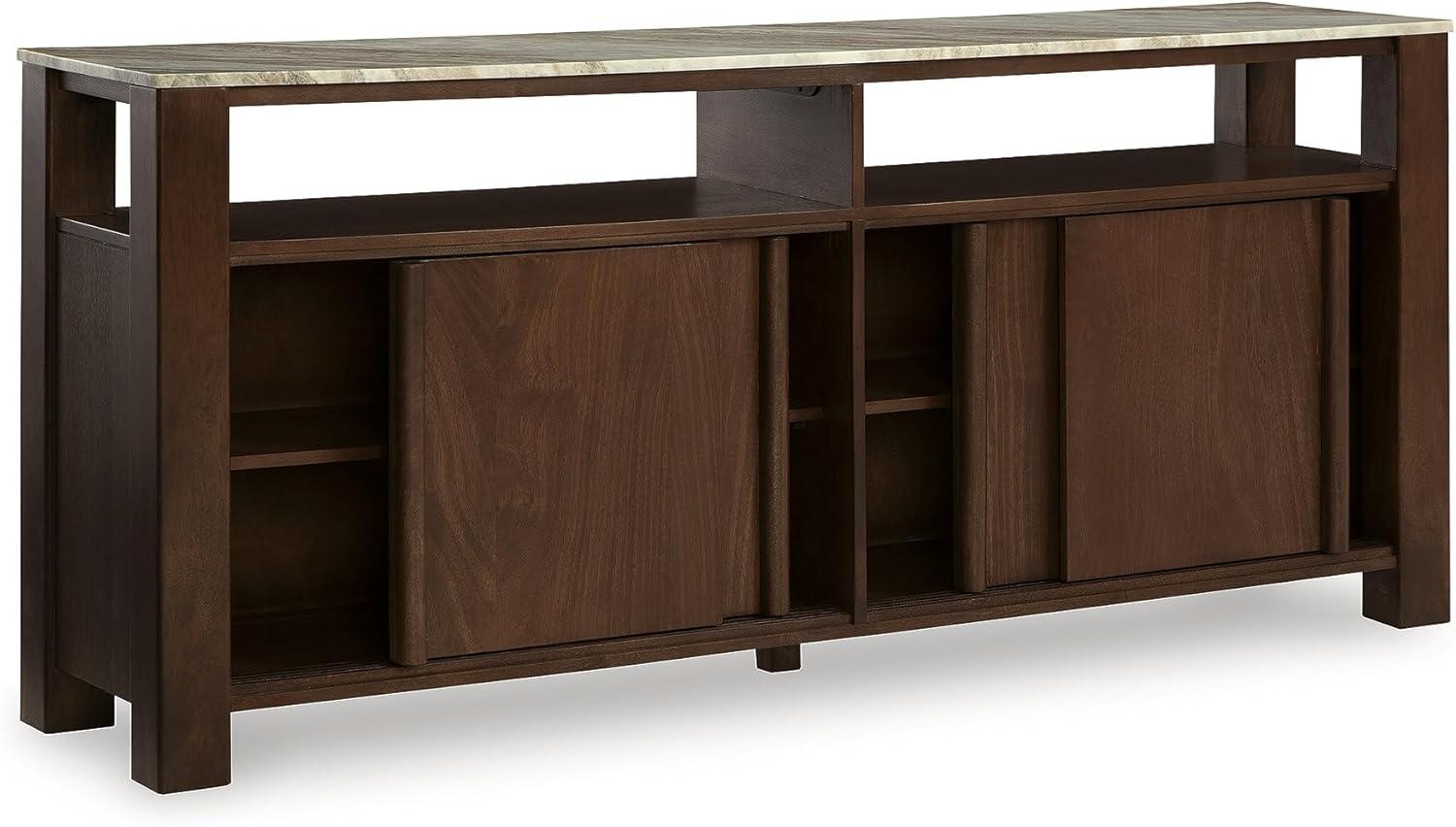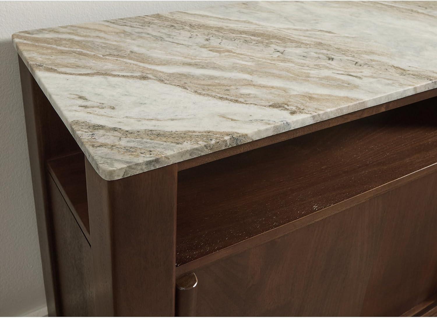 High style and functionality? Check and check. This accent cabinet's taupe, white and gray marble top and contrasting dark brown finish bring the wow factor. Sliding doors open to reveal shelves that are perfect for hiding everyday clutter. Whether you use it for storage or as a TV stand, this showpiece creates contemporary elegance with ease.